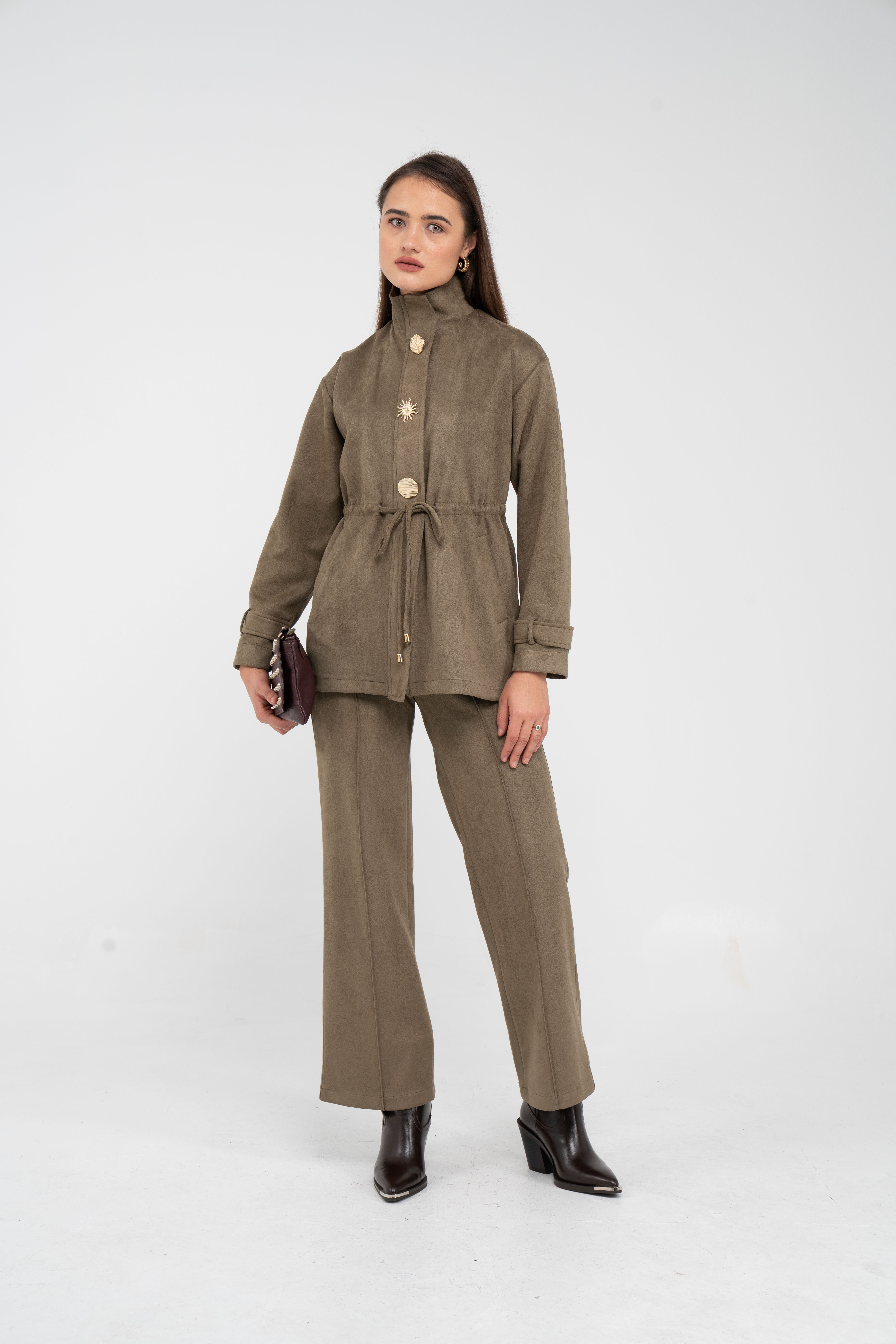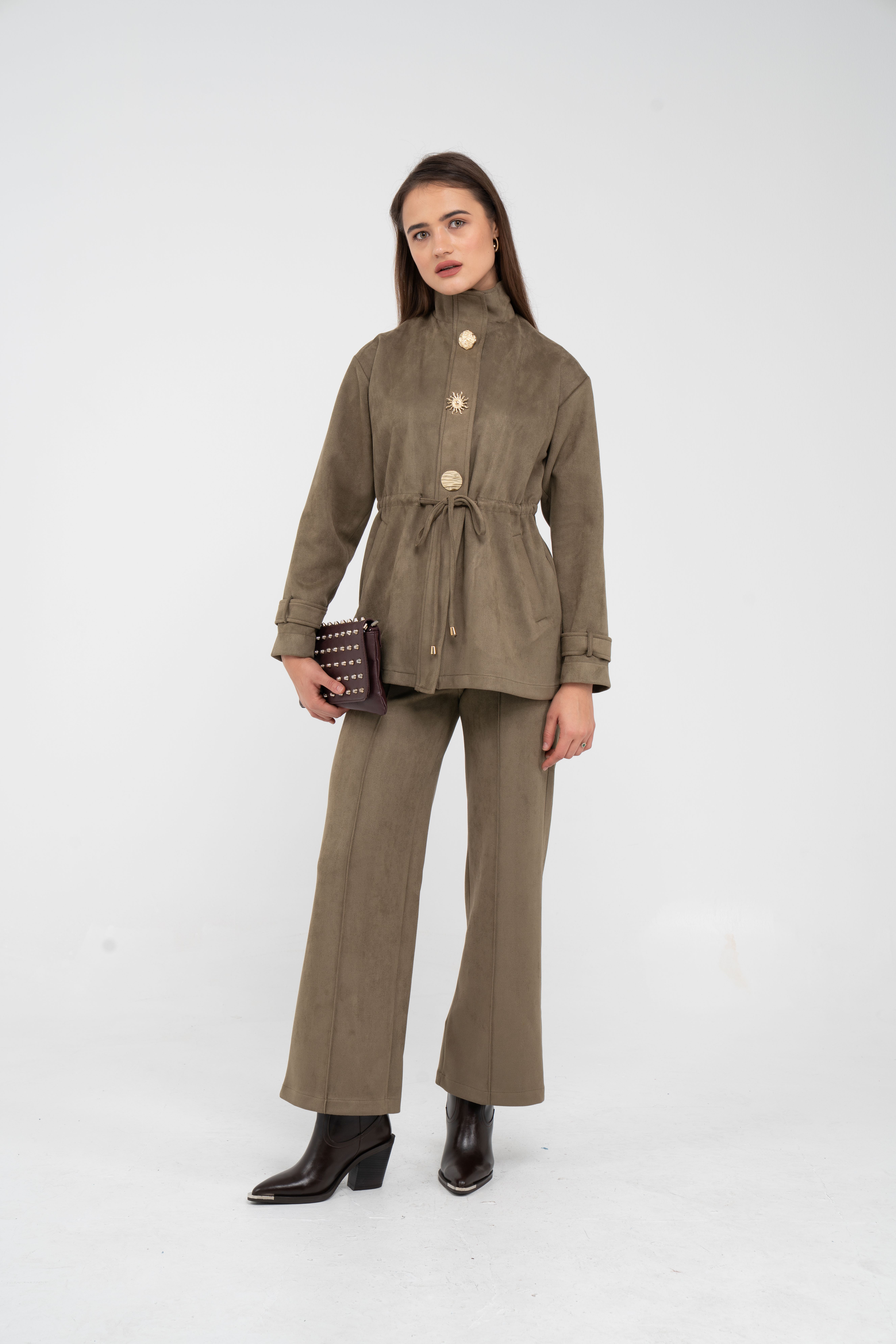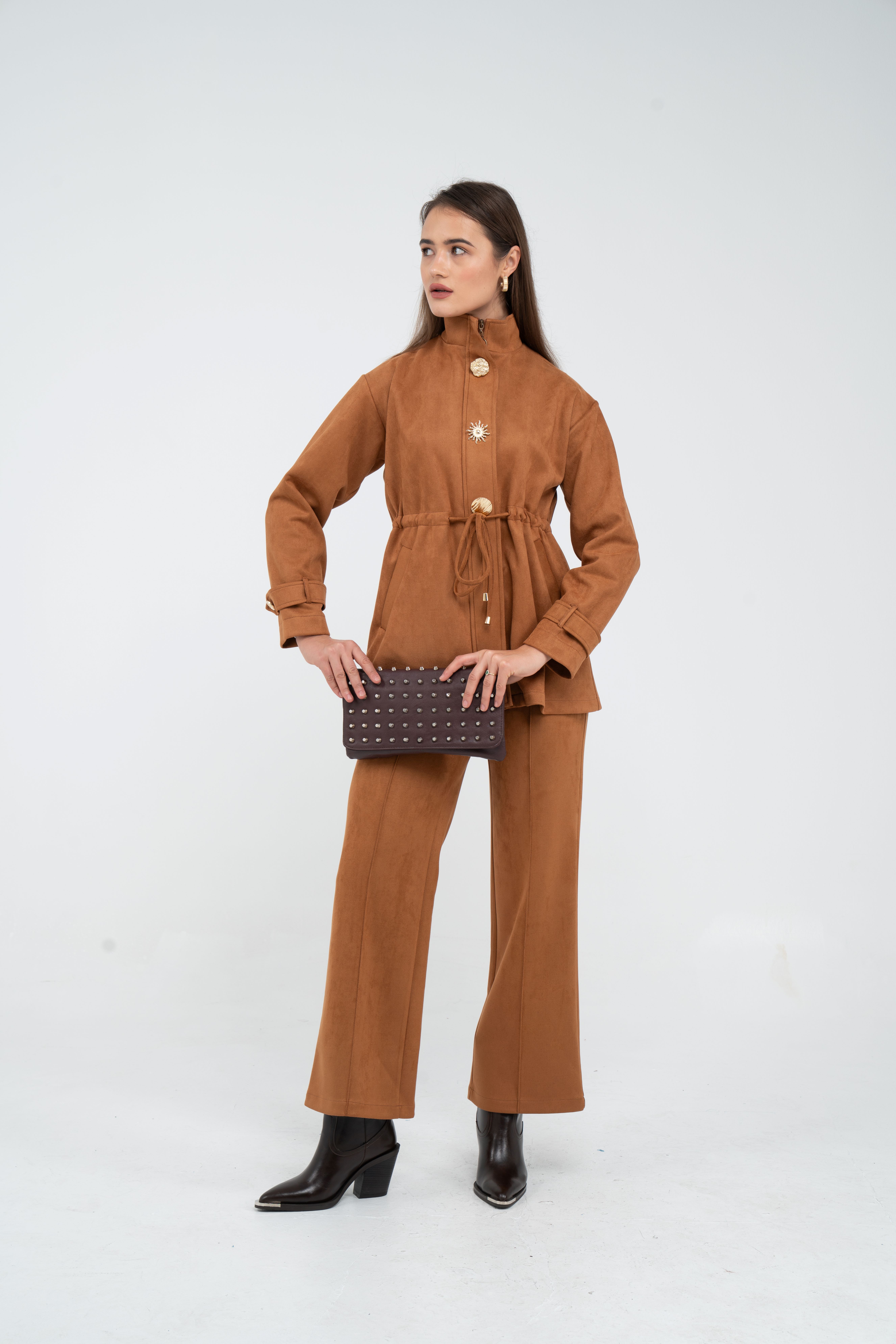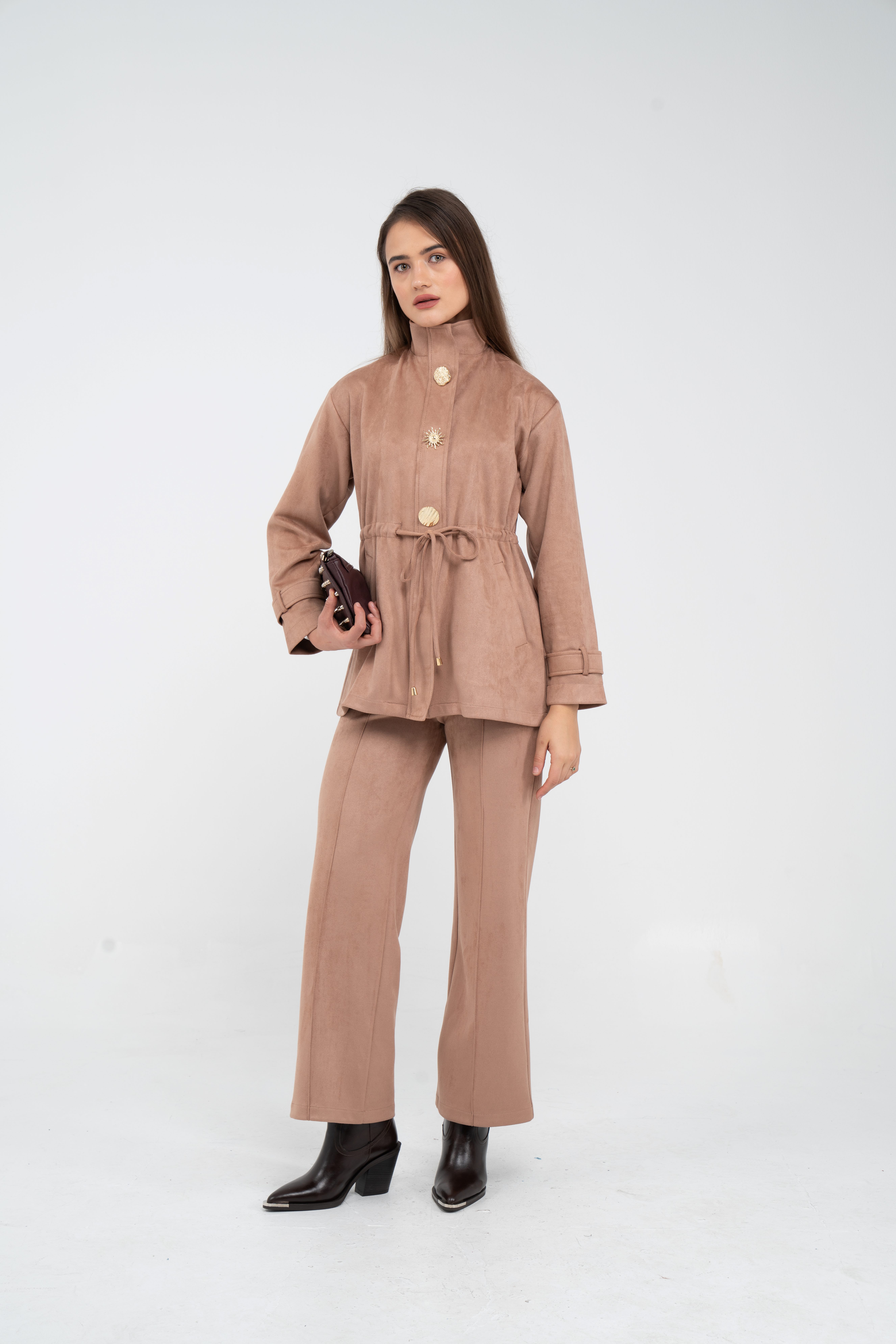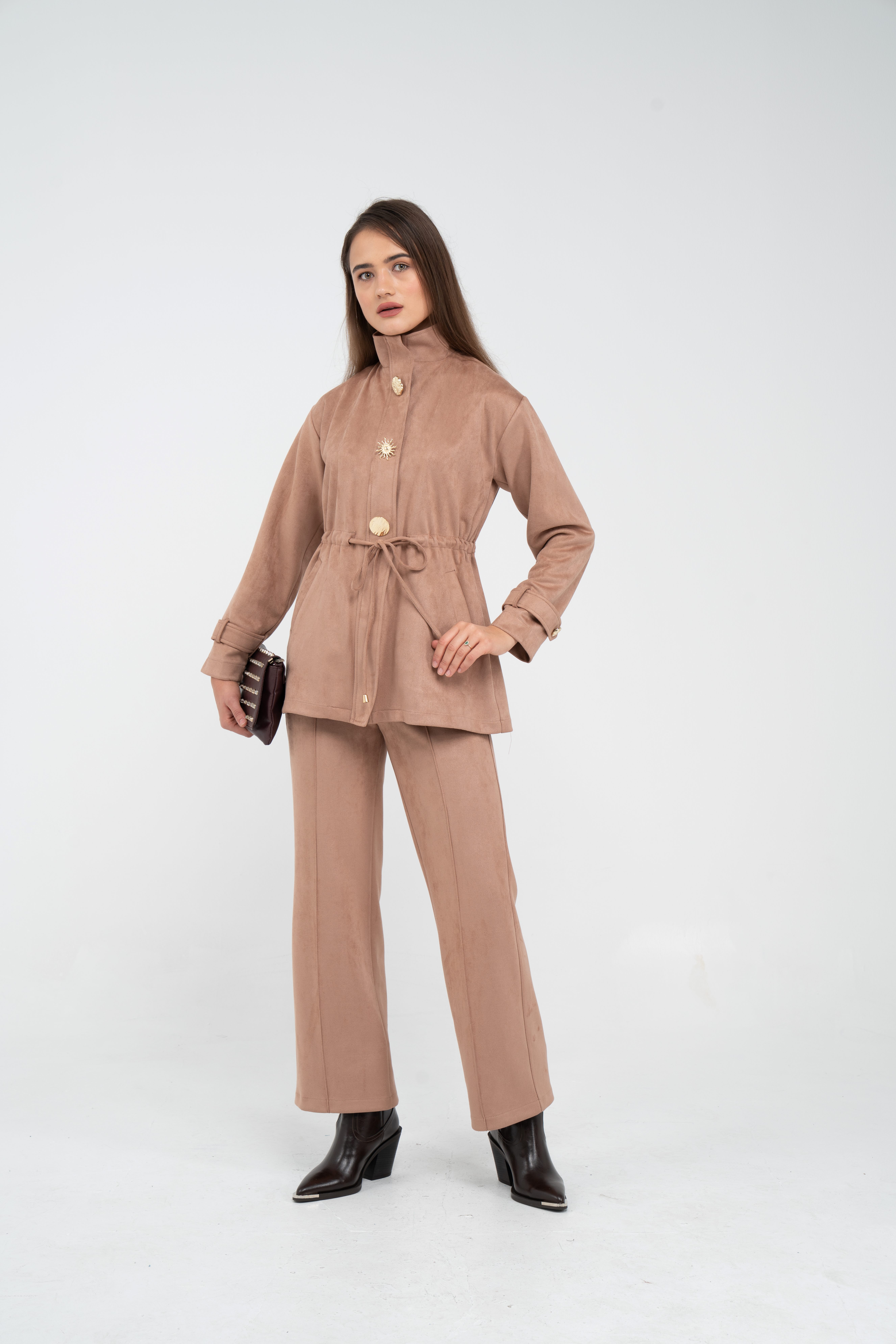 Gelince Haber VerDikkat çeken bu süet dokulu kadın takım, rahatlığın ve şıklığın kusursuz birleşimini sunar. Üst kısmındaki yüksek yaka formu, altın düğme detayları ve ayarlanabilir bel bağı sayesinde hem modern hem de zarif bir siluet oluşturur. Kumaşın yumuşak dokusu gün boyu konfor sağlarken, kesimin akıcı yapısı hareket özgürlüğü sunar.