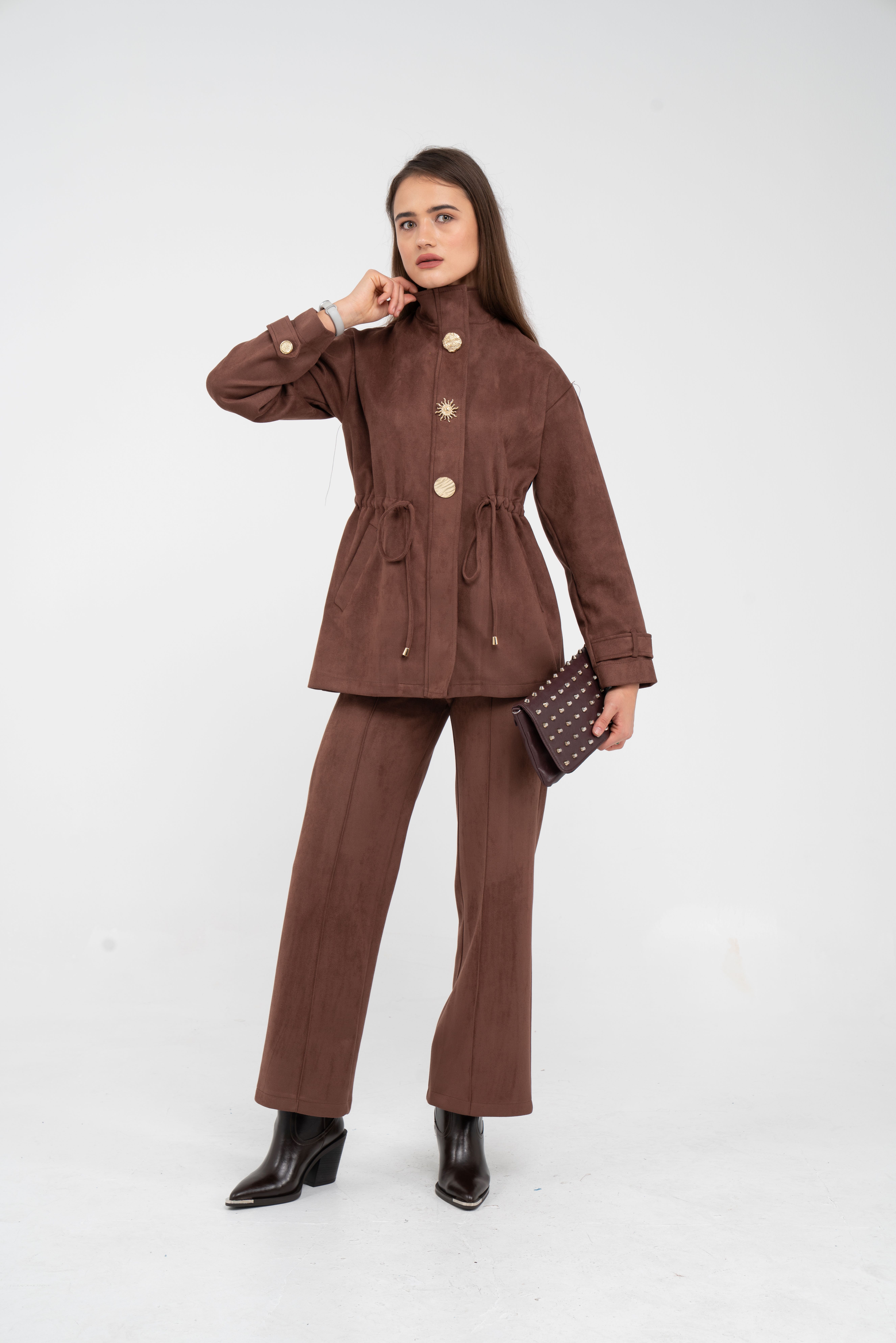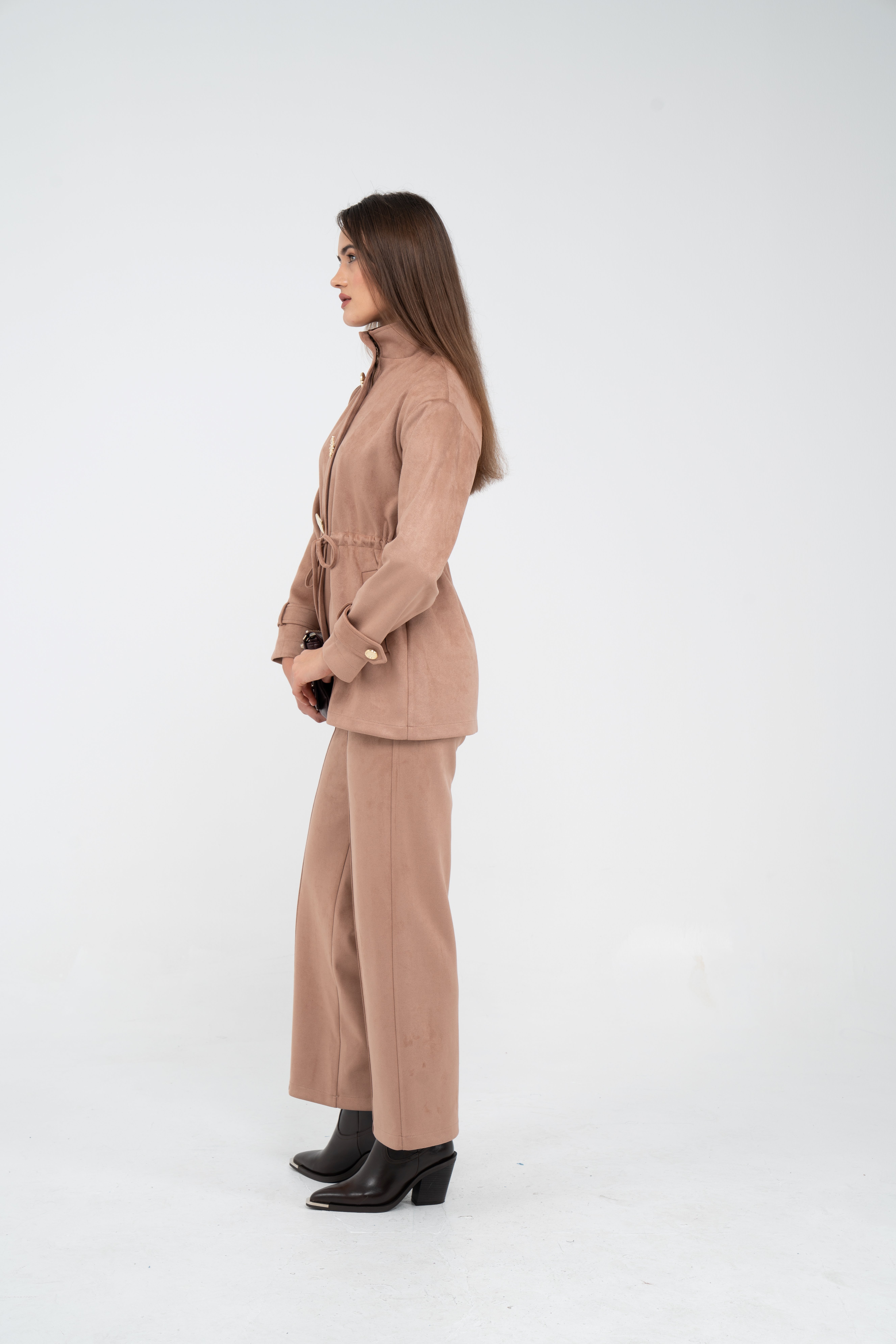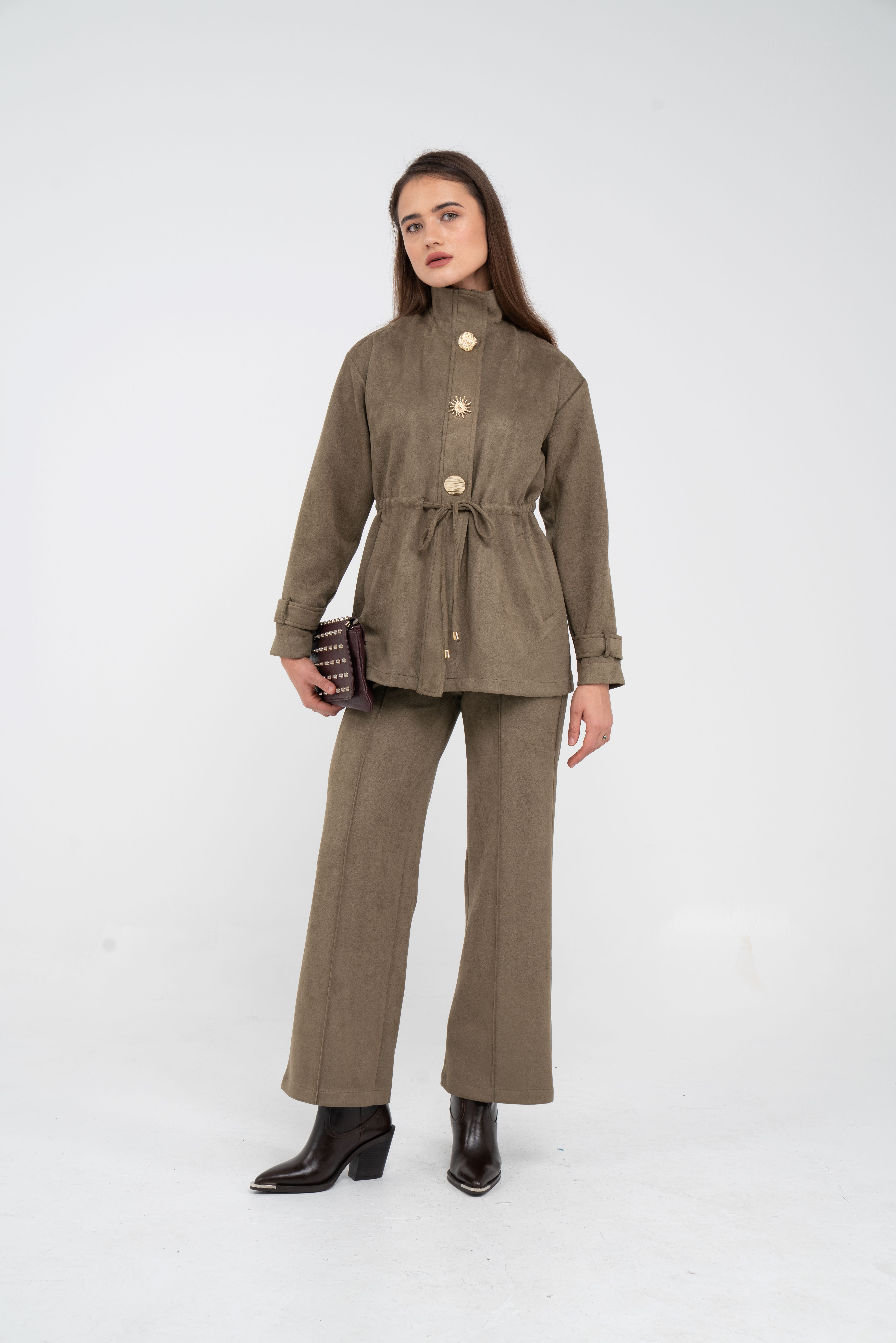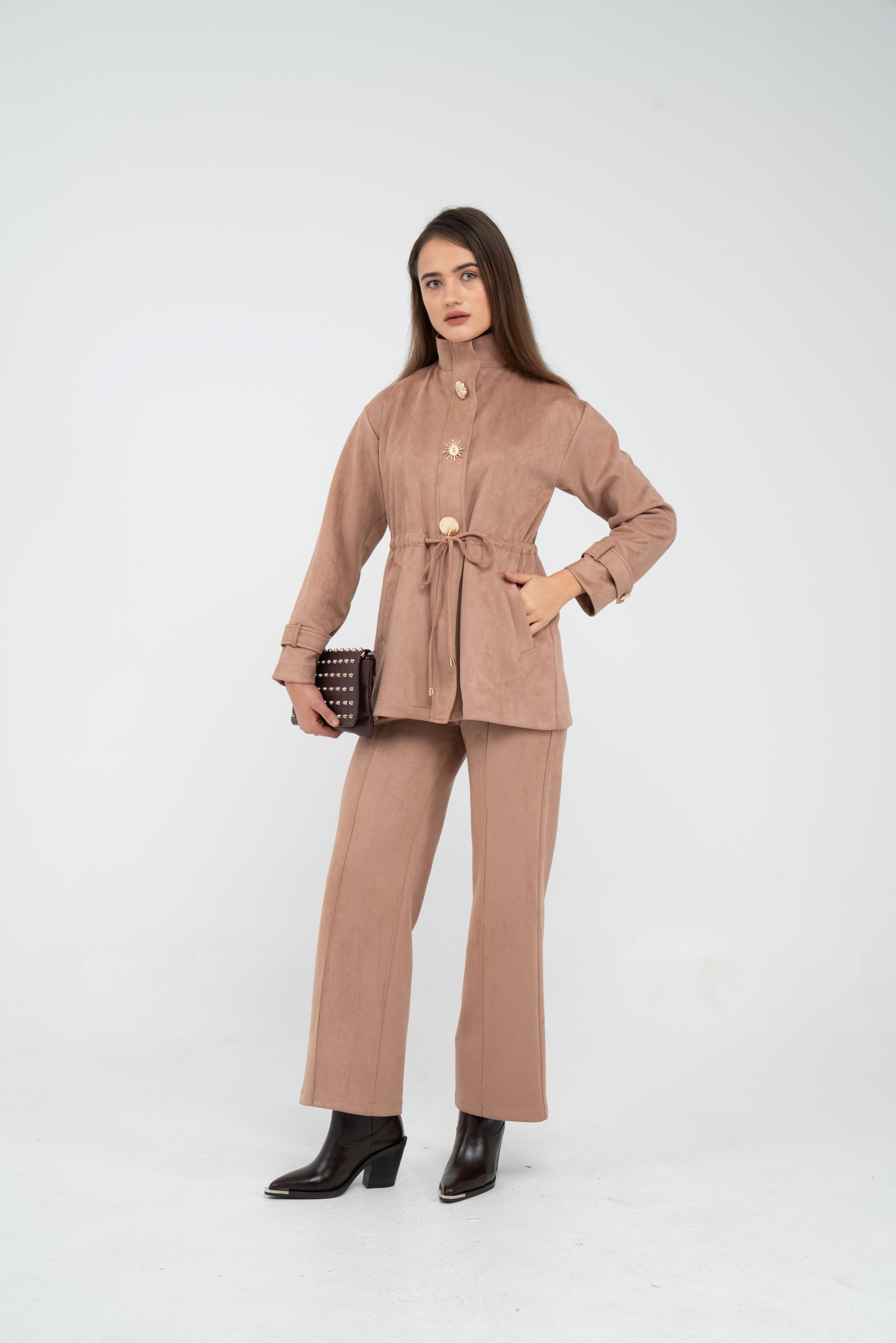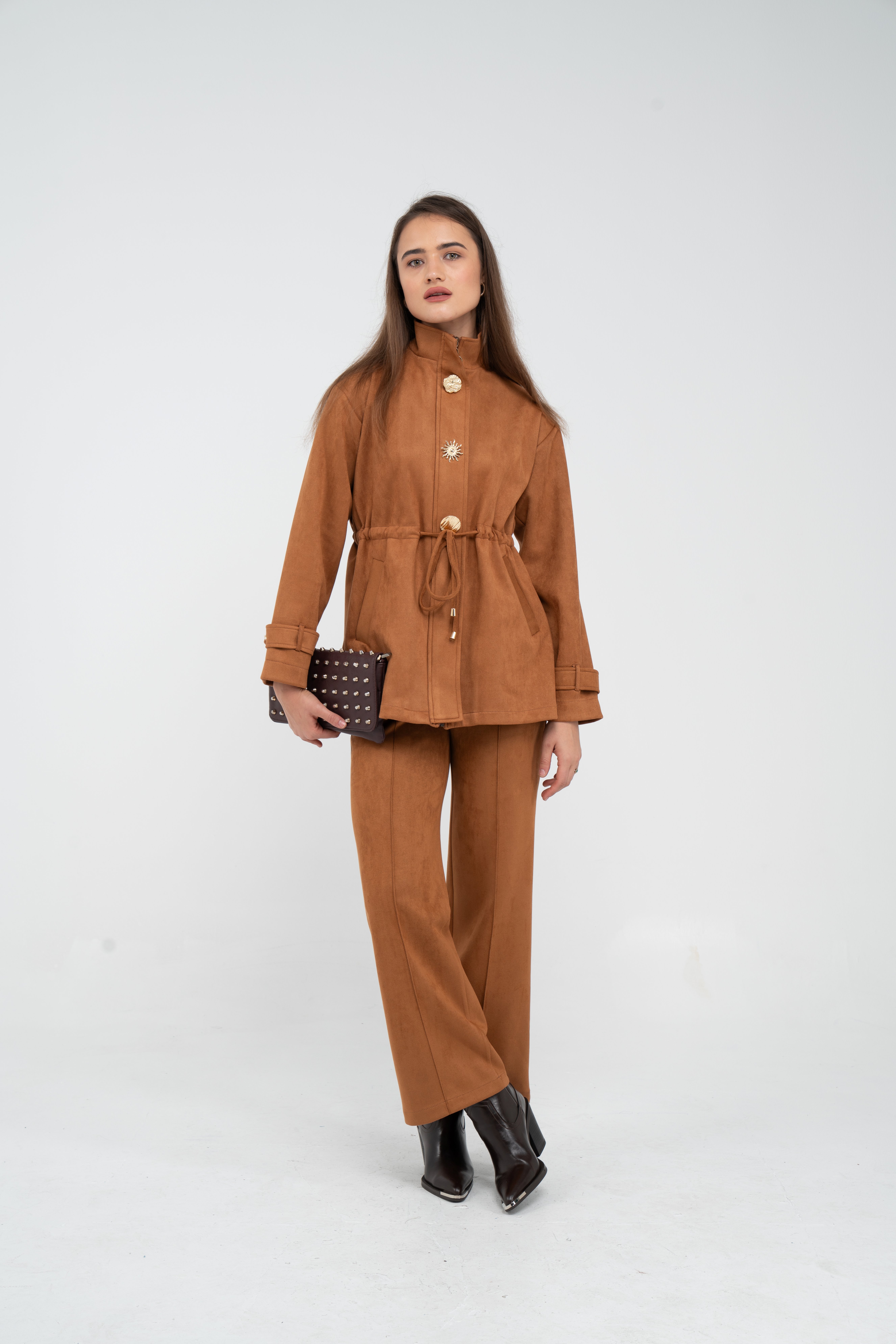 Gelince Haber VerDikkat çeken bu süet dokulu kadın takım, rahatlığın ve şıklığın kusursuz birleşimini sunar. Üst kısmındaki yüksek yaka formu, altın düğme detayları ve ayarlanabilir bel bağı sayesinde hem modern hem de zarif bir siluet oluşturur. Kumaşın yumuşak dokusu gün boyu konfor sağlarken, kesimin akıcı yapısı hareket özgürlüğü sunar.