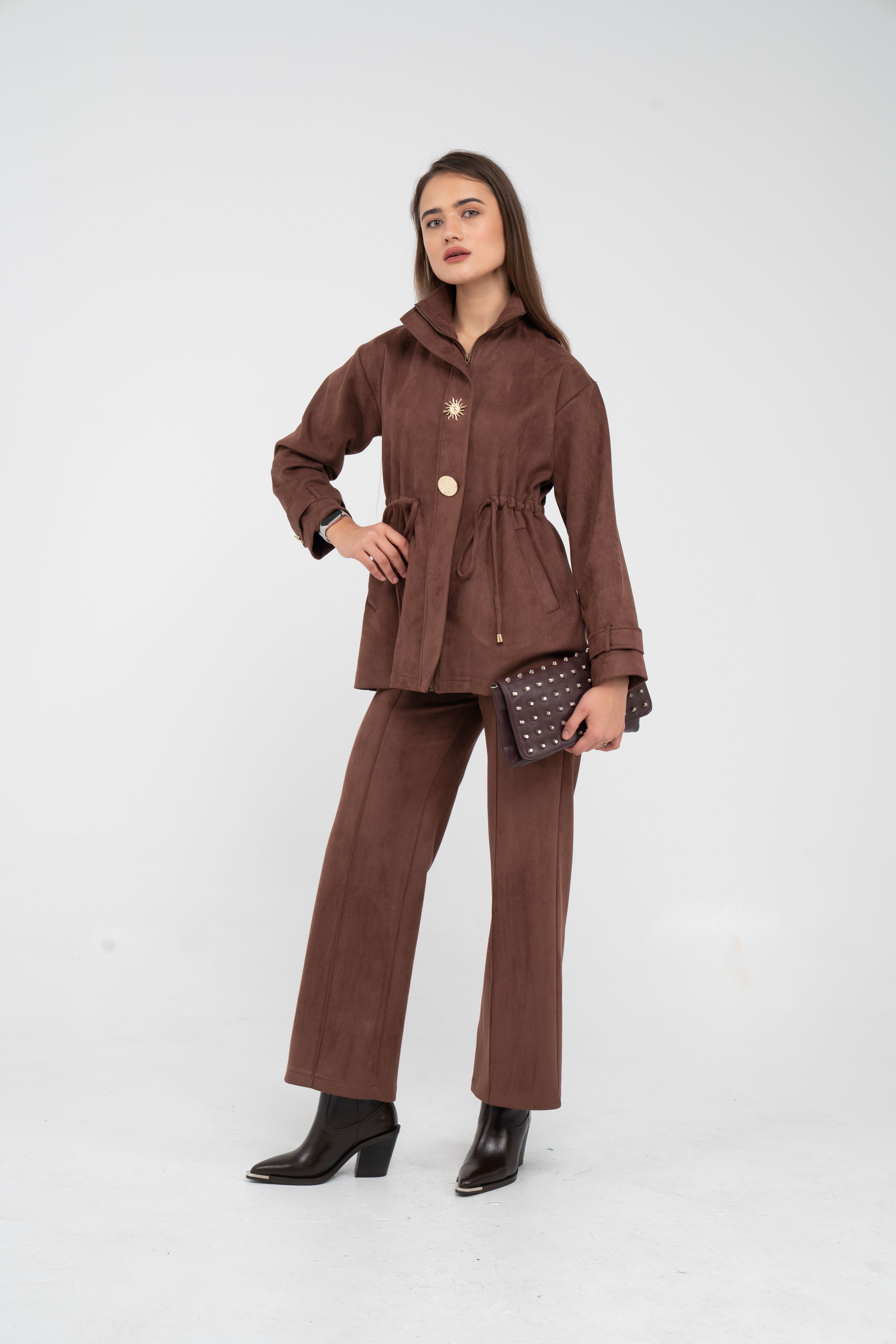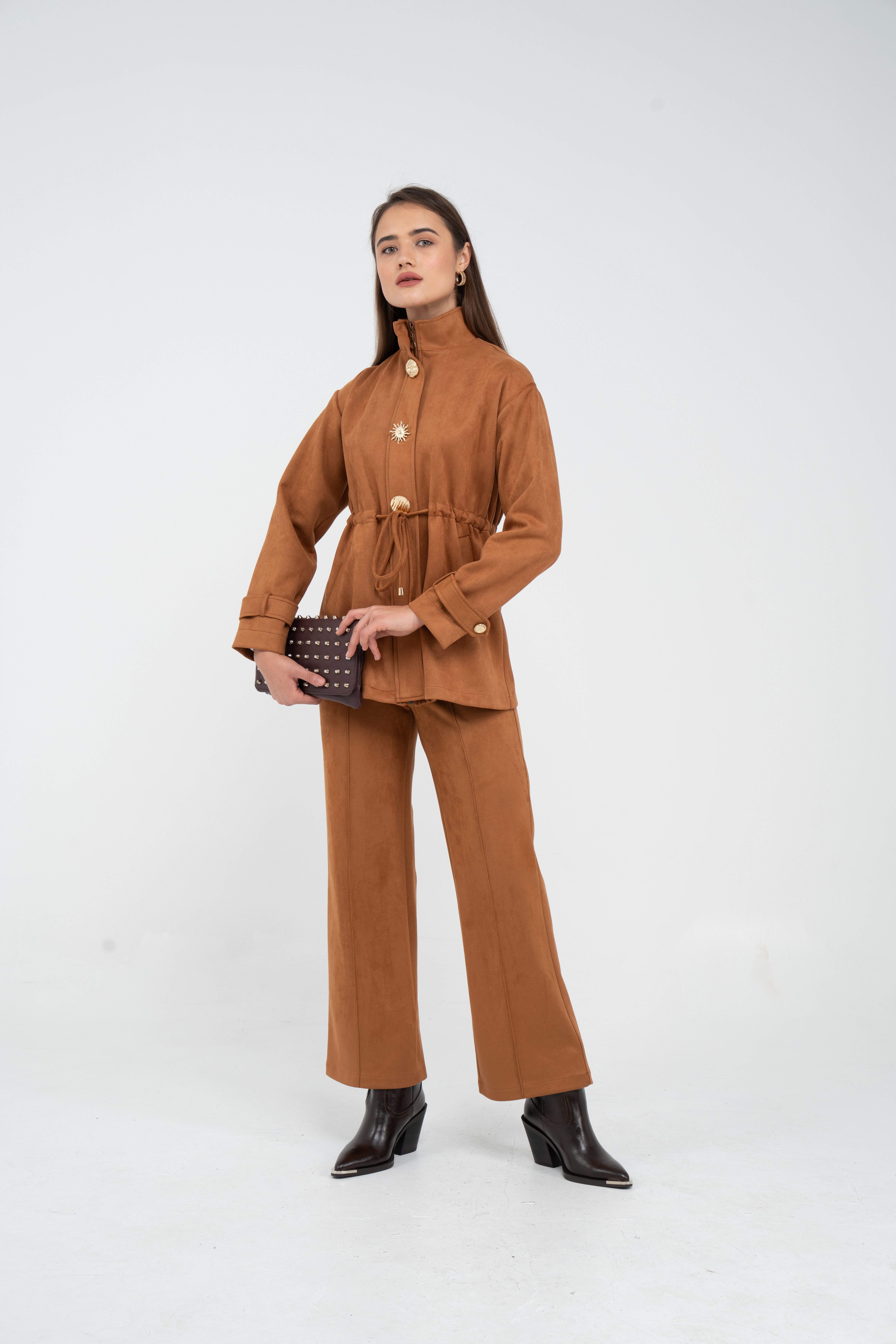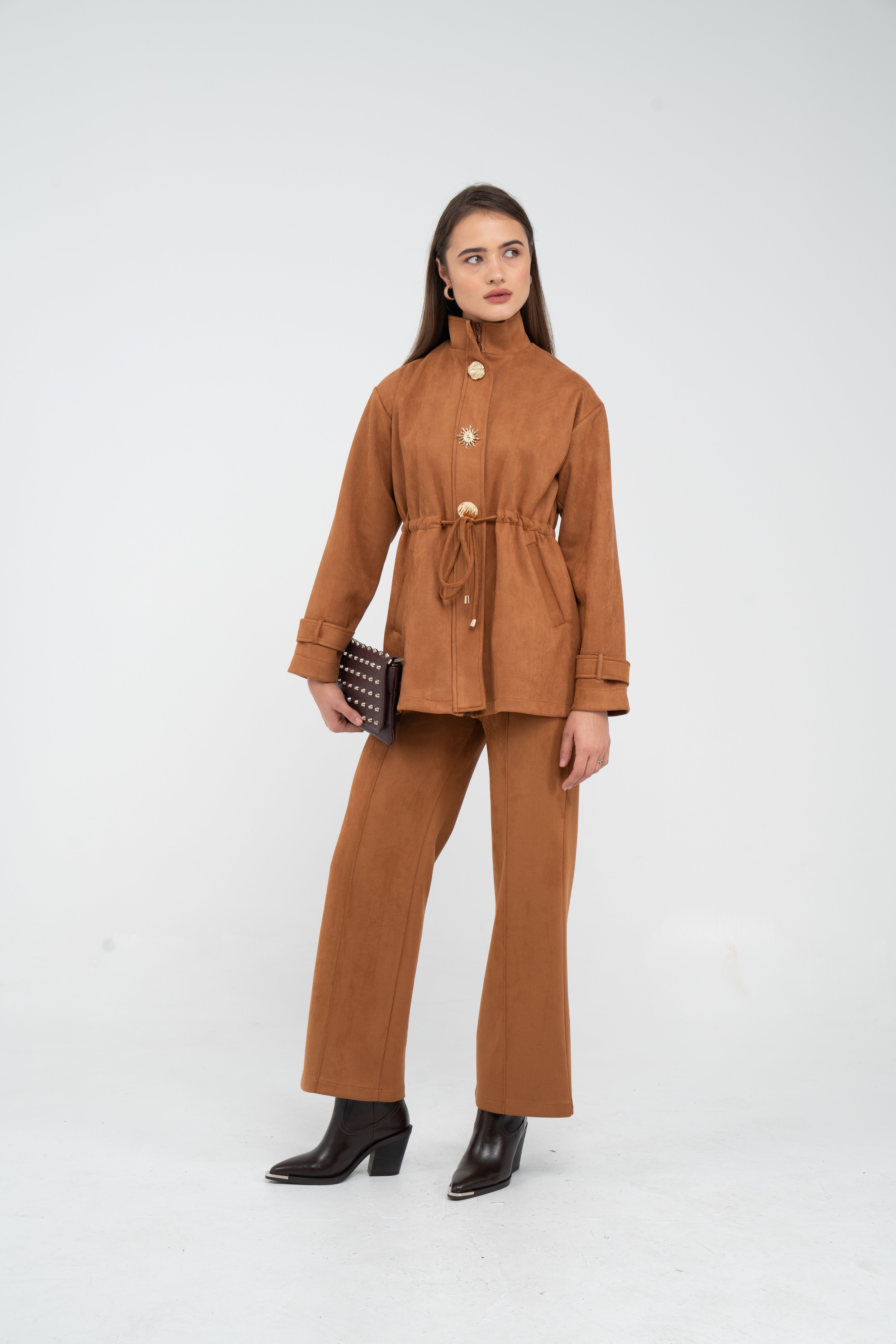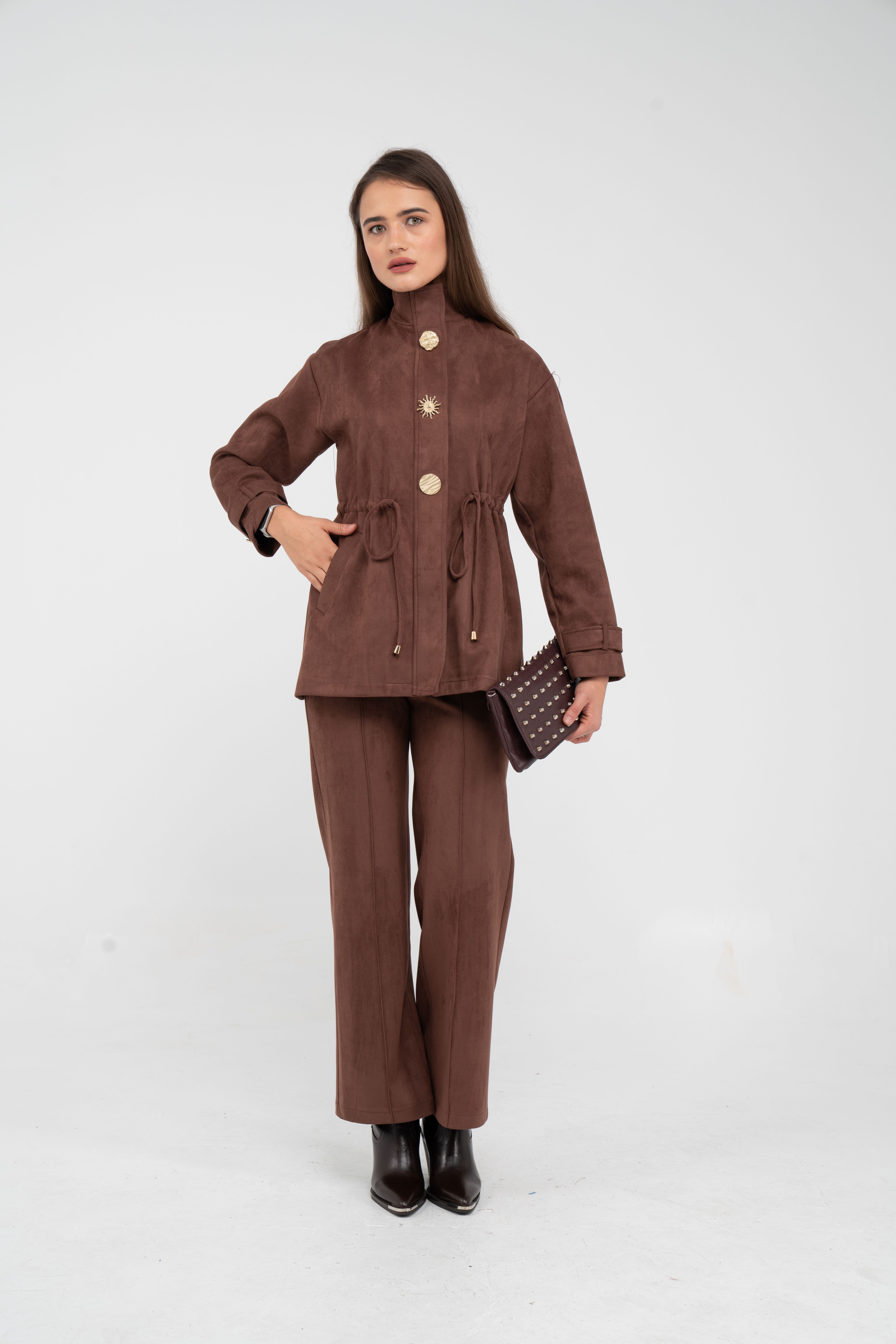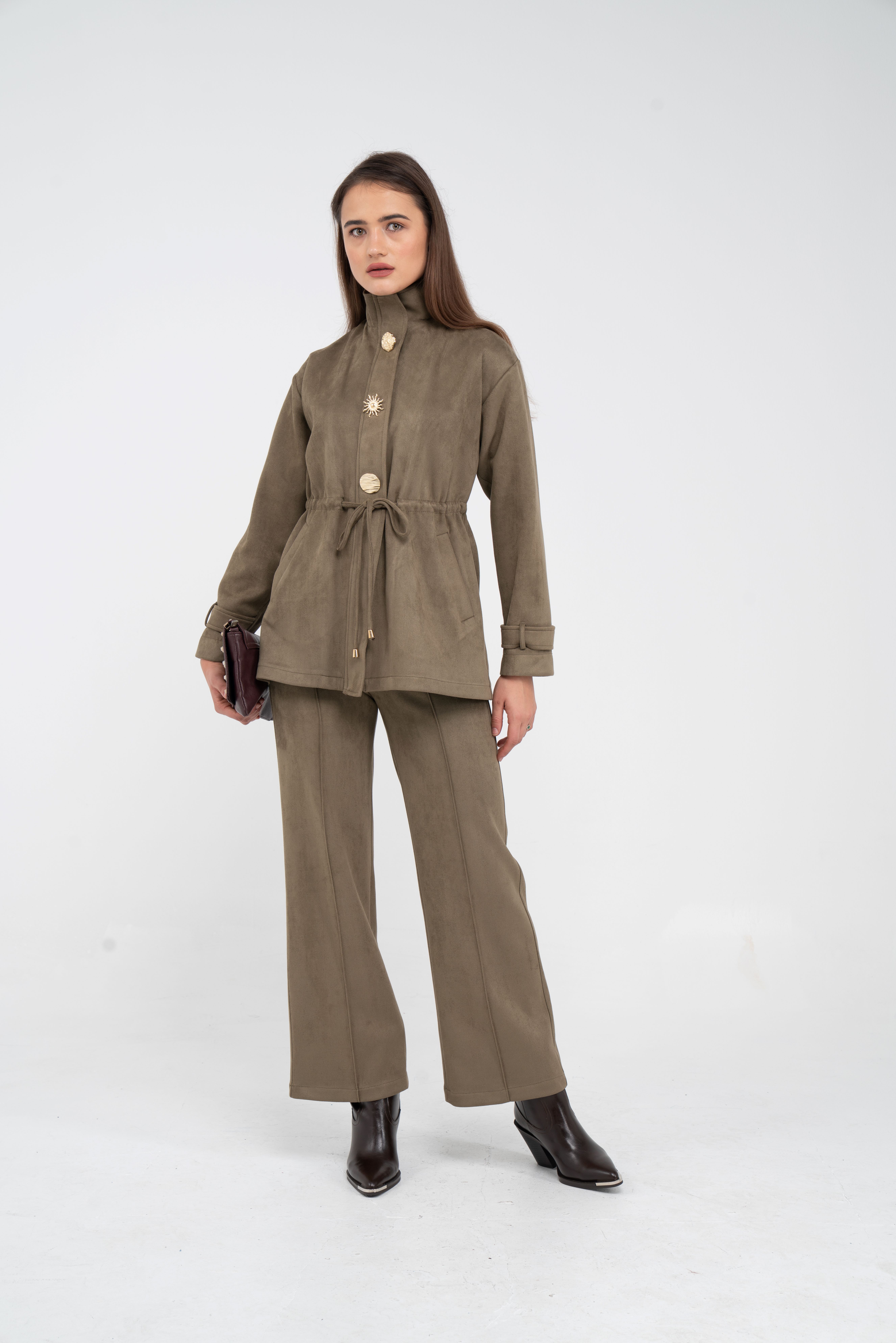 Gelince Haber VerDikkat çeken bu süet dokulu kadın takım, rahatlığın ve şıklığın kusursuz birleşimini sunar. Üst kısmındaki yüksek yaka formu, altın düğme detayları ve ayarlanabilir bel bağı sayesinde hem modern hem de zarif bir siluet oluşturur. Kumaşın yumuşak dokusu gün boyu konfor sağlarken, kesimin akıcı yapısı hareket özgürlüğü sunar.