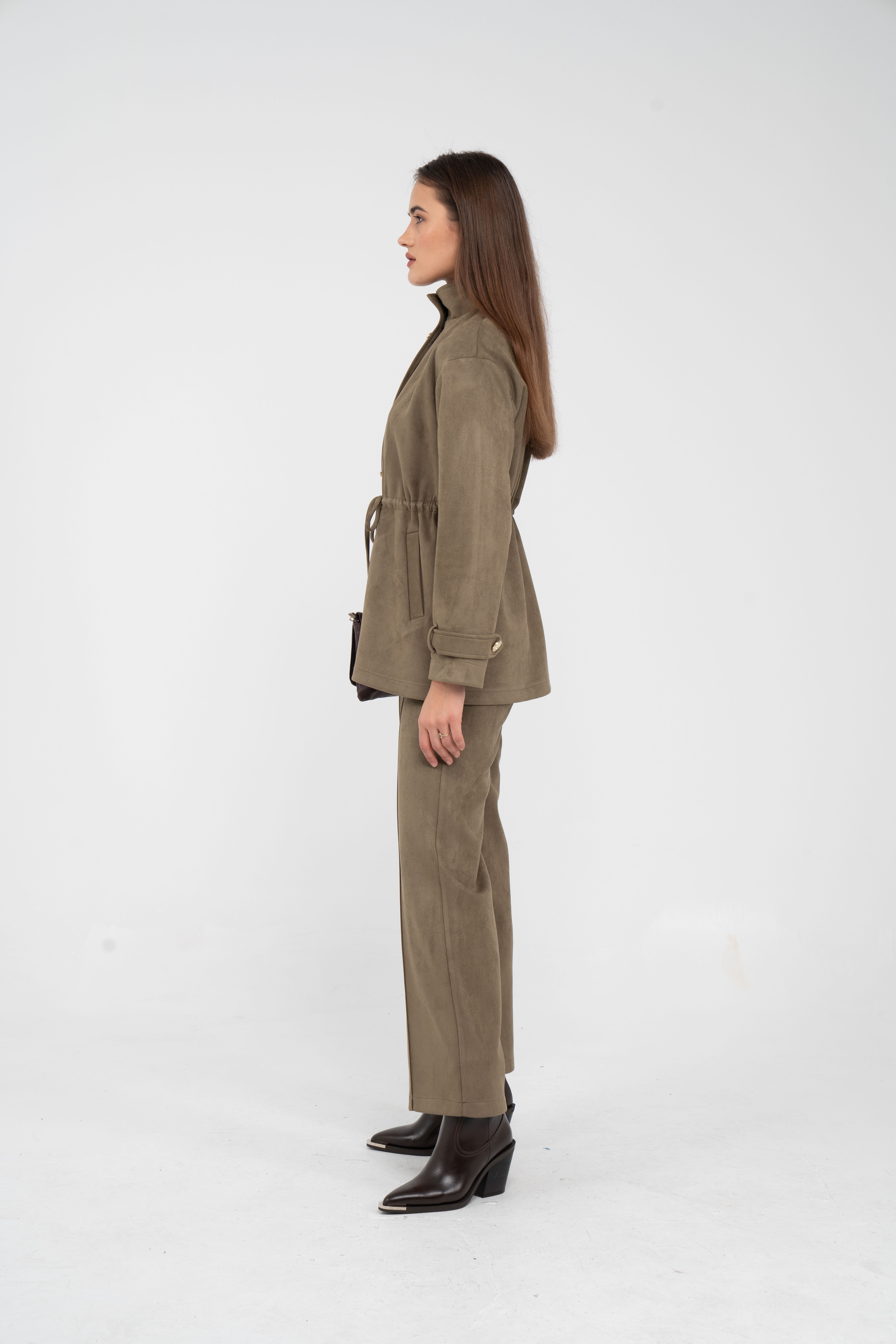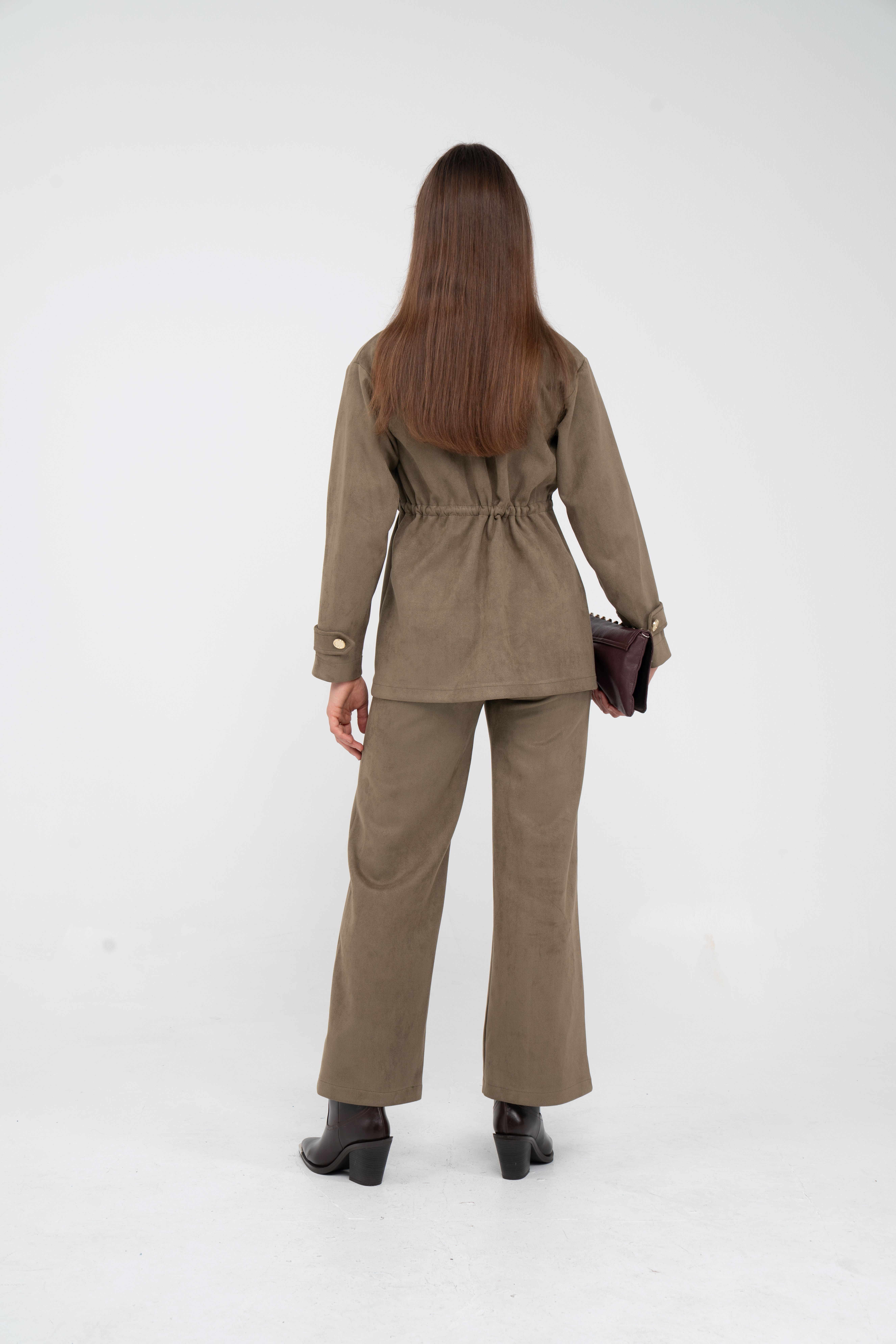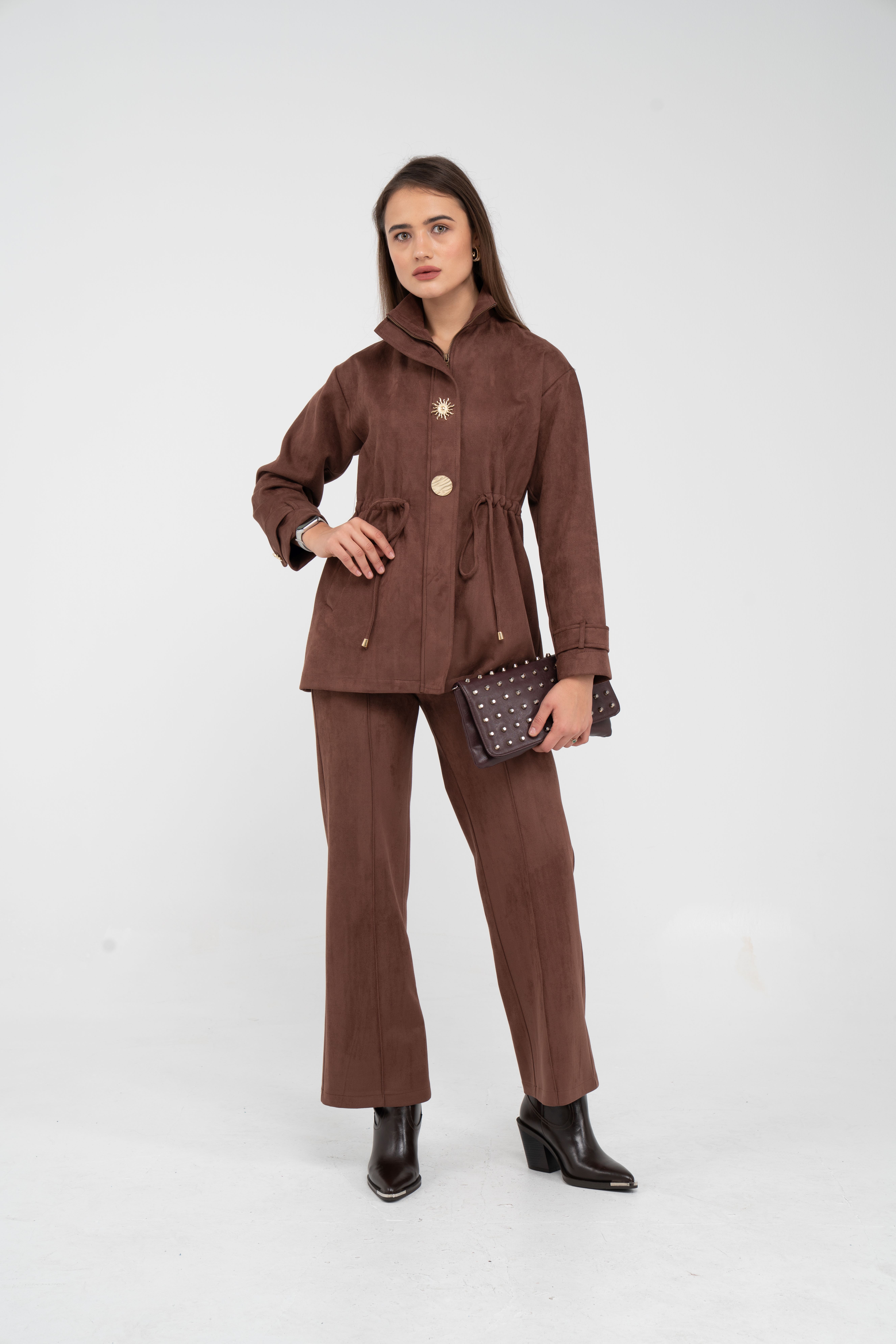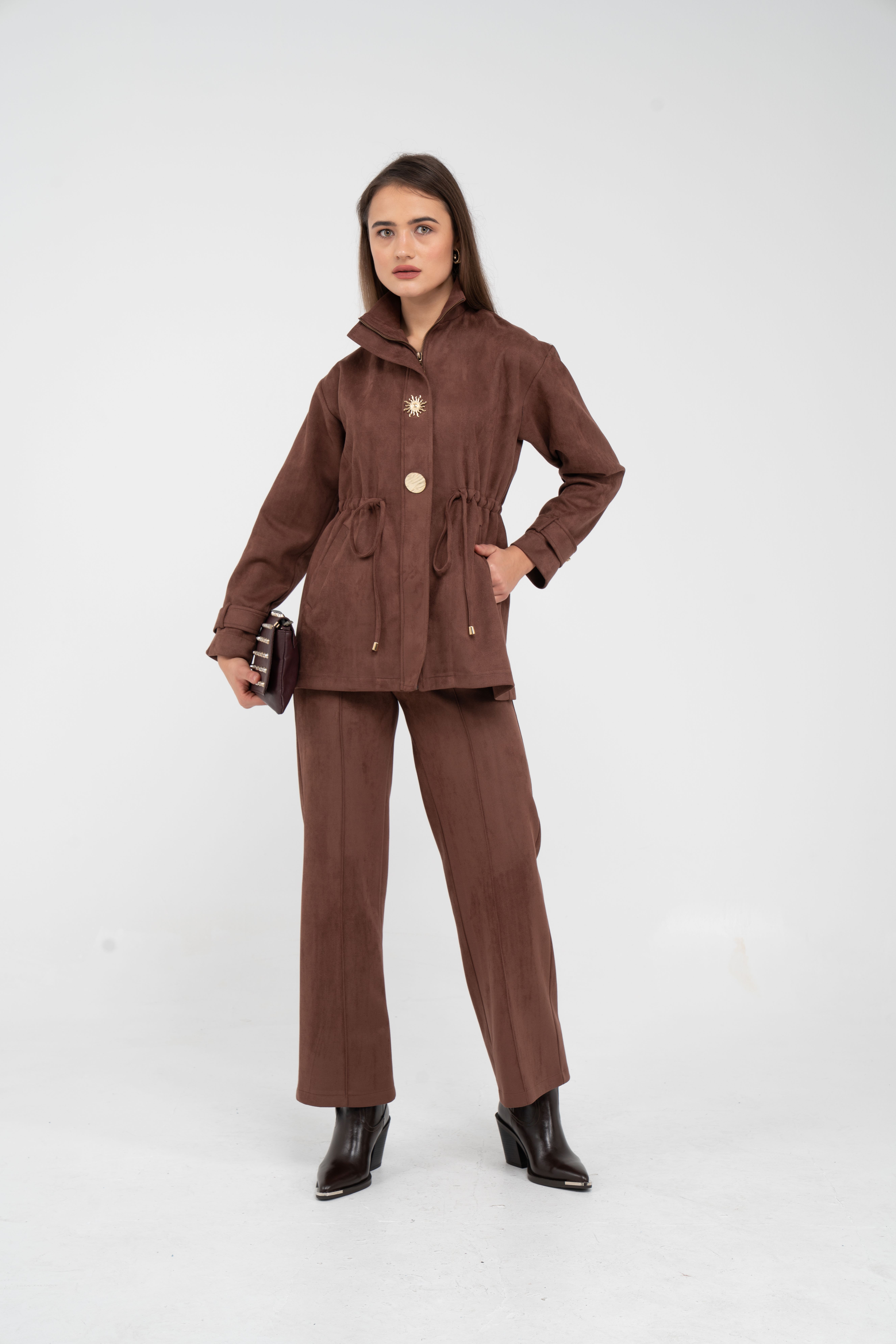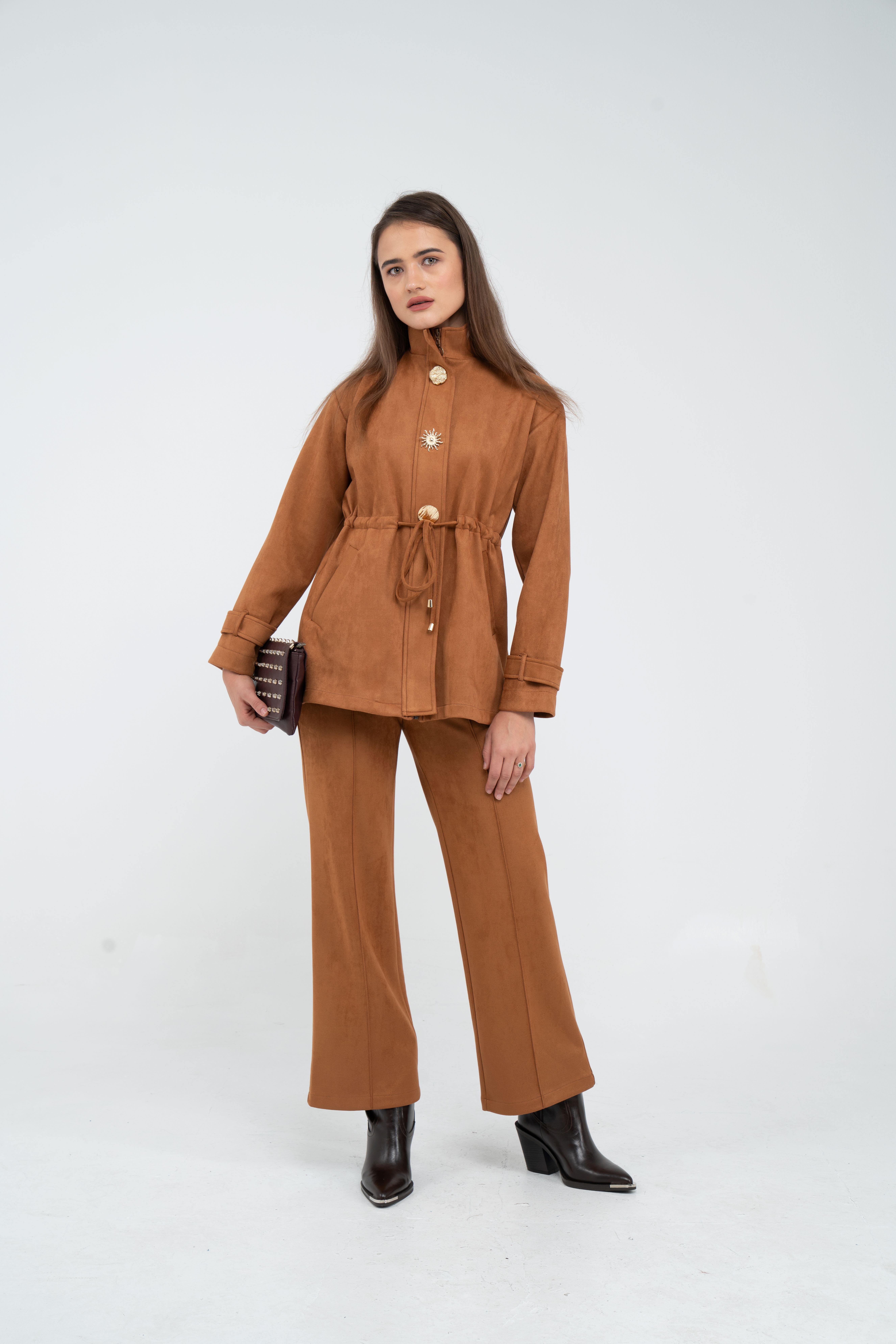Gelince Haber VerDikkat çeken bu süet dokulu kadın takım, rahatlığın ve şıklığın kusursuz birleşimini sunar. Üst kısmındaki yüksek yaka formu, altın düğme detayları ve ayarlanabilir bel bağı sayesinde hem modern hem de zarif bir siluet oluşturur. Kumaşın yumuşak dokusu gün boyu konfor sağlarken, kesimin akıcı yapısı hareket özgürlüğü sunar.