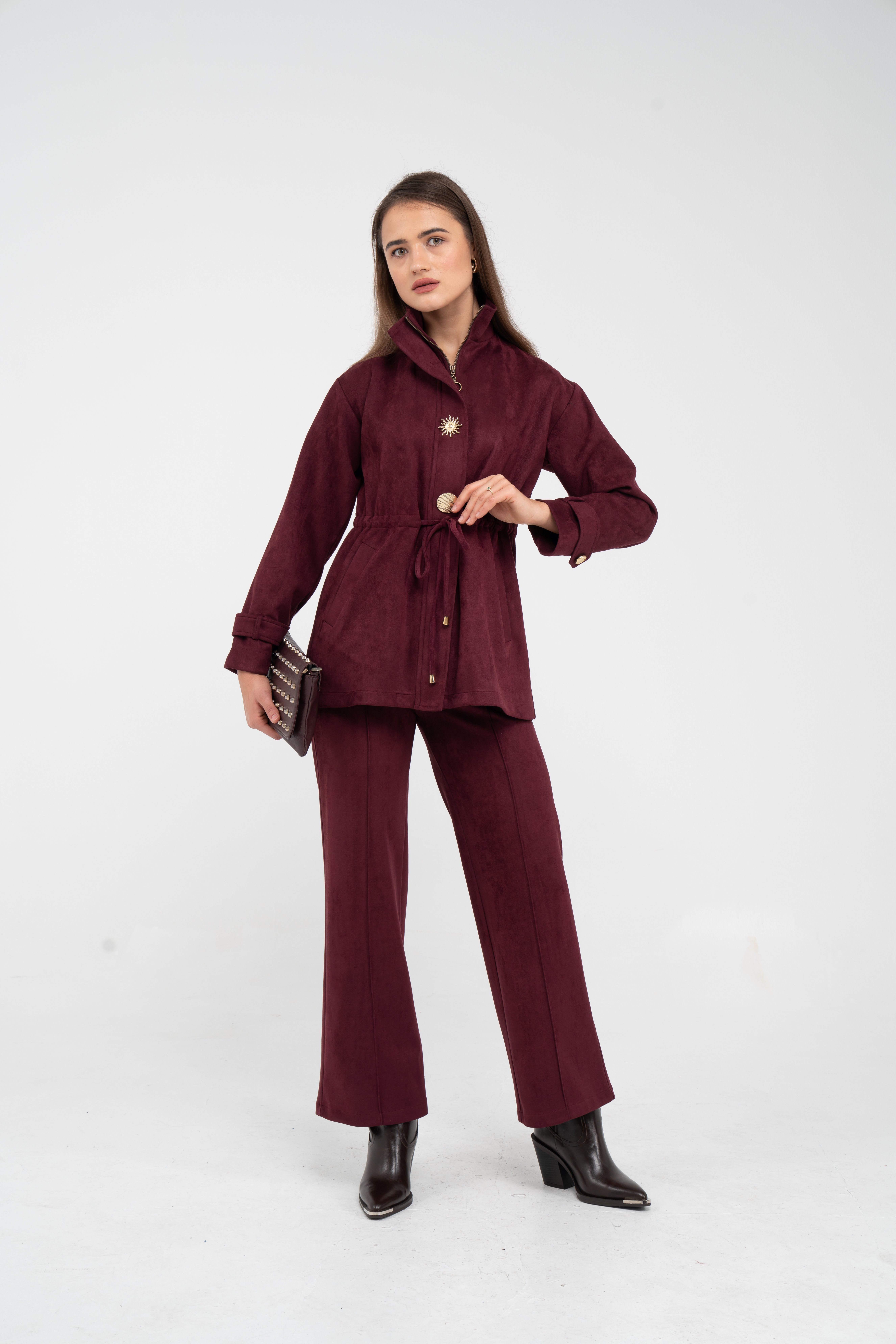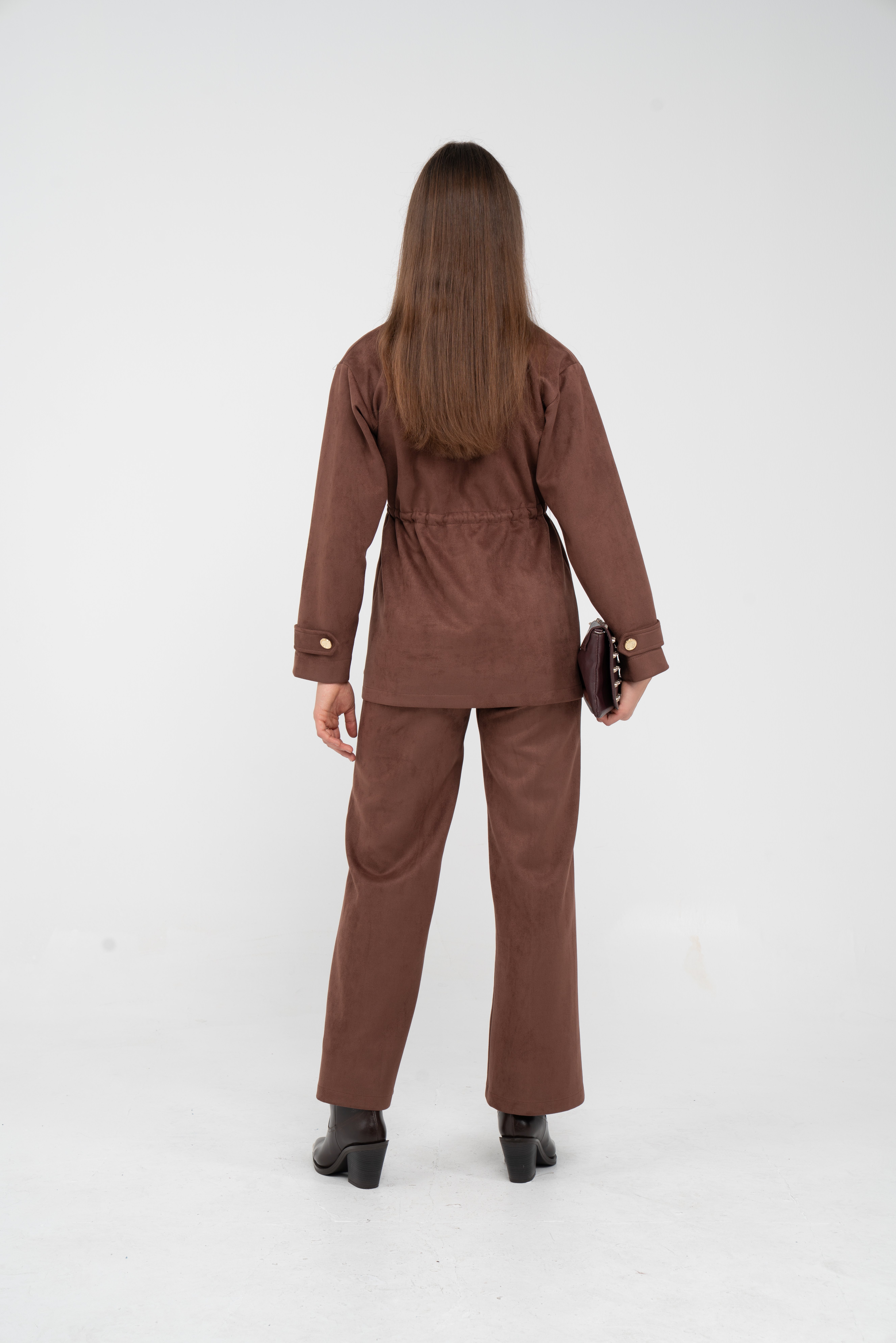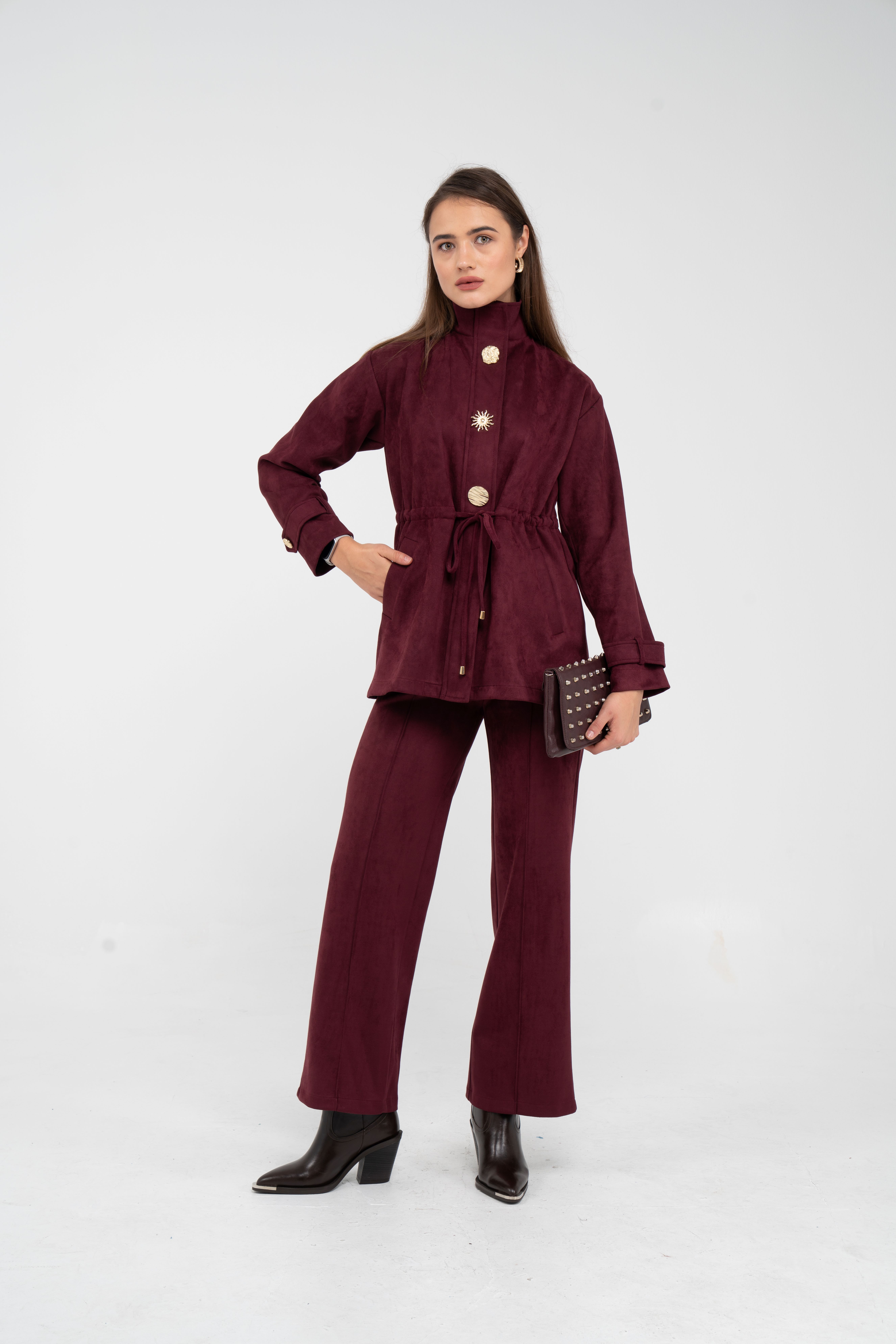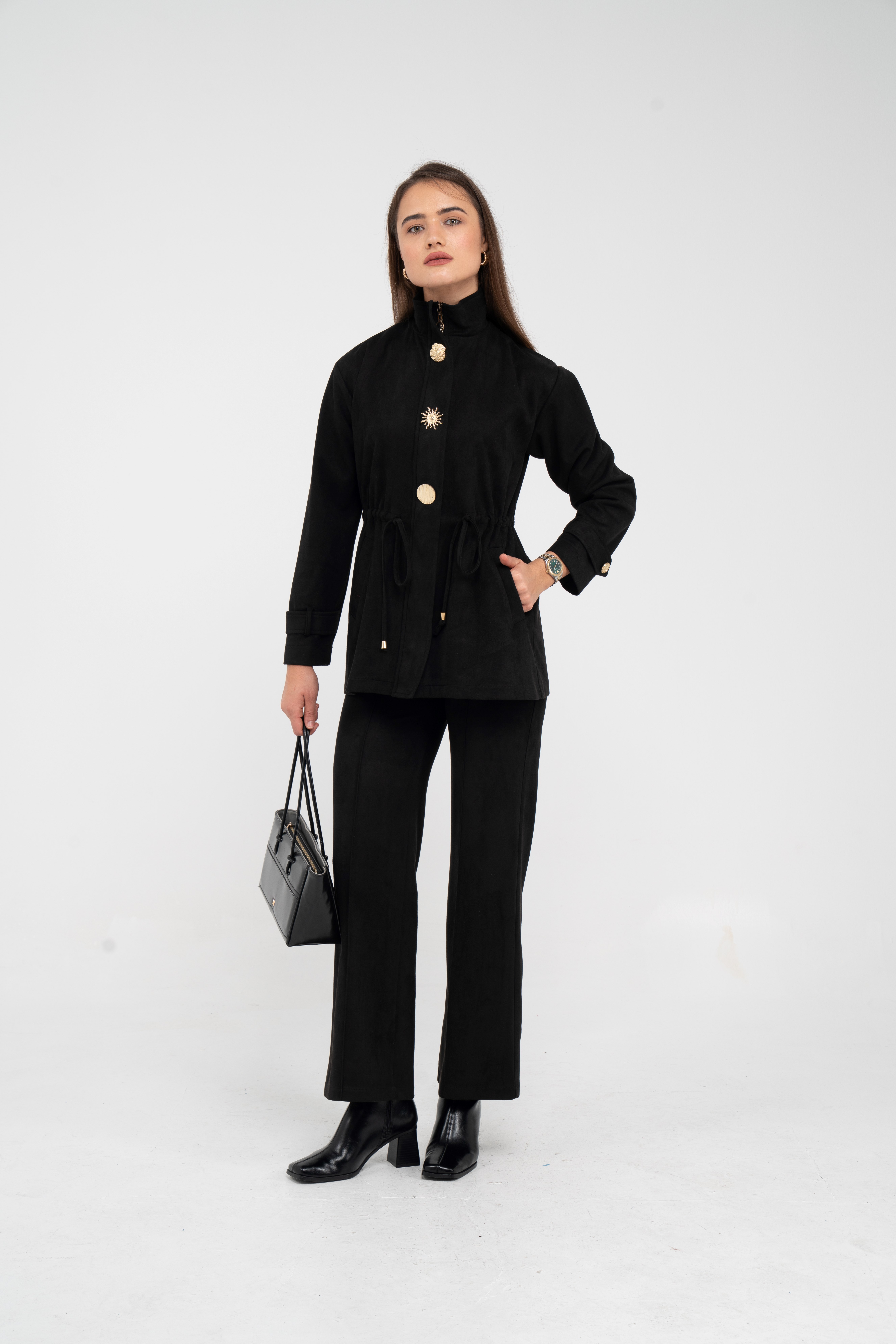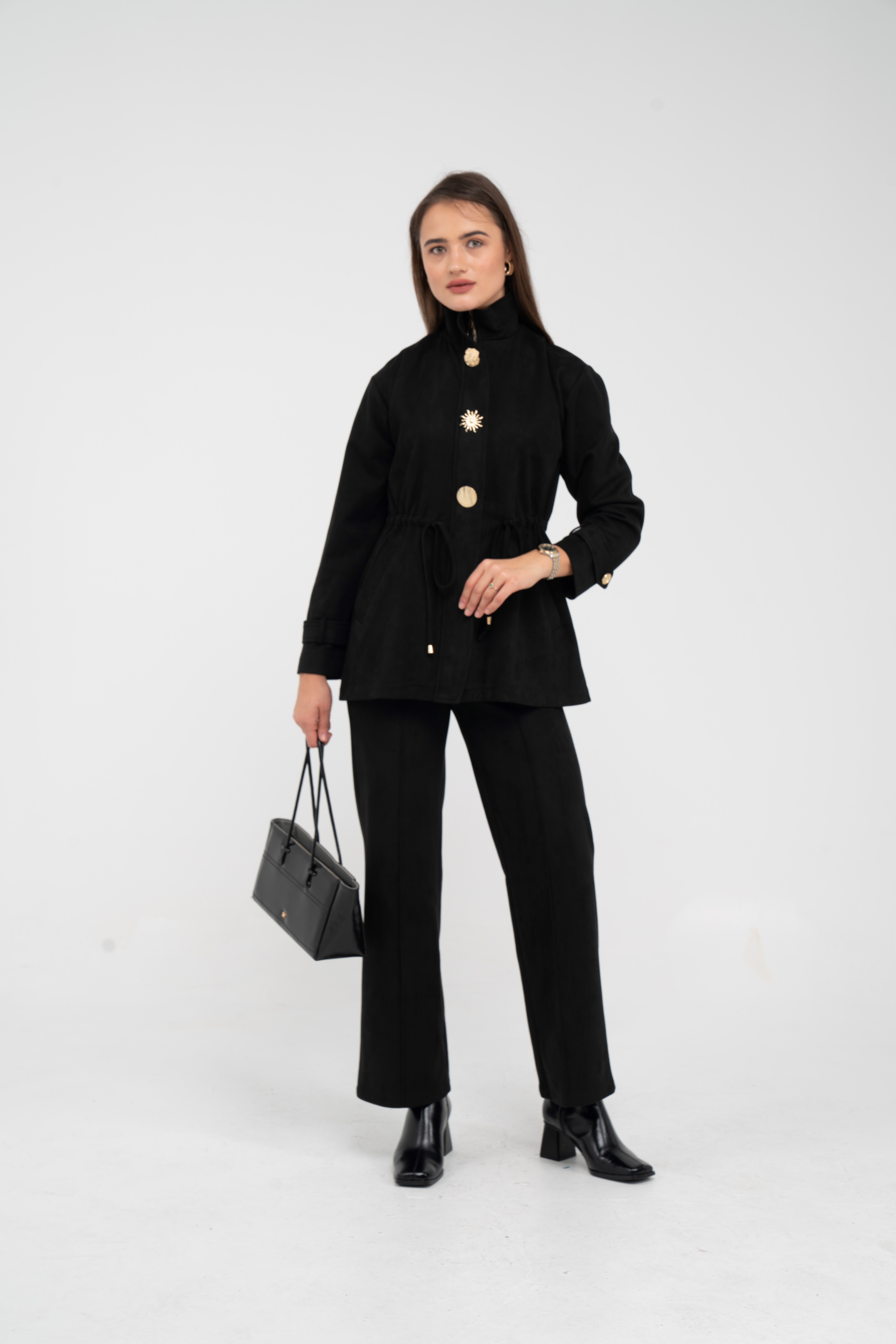 Gelince Haber VerDikkat çeken bu süet dokulu kadın takım, rahatlığın ve şıklığın kusursuz birleşimini sunar. Üst kısmındaki yüksek yaka formu, altın düğme detayları ve ayarlanabilir bel bağı sayesinde hem modern hem de zarif bir siluet oluşturur. Kumaşın yumuşak dokusu gün boyu konfor sağlarken, kesimin akıcı yapısı hareket özgürlüğü sunar.