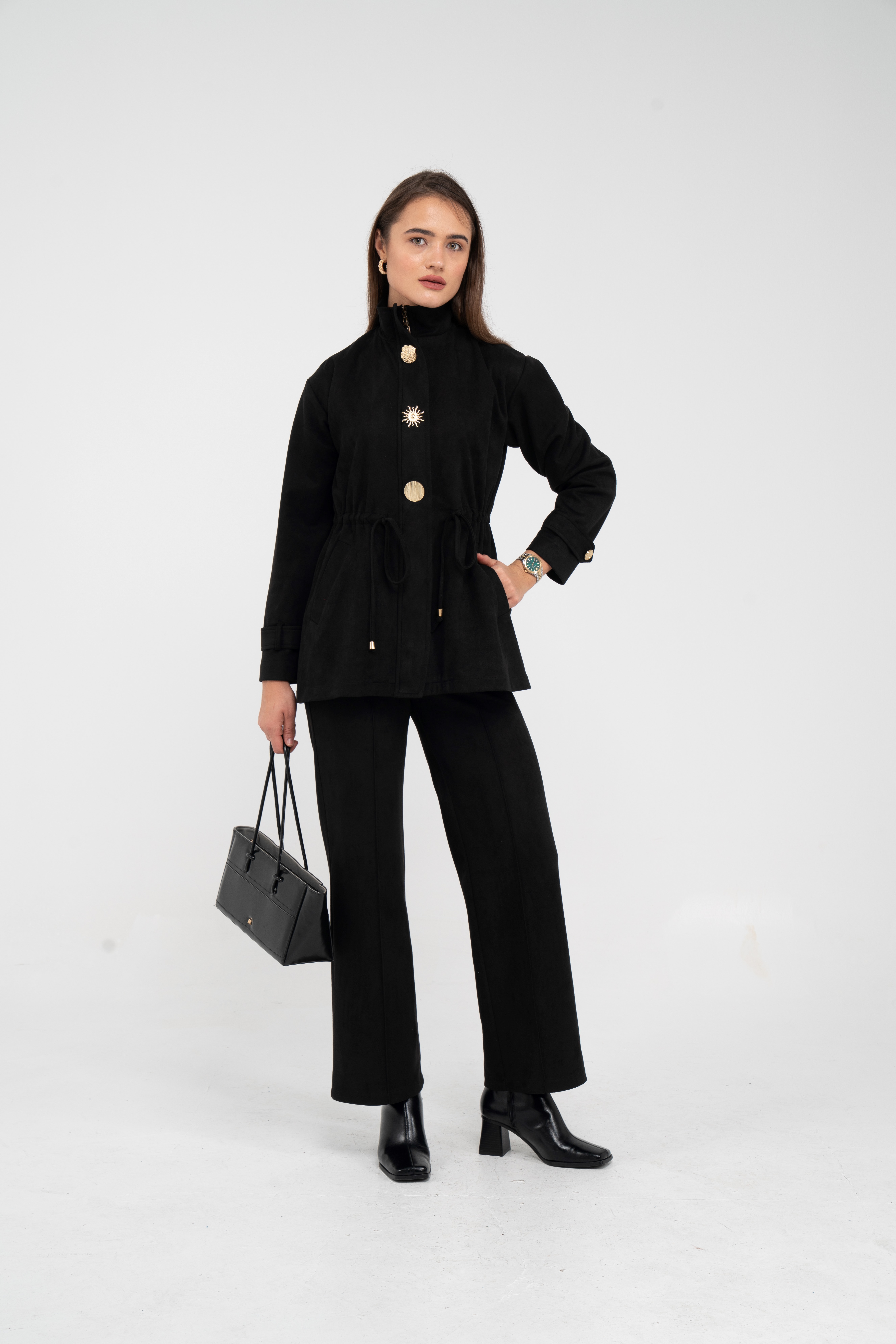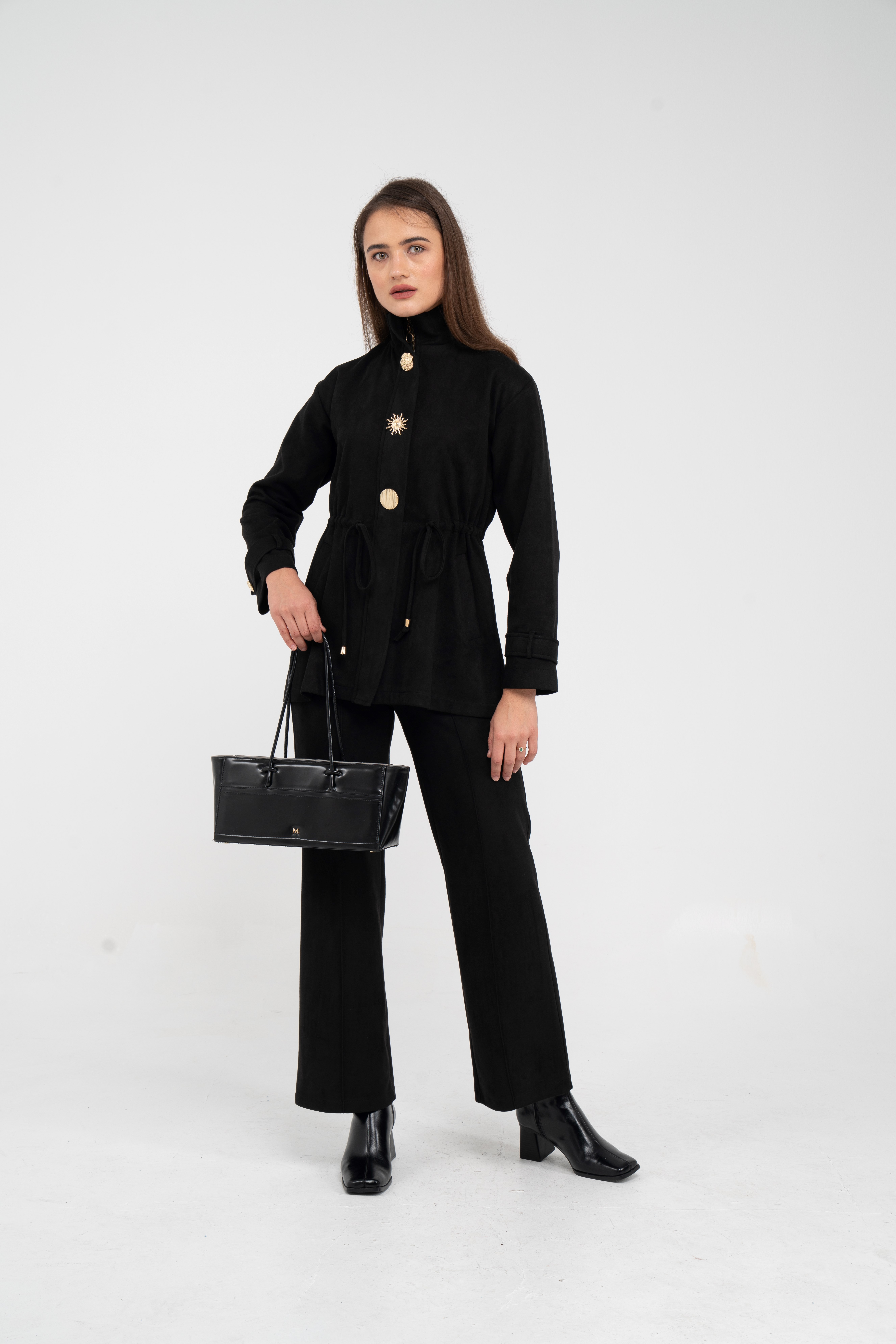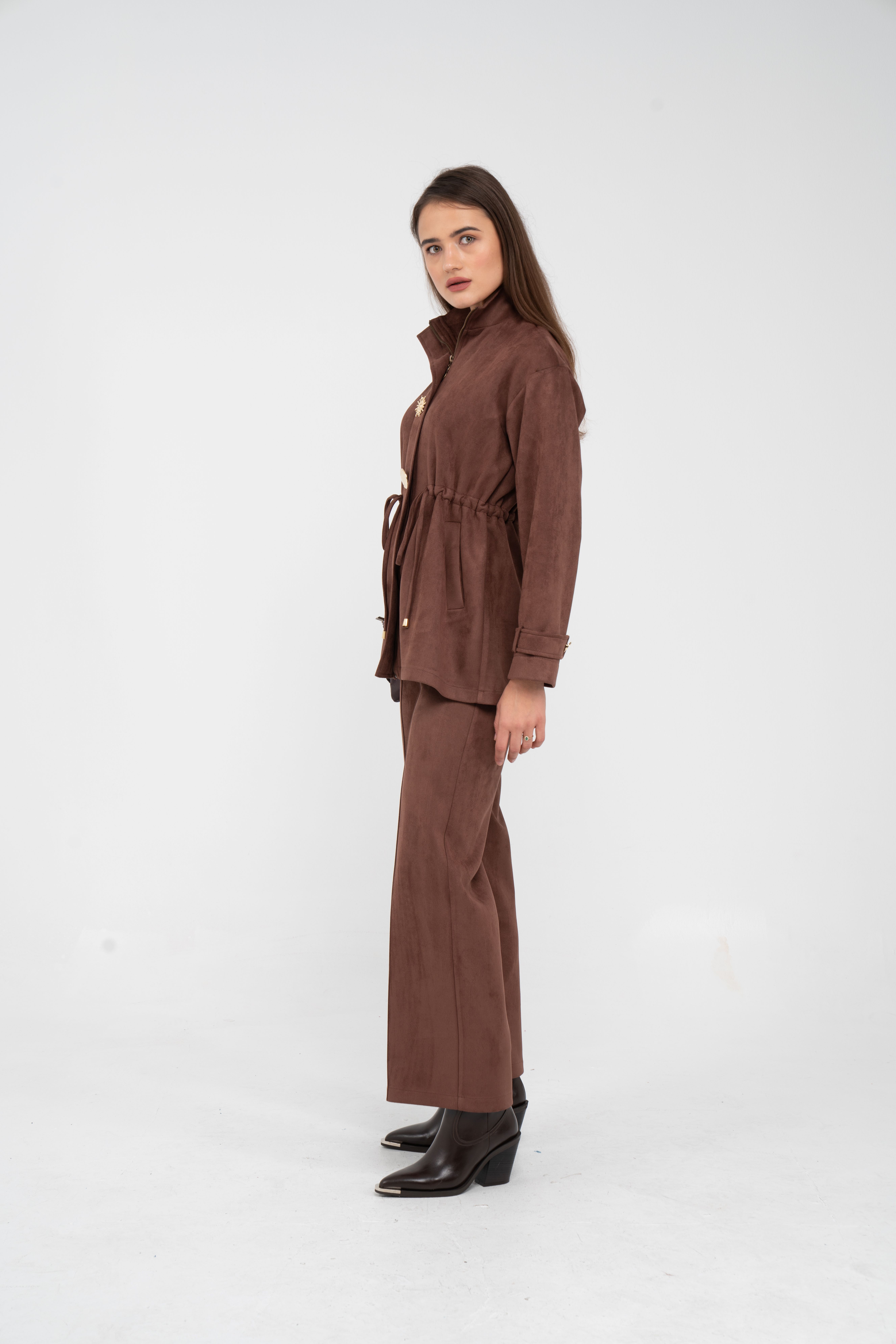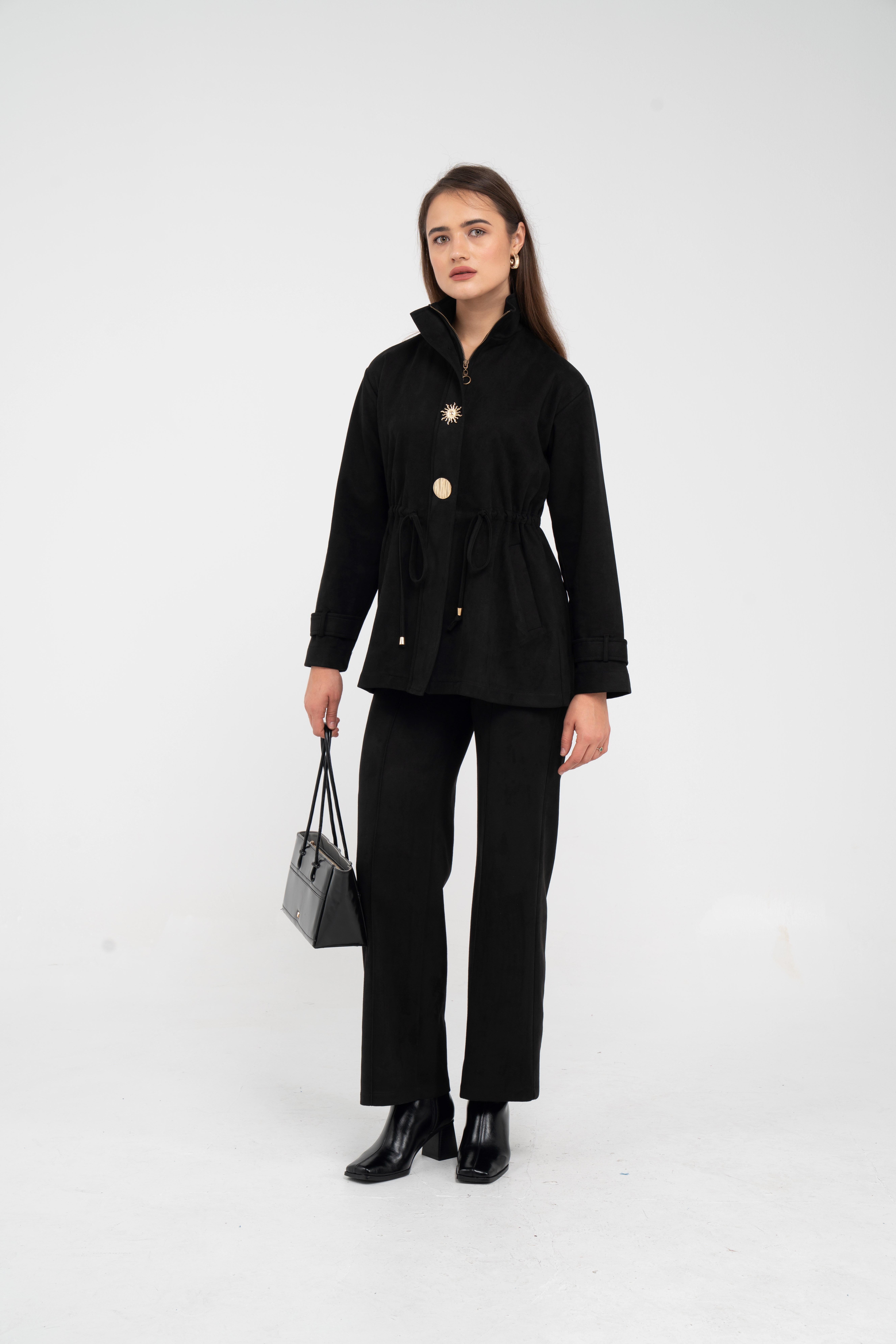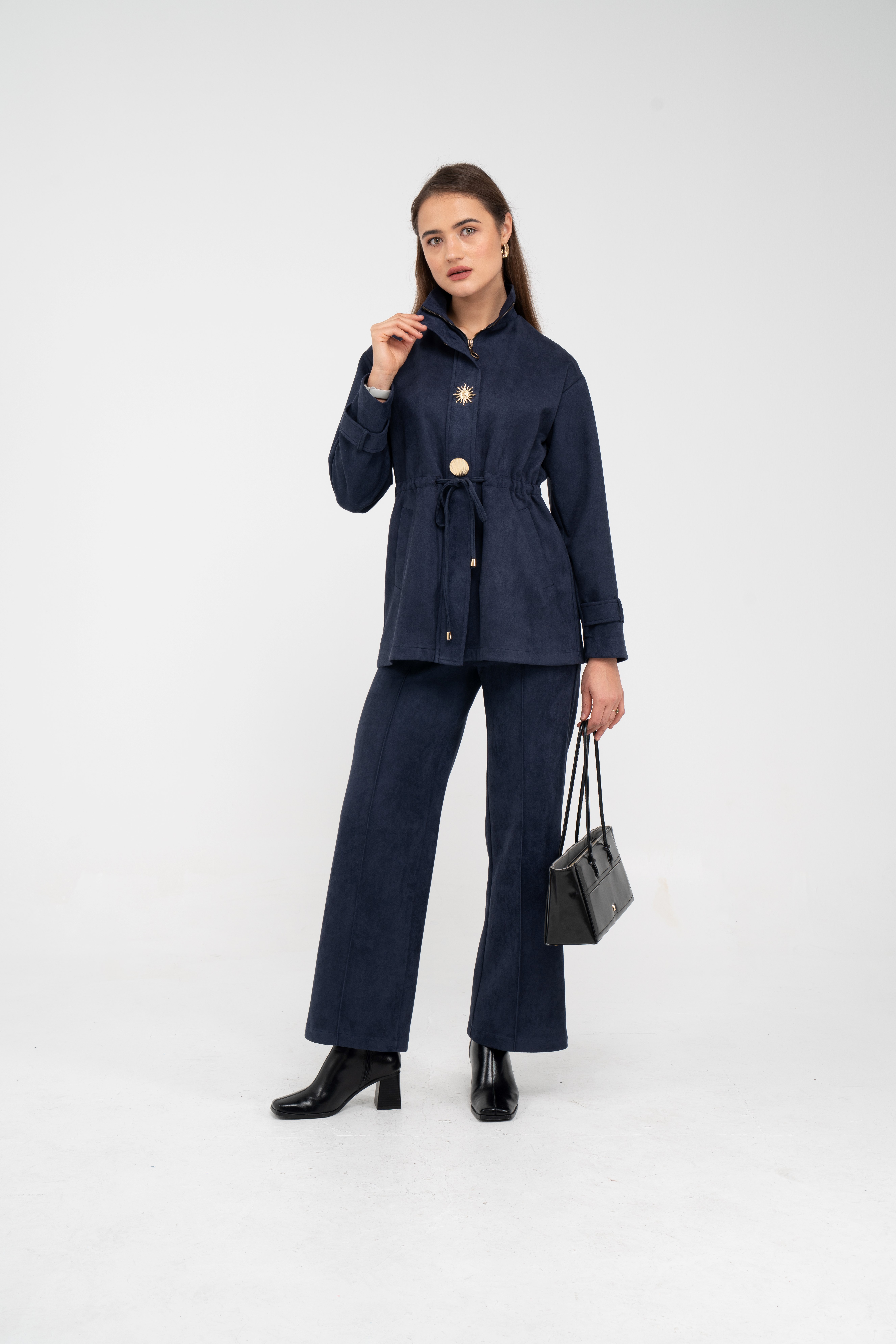 Gelince Haber VerDikkat çeken bu süet dokulu kadın takım, rahatlığın ve şıklığın kusursuz birleşimini sunar. Üst kısmındaki yüksek yaka formu, altın düğme detayları ve ayarlanabilir bel bağı sayesinde hem modern hem de zarif bir siluet oluşturur. Kumaşın yumuşak dokusu gün boyu konfor sağlarken, kesimin akıcı yapısı hareket özgürlüğü sunar.