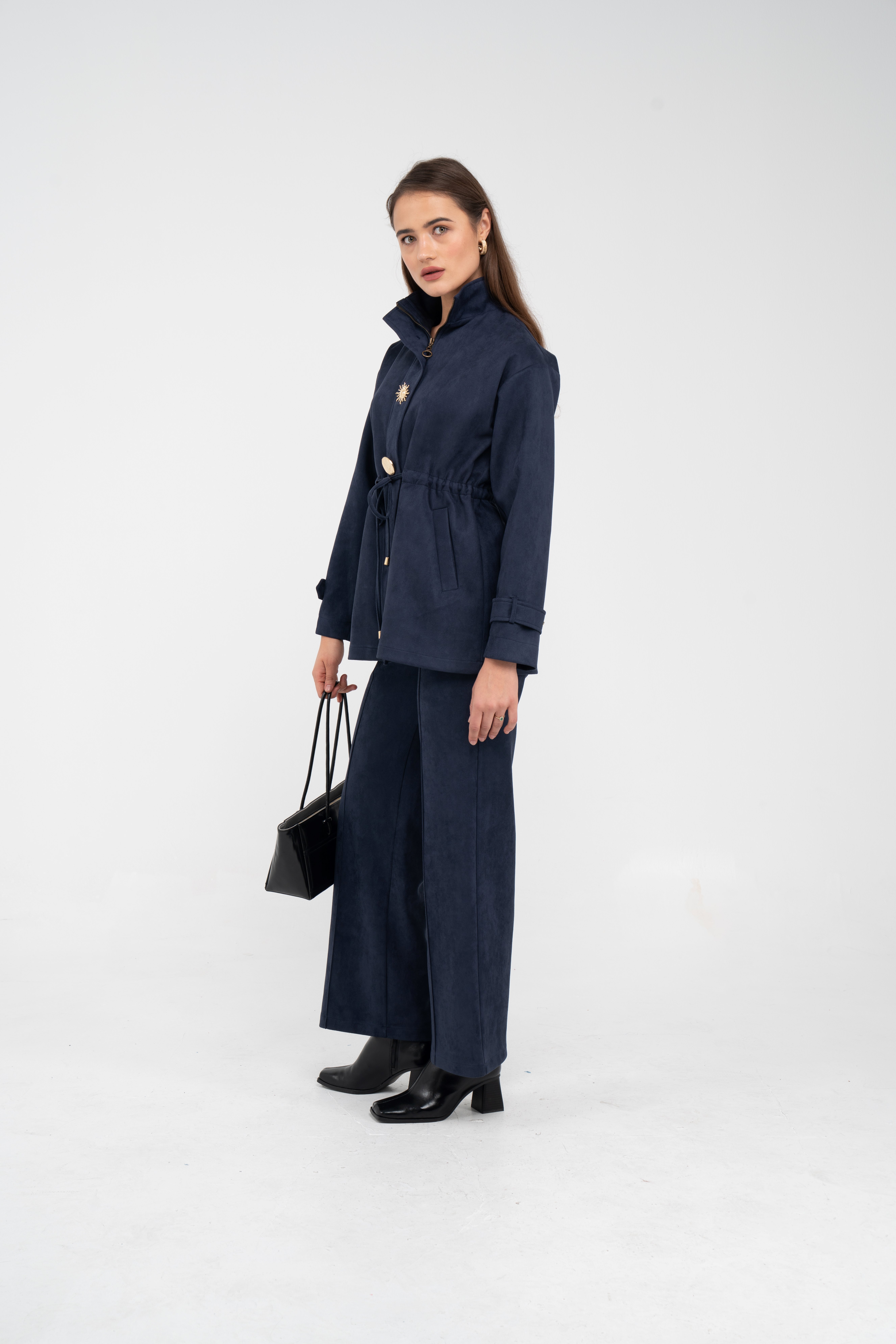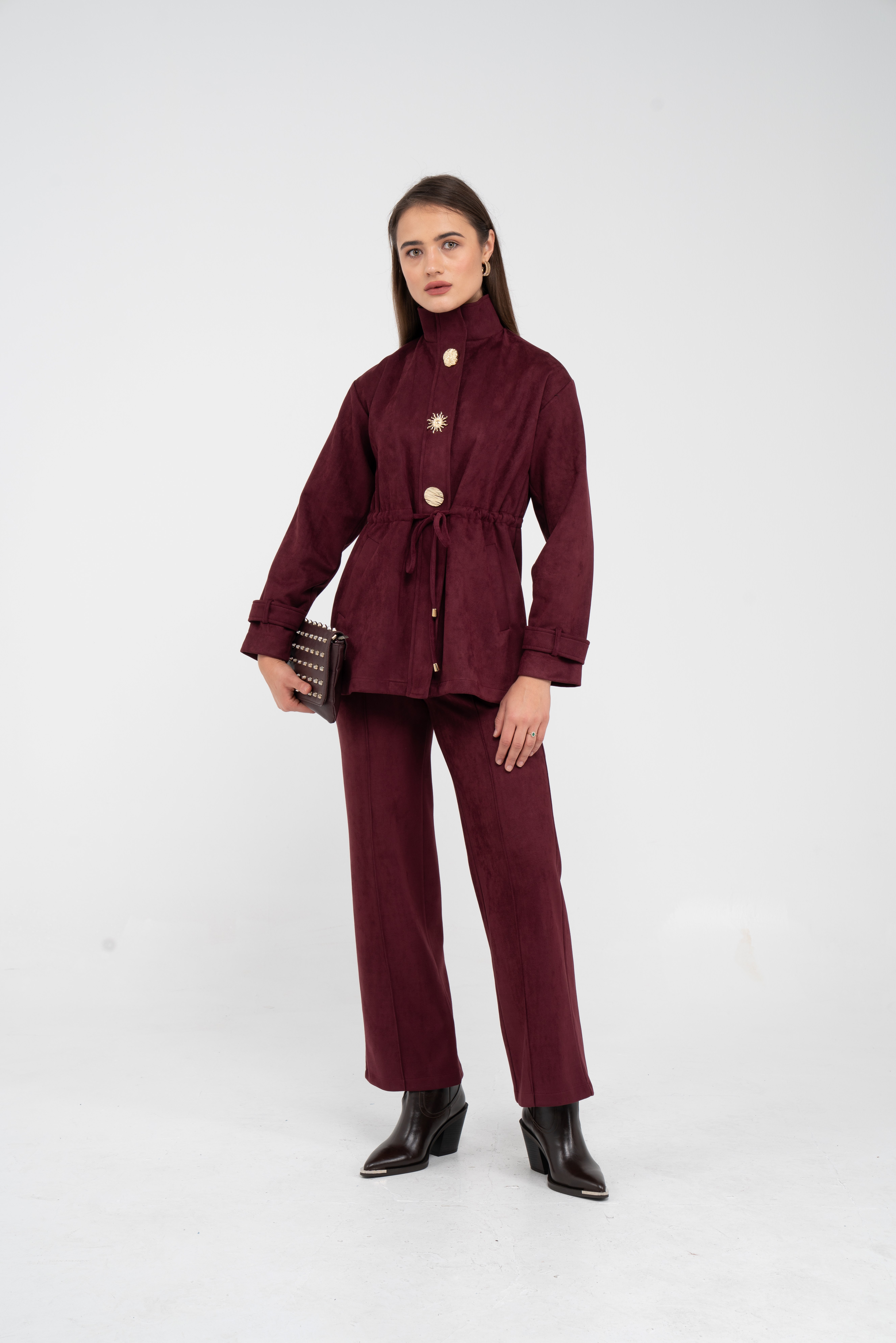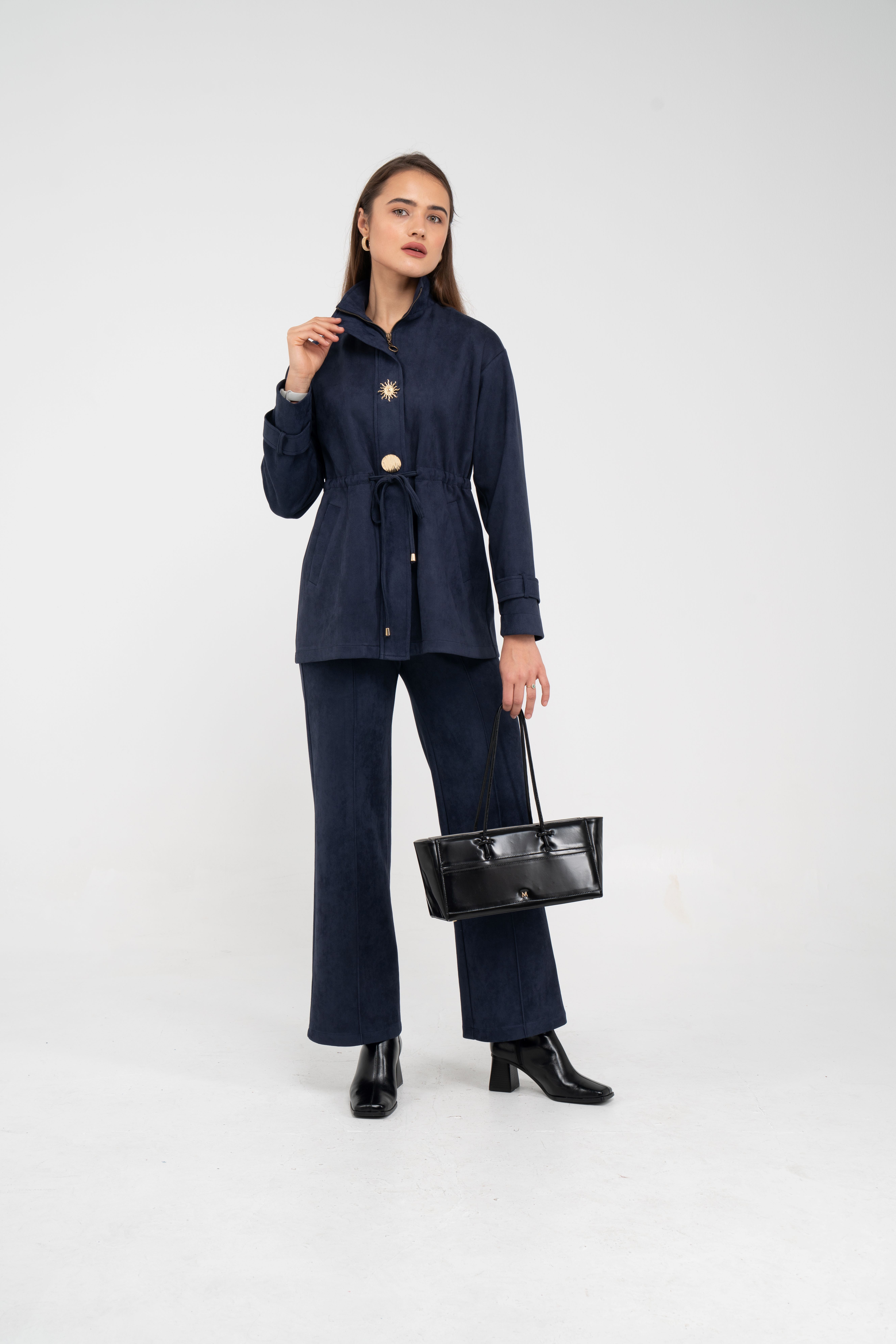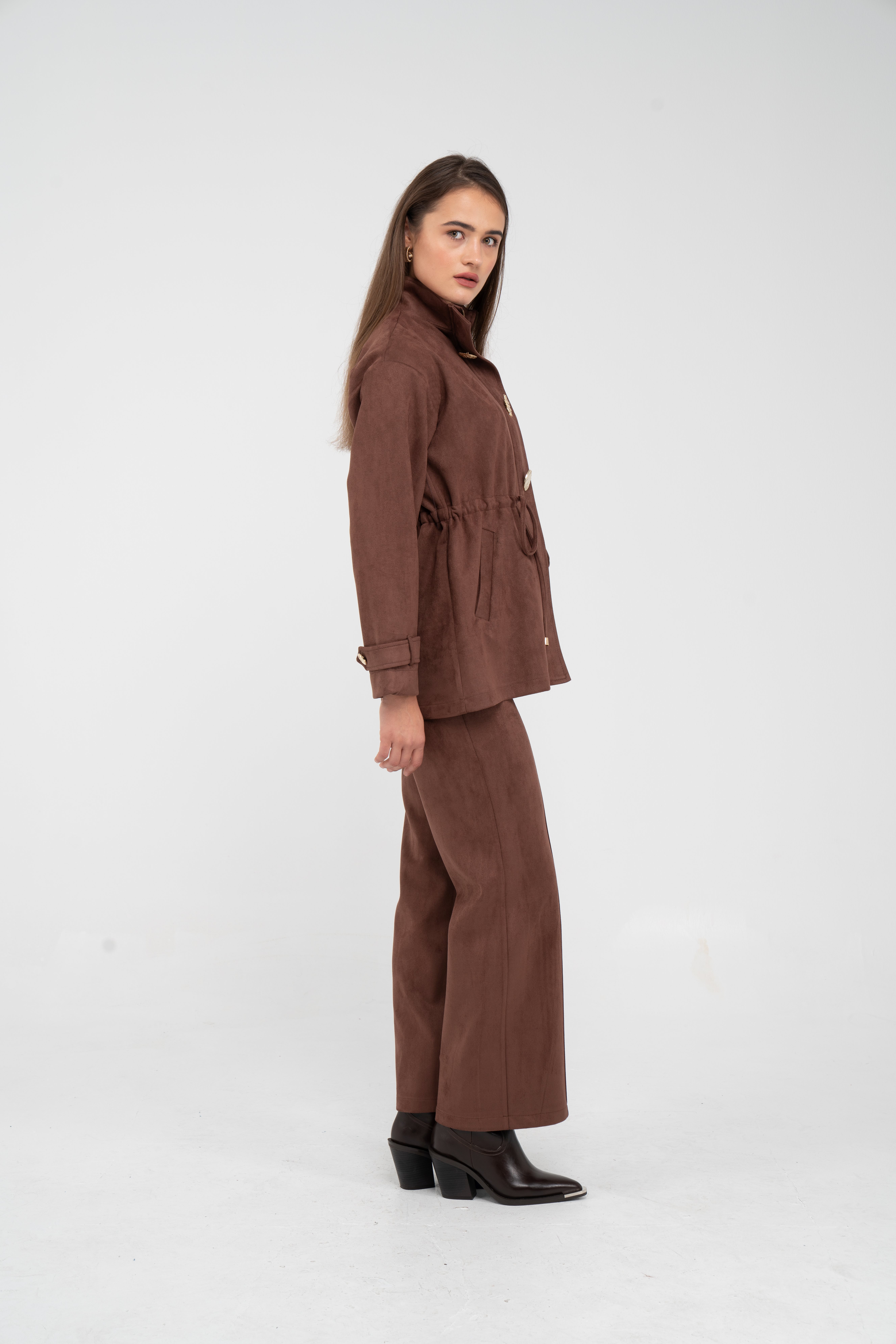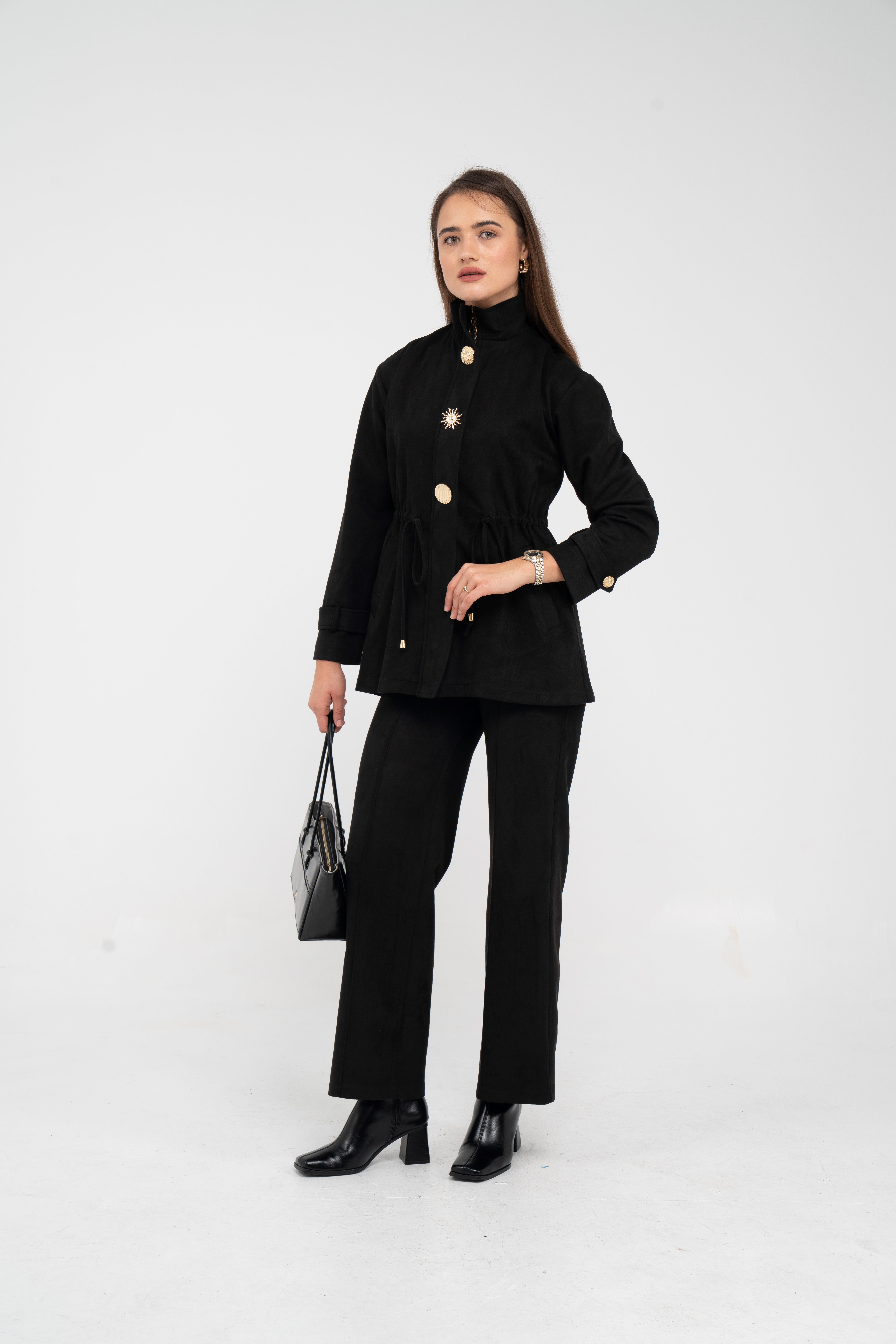 Gelince Haber VerDikkat çeken bu süet dokulu kadın takım, rahatlığın ve şıklığın kusursuz birleşimini sunar. Üst kısmındaki yüksek yaka formu, altın düğme detayları ve ayarlanabilir bel bağı sayesinde hem modern hem de zarif bir siluet oluşturur. Kumaşın yumuşak dokusu gün boyu konfor sağlarken, kesimin akıcı yapısı hareket özgürlüğü sunar.