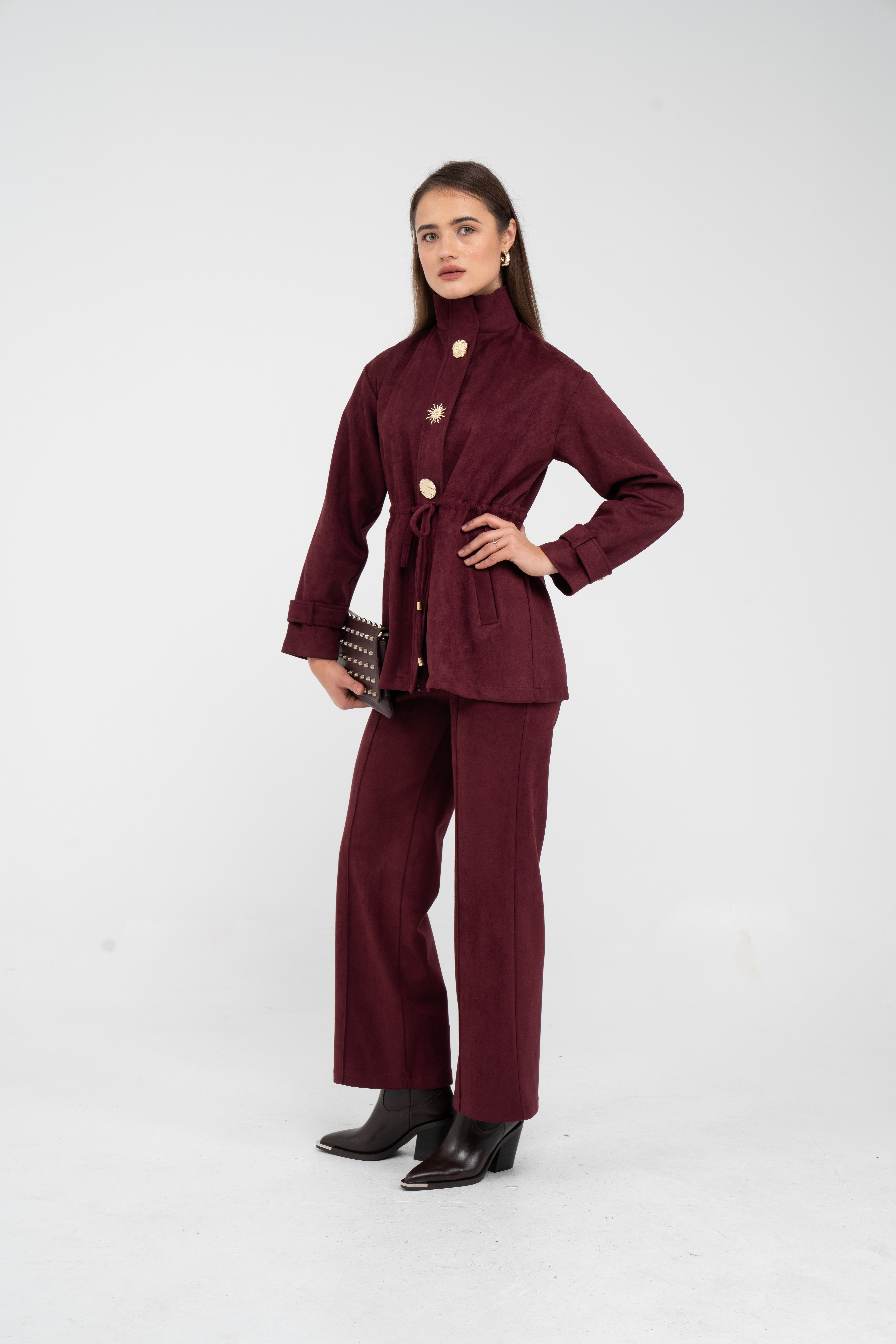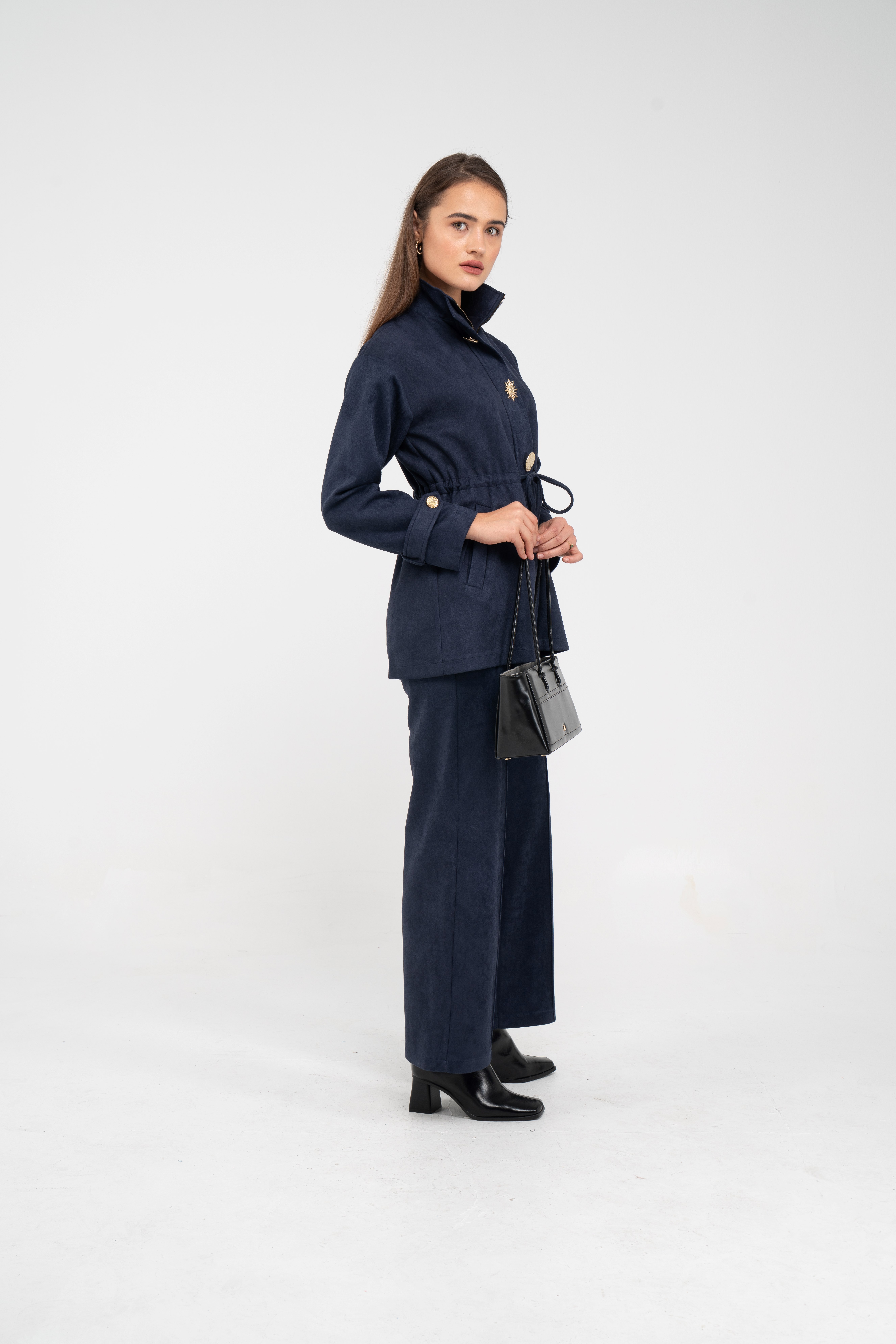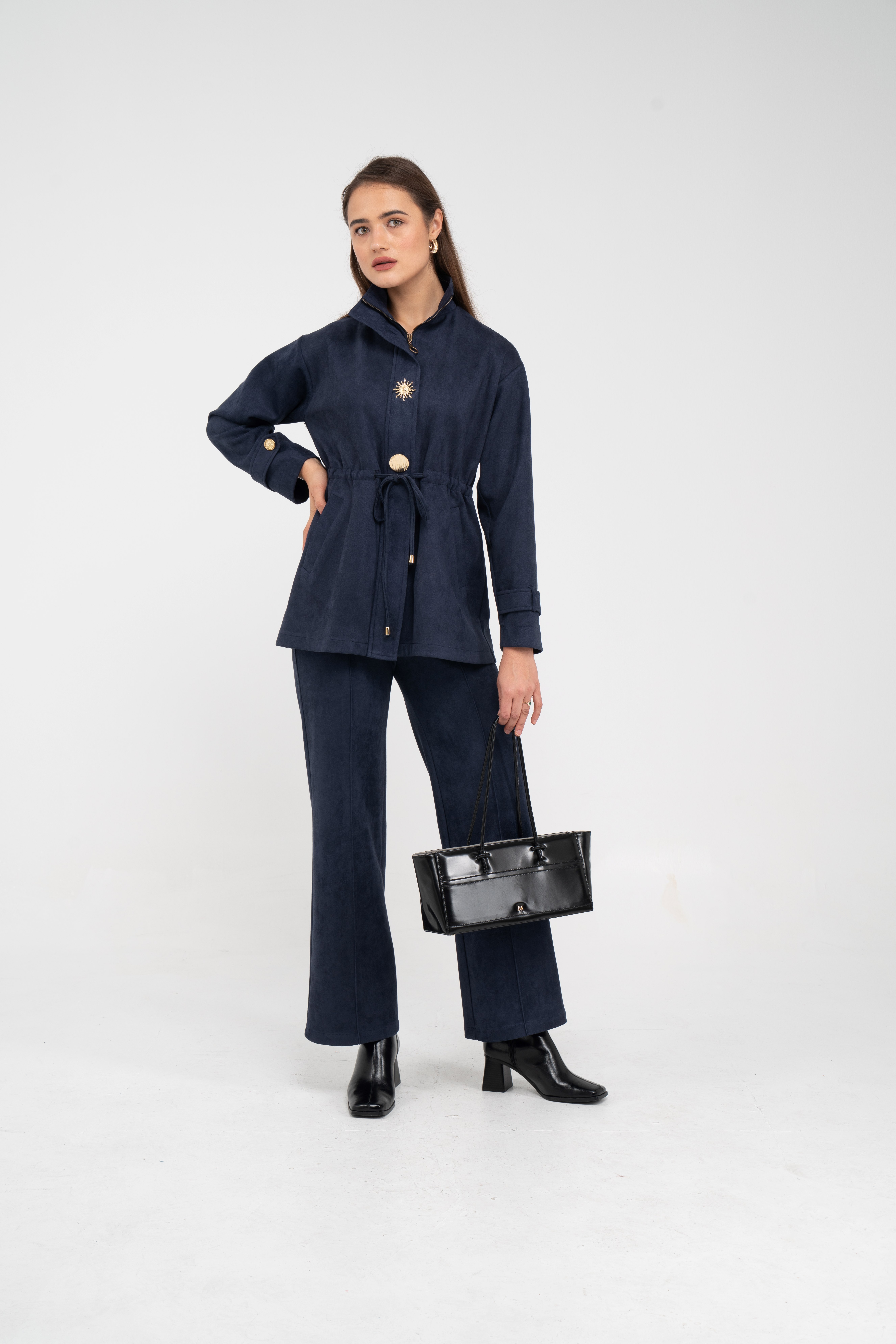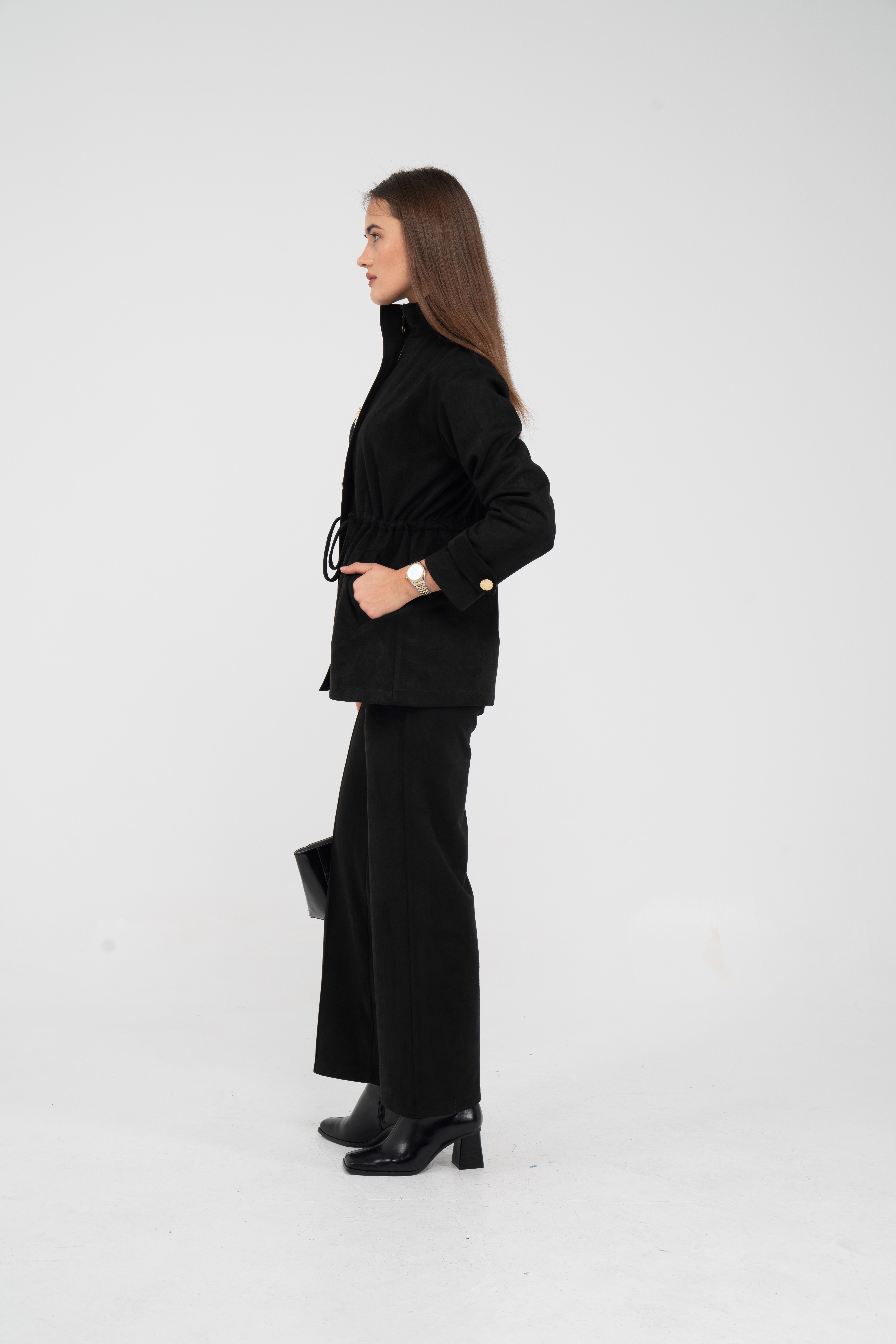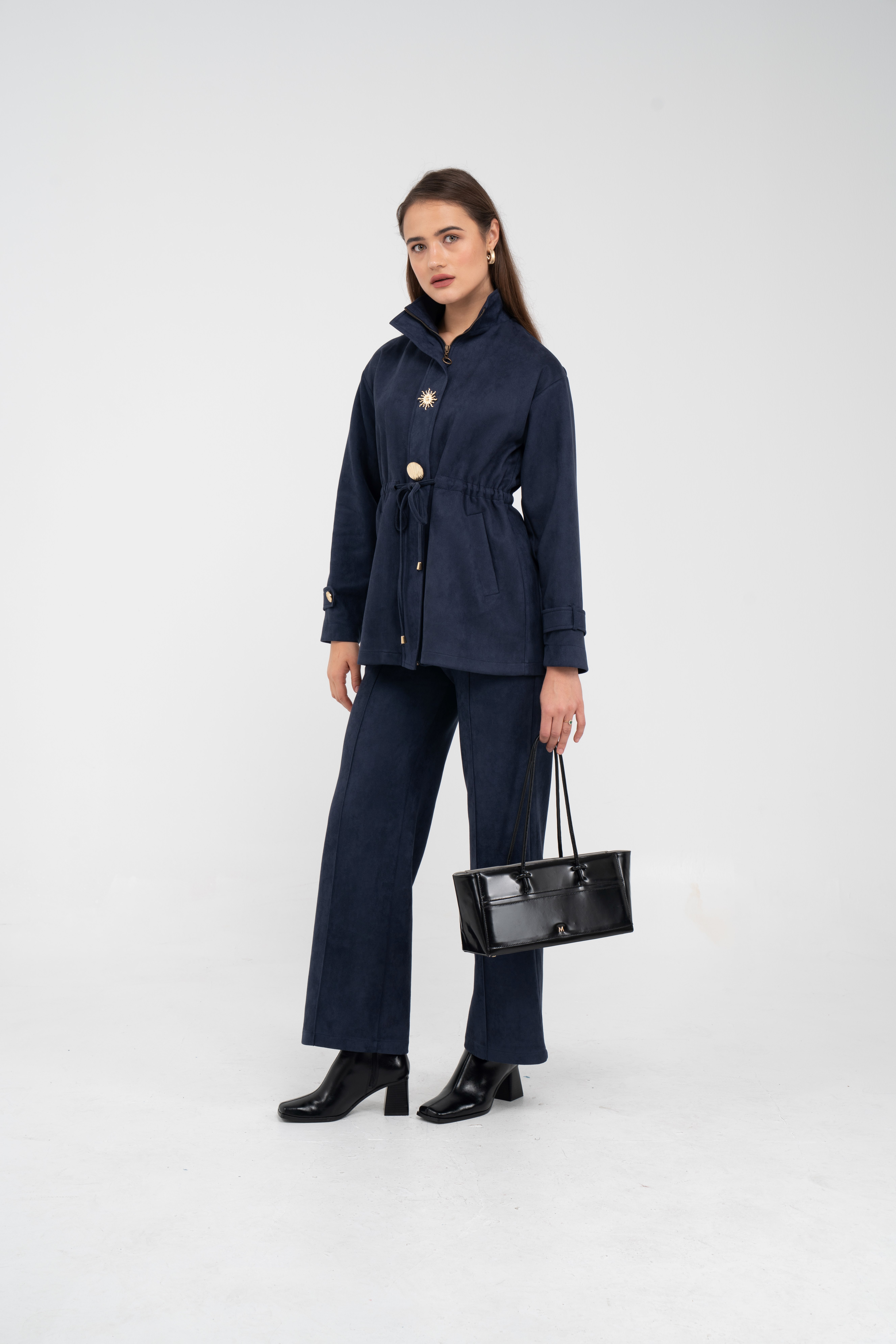 Gelince Haber VerDikkat çeken bu süet dokulu kadın takım, rahatlığın ve şıklığın kusursuz birleşimini sunar. Üst kısmındaki yüksek yaka formu, altın düğme detayları ve ayarlanabilir bel bağı sayesinde hem modern hem de zarif bir siluet oluşturur. Kumaşın yumuşak dokusu gün boyu konfor sağlarken, kesimin akıcı yapısı hareket özgürlüğü sunar.