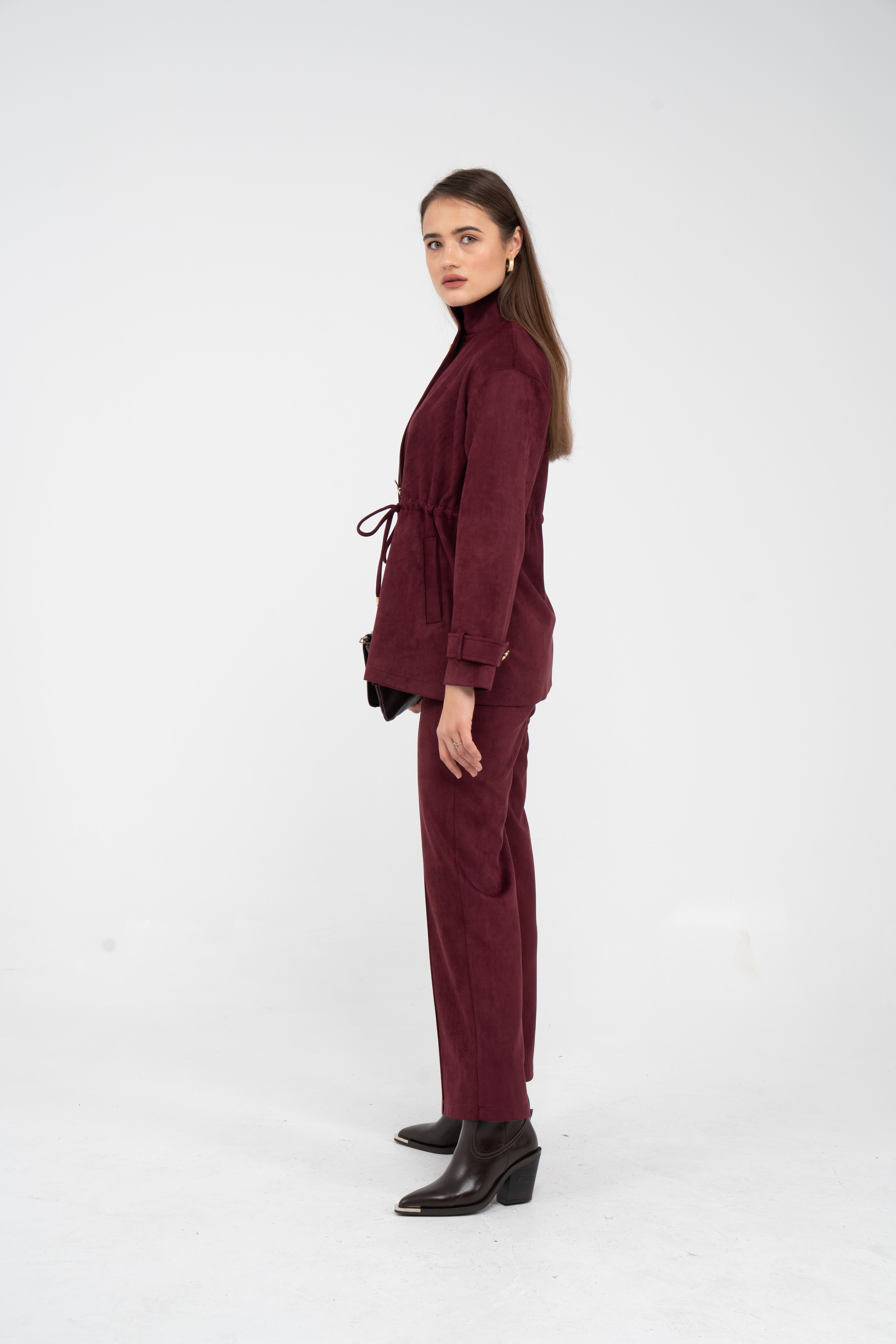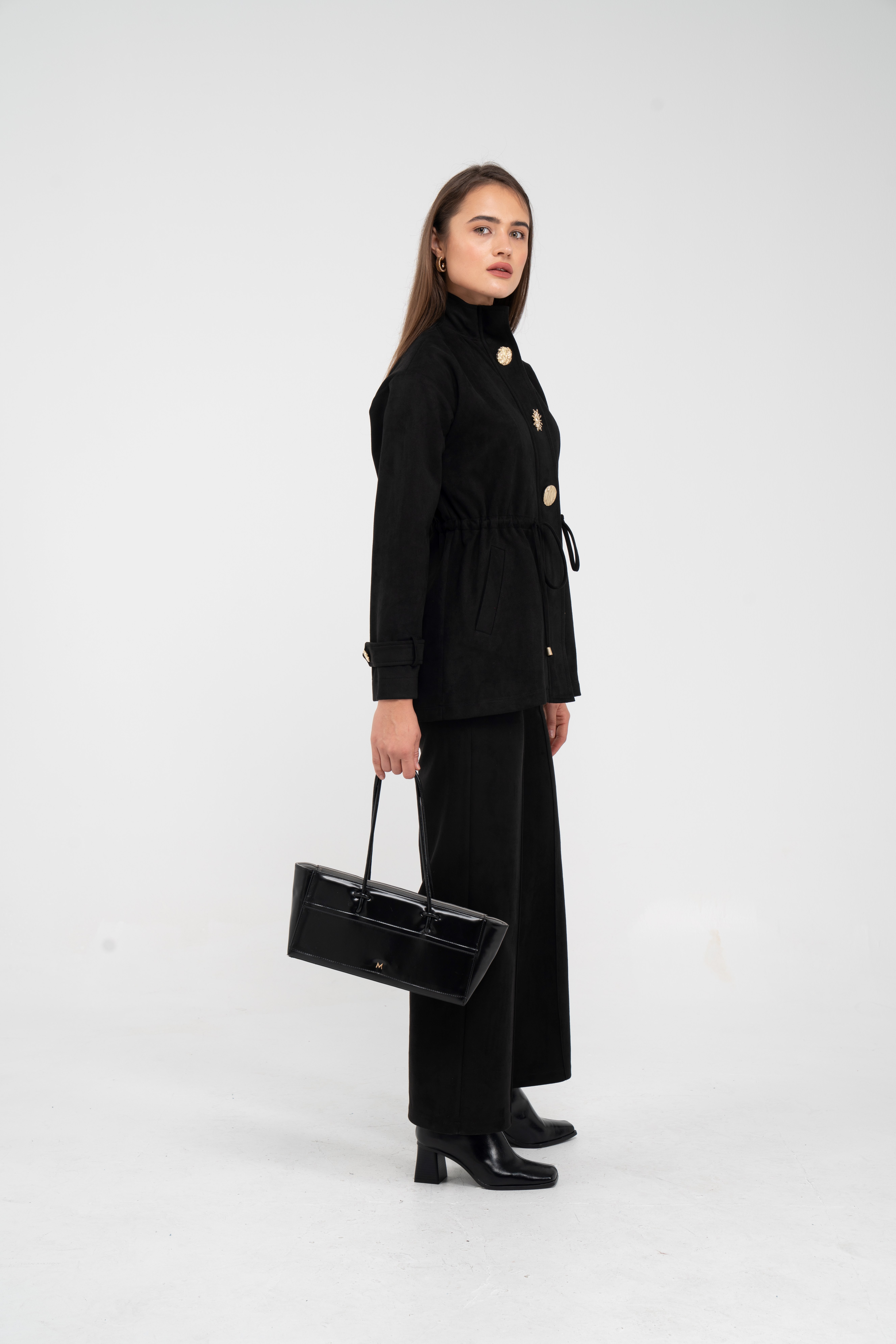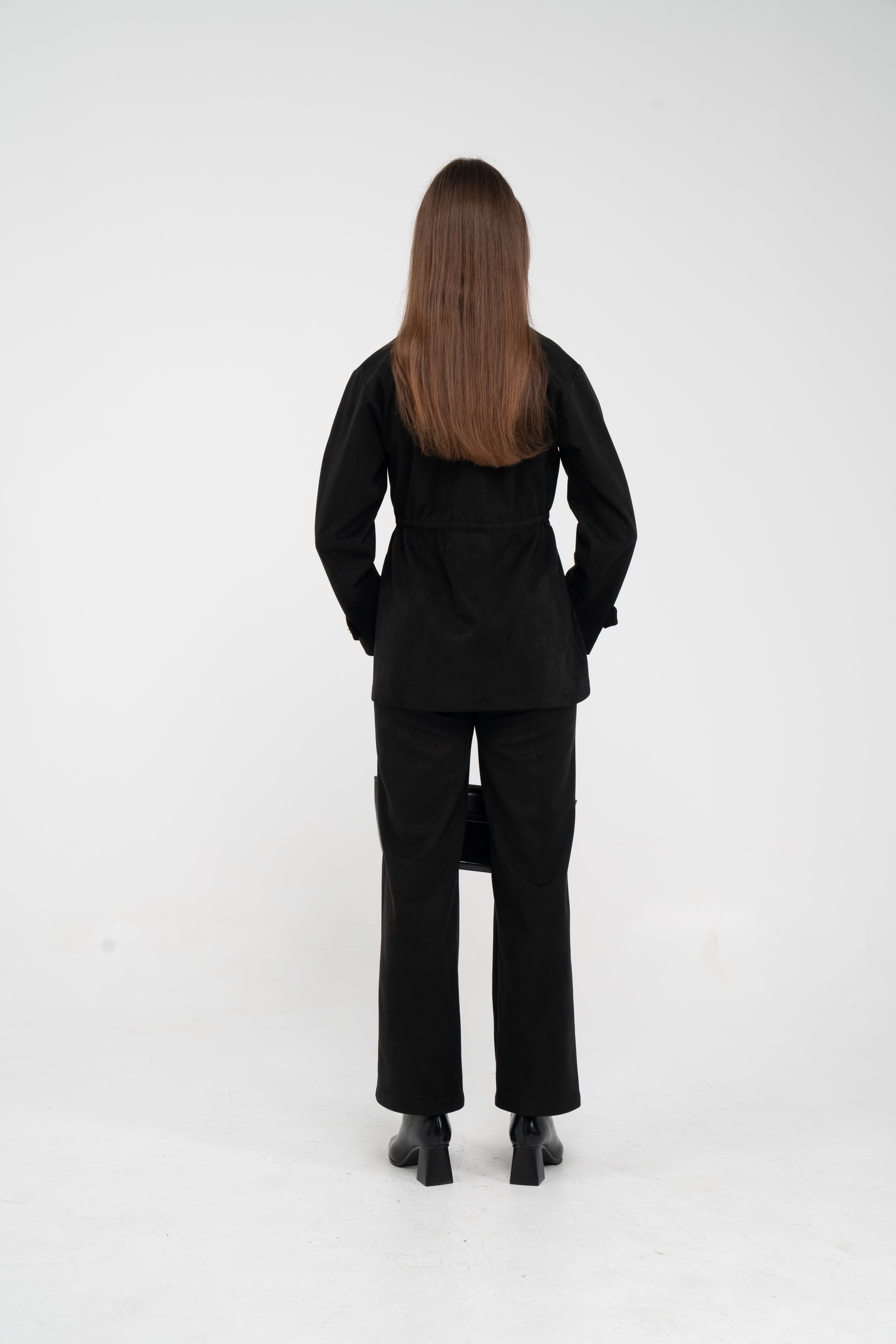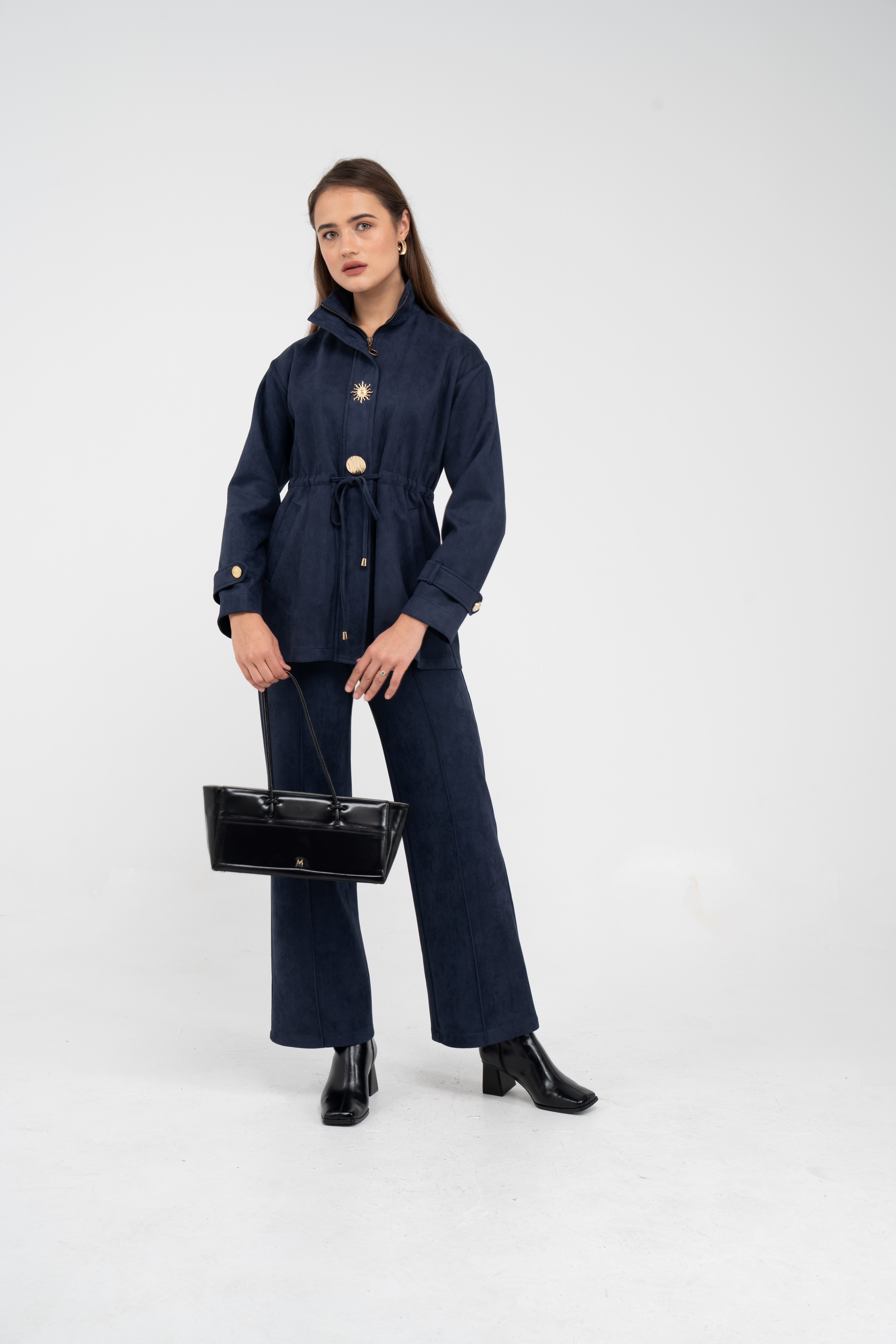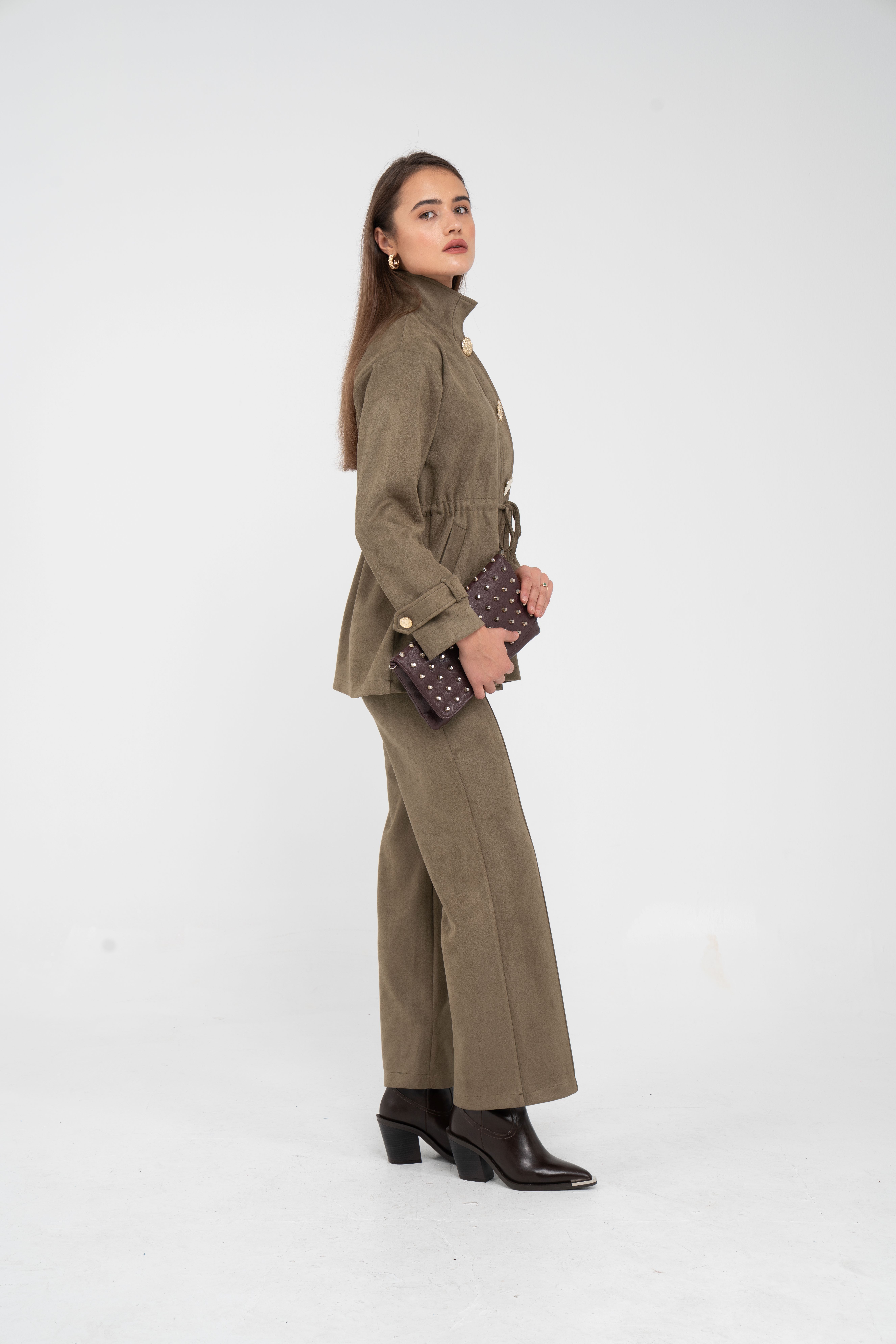 Gelince Haber VerDikkat çeken bu süet dokulu kadın takım, rahatlığın ve şıklığın kusursuz birleşimini sunar. Üst kısmındaki yüksek yaka formu, altın düğme detayları ve ayarlanabilir bel bağı sayesinde hem modern hem de zarif bir siluet oluşturur. Kumaşın yumuşak dokusu gün boyu konfor sağlarken, kesimin akıcı yapısı hareket özgürlüğü sunar.