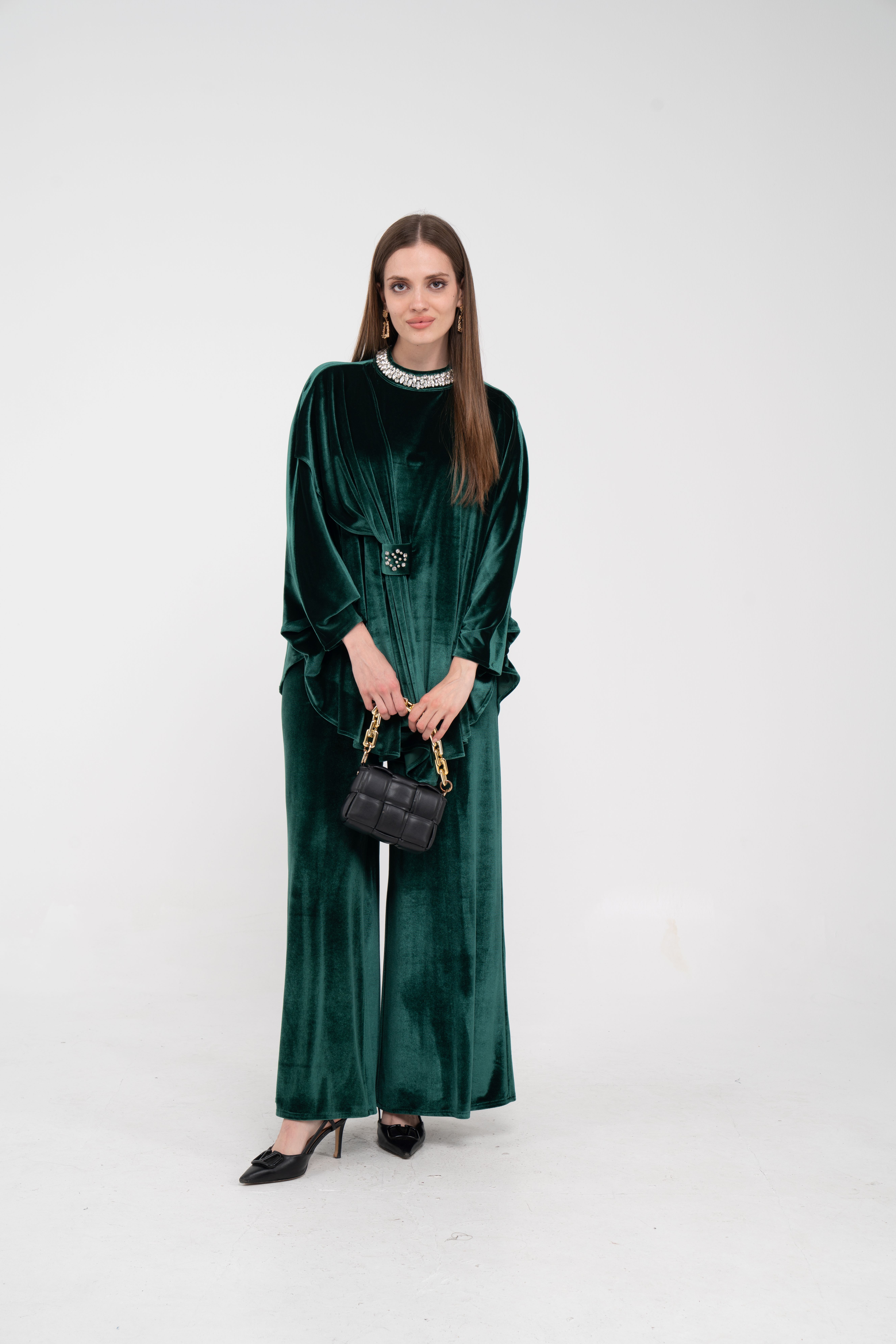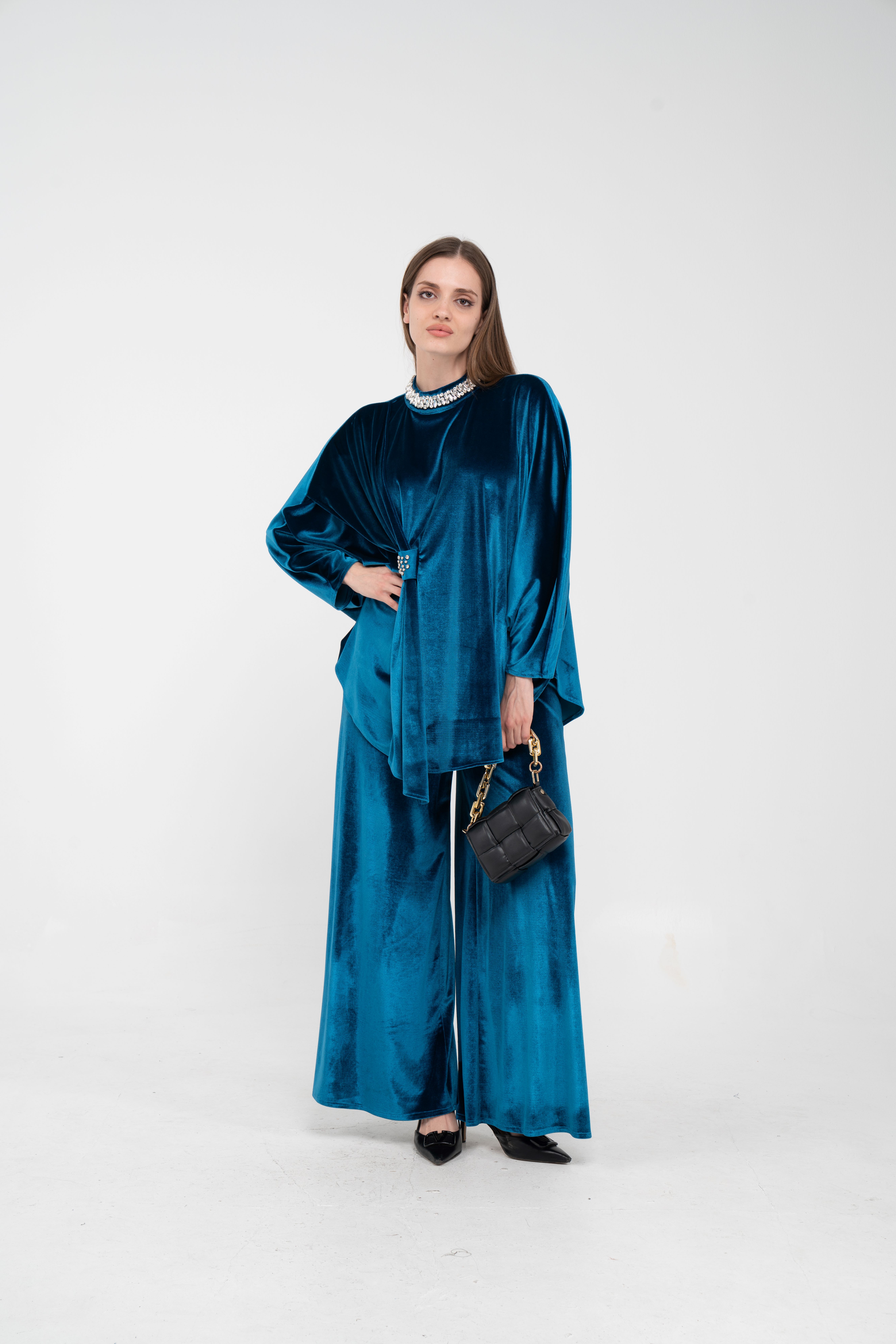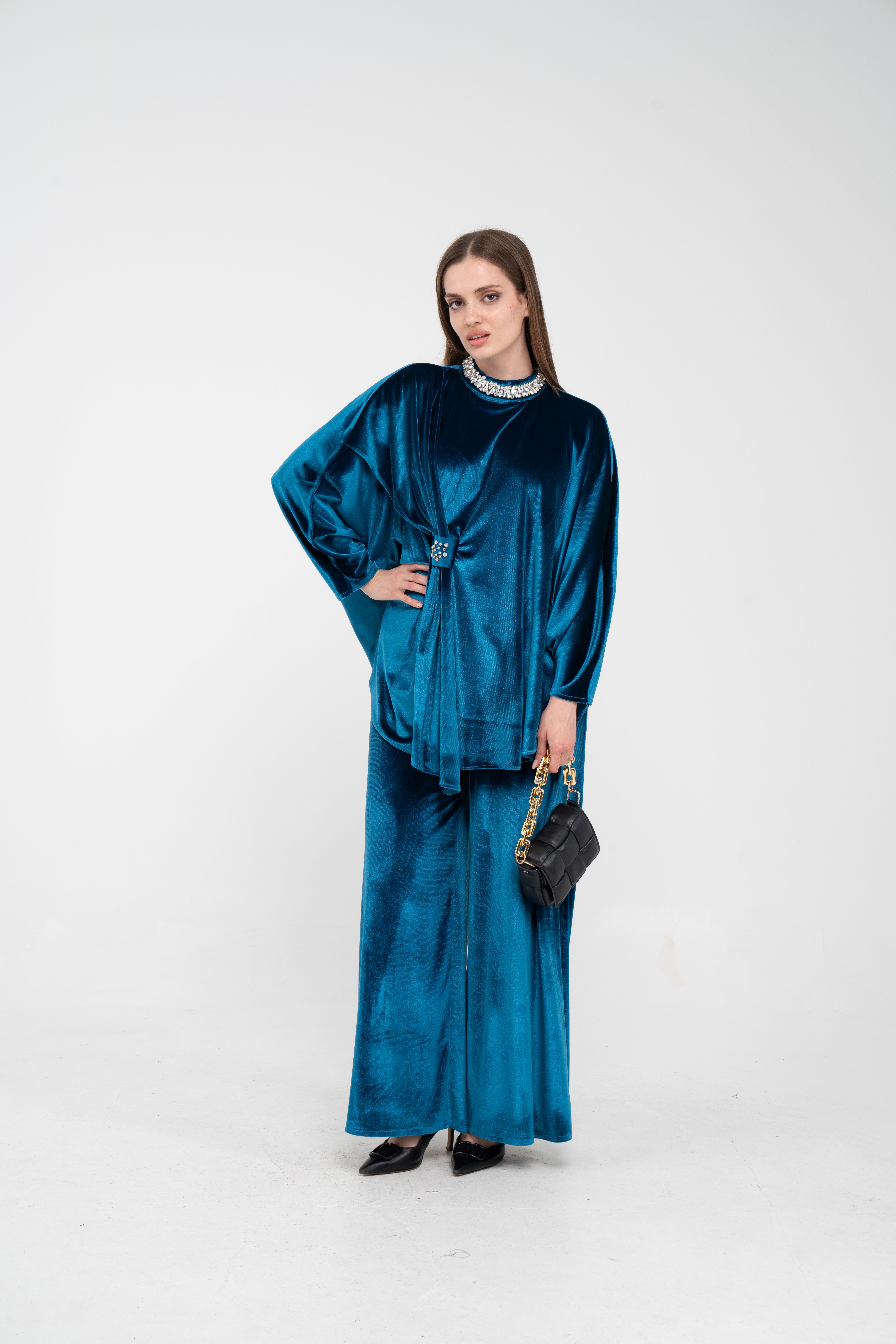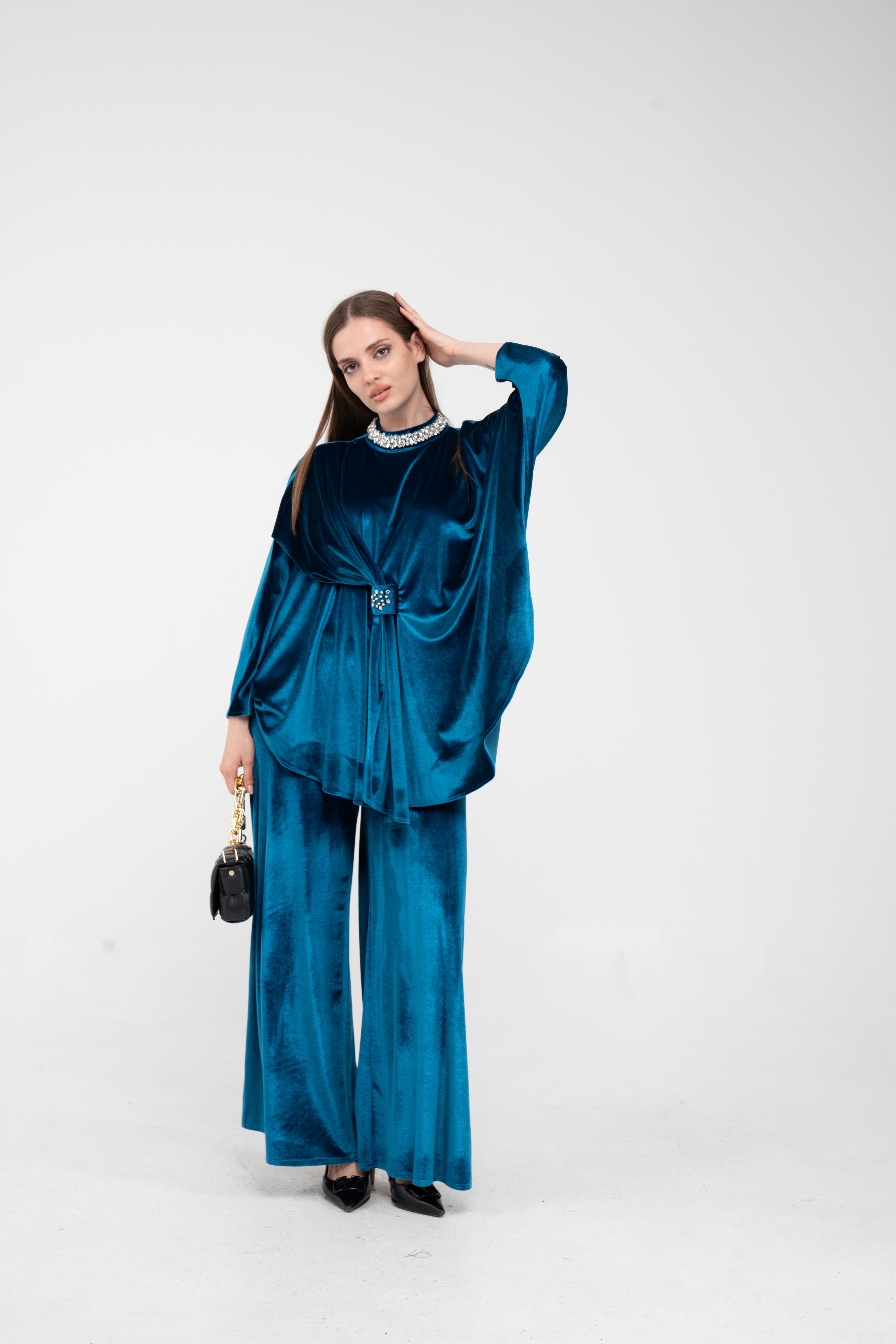 Omuzdan dökümlü geniş formu, vücut hatlarını zarifçe örterken, ön kısmındaki taş tokalı detay tasarıma modern bir ışıltı katar. Yakadaki taş işlemeler ise bu takımı özel davetler, akşam yemekleri ve kutlamalar için mükemmel bir seçenek haline getirir.