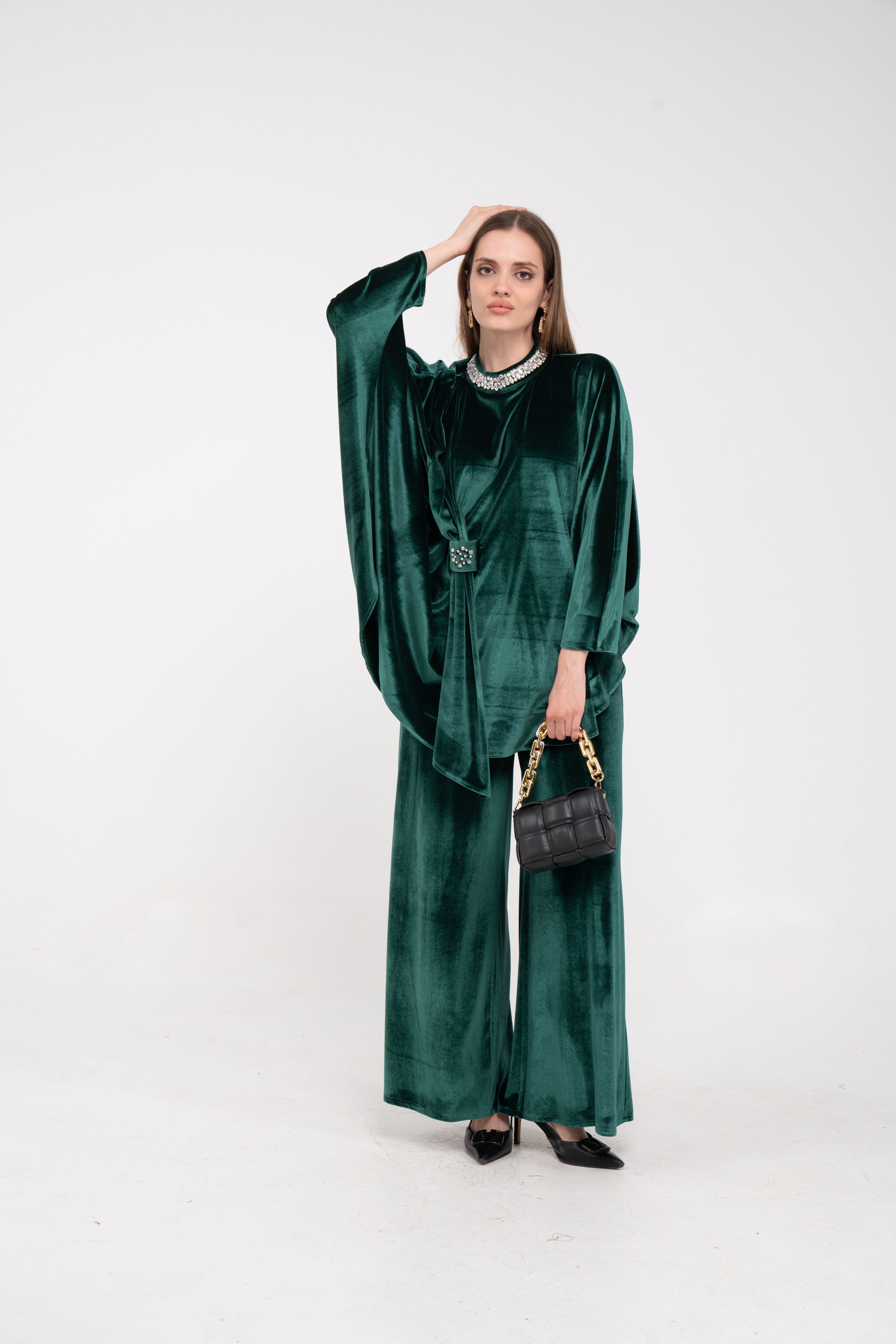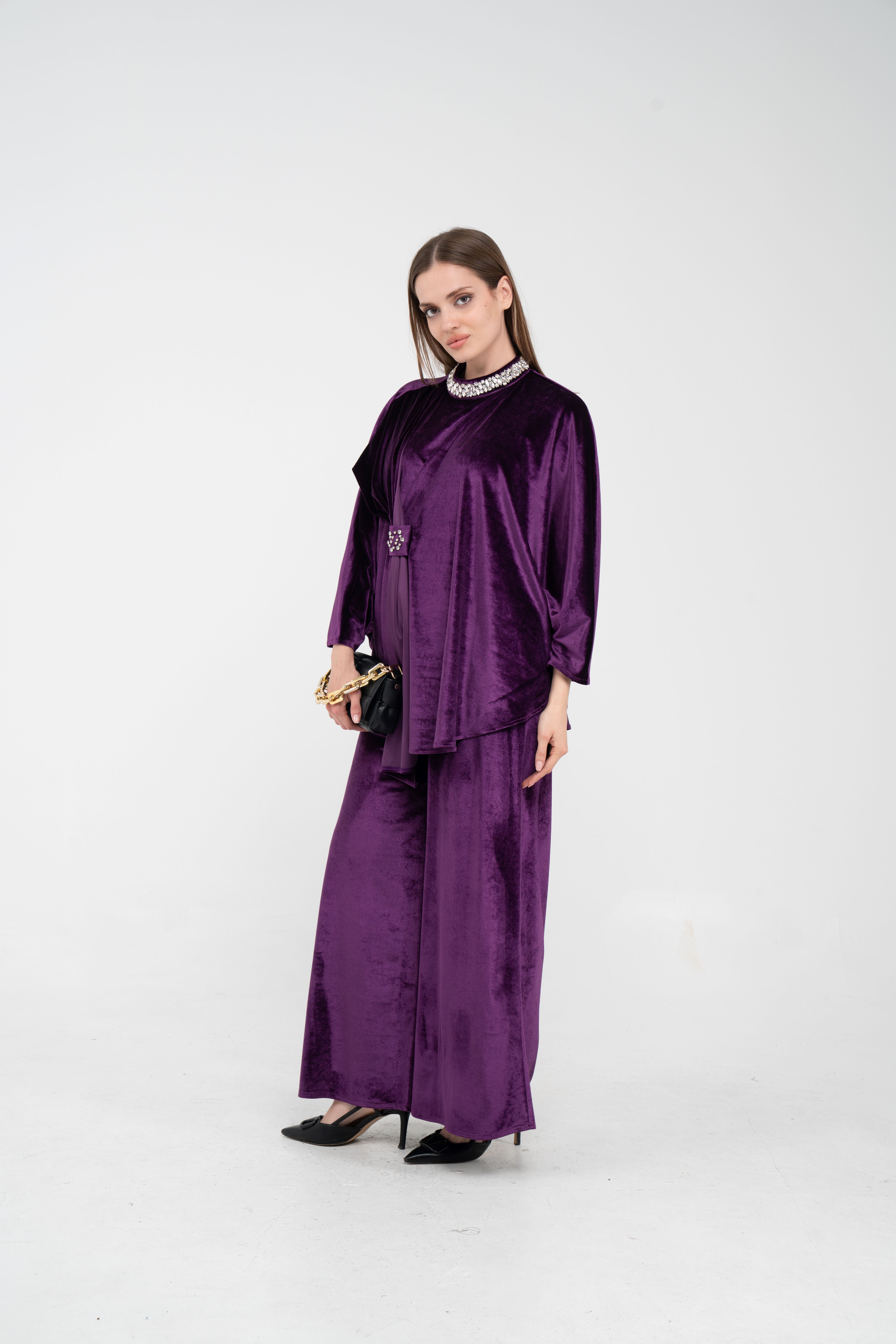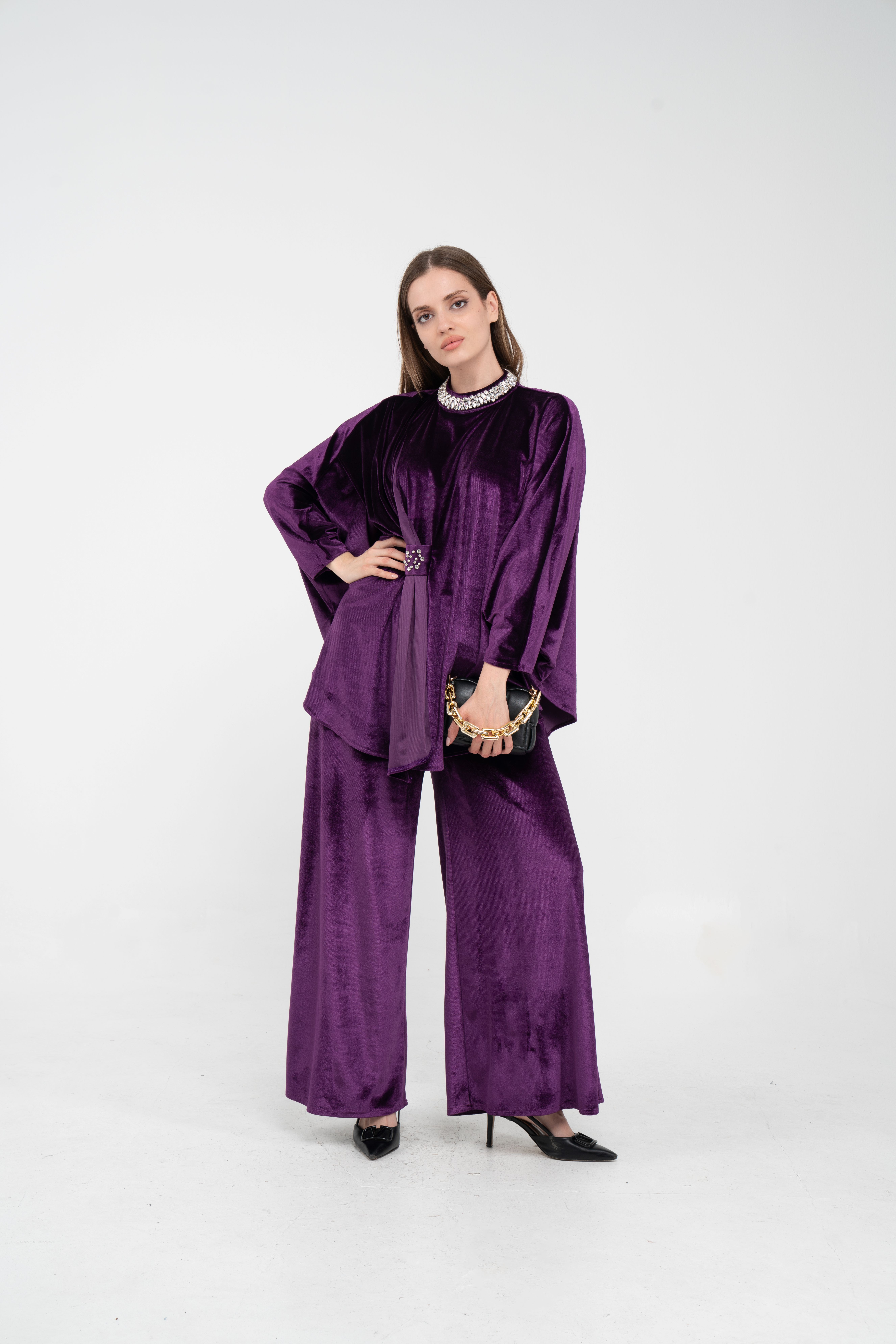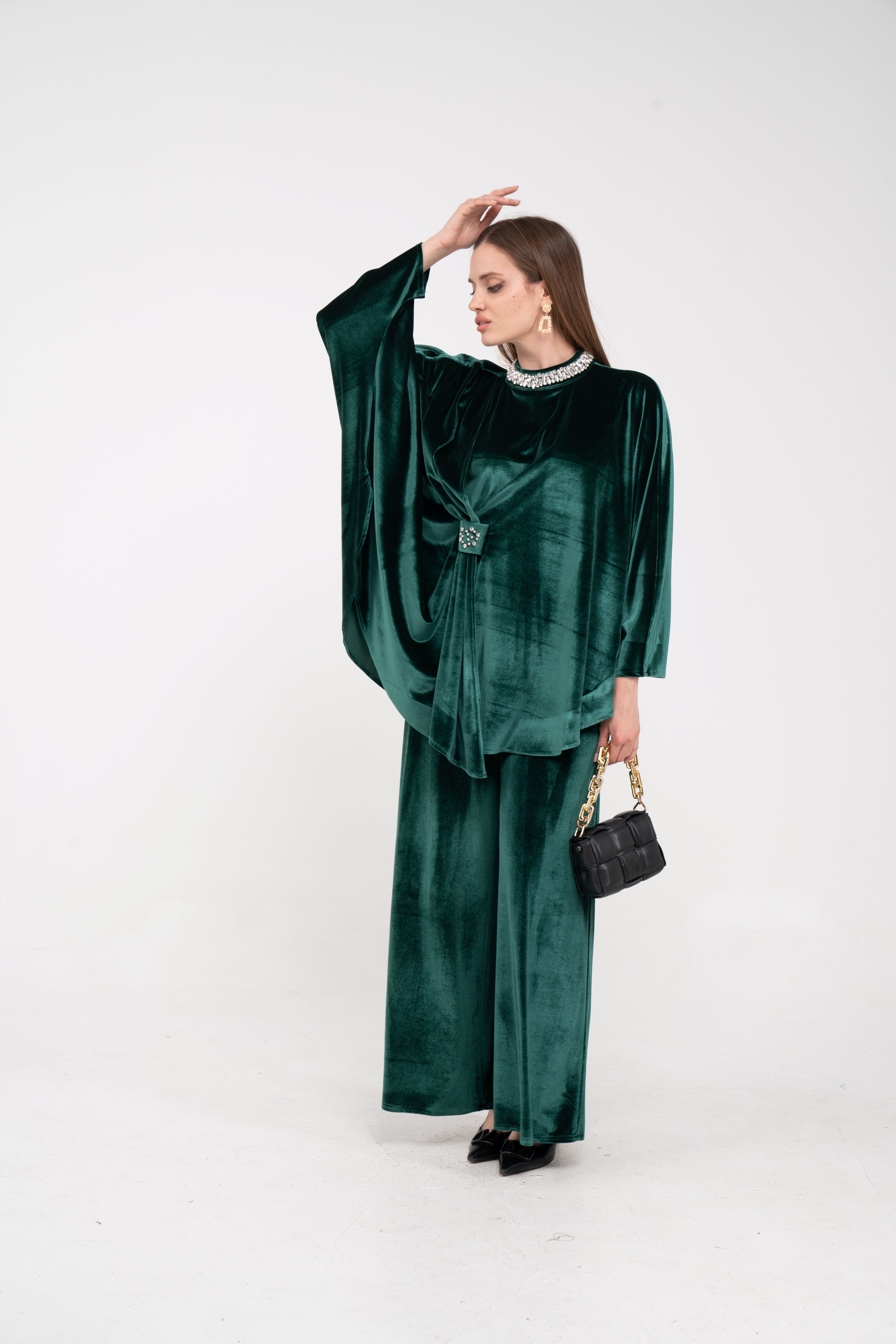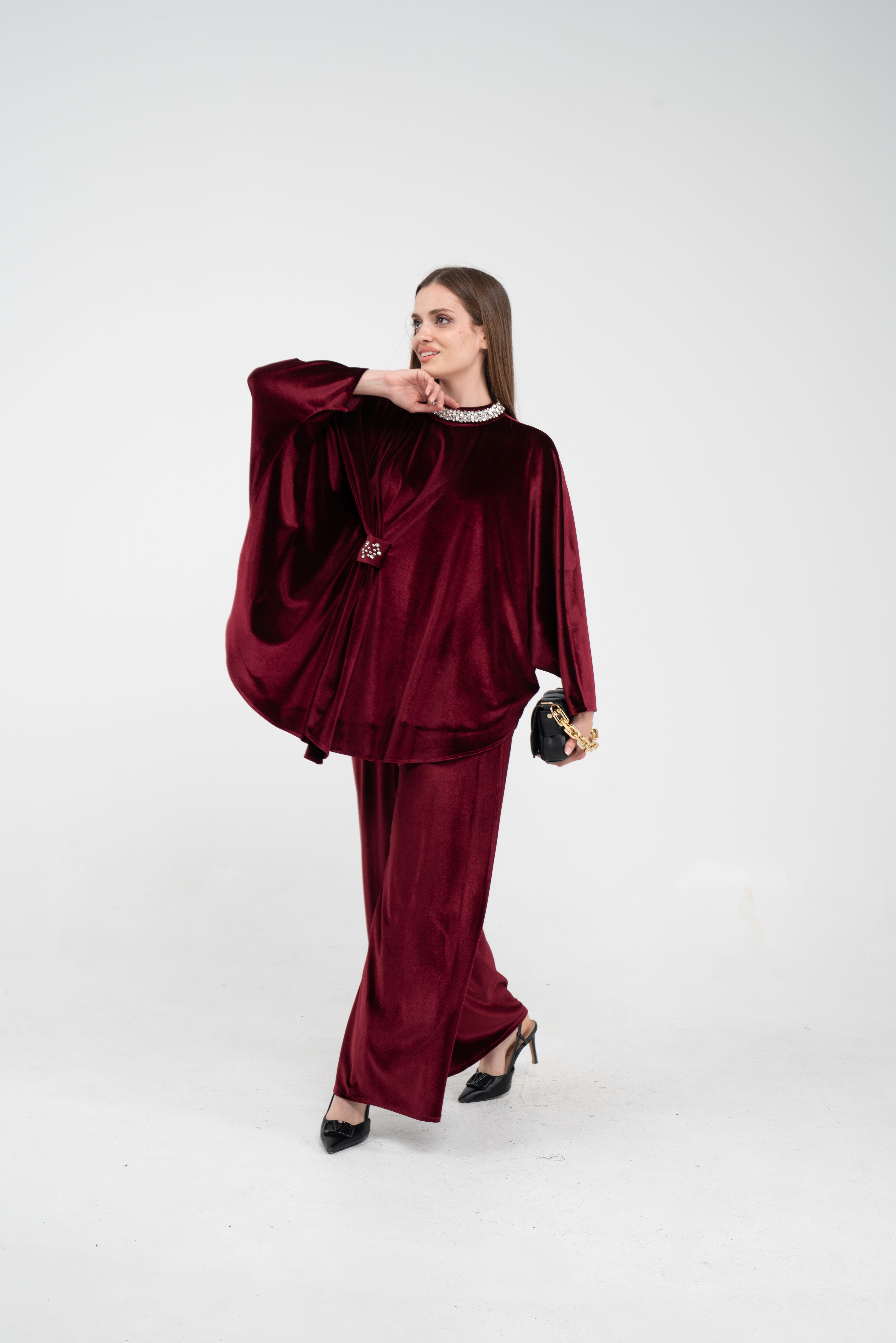 Omuzdan dökümlü geniş formu, vücut hatlarını zarifçe örterken, ön kısmındaki taş tokalı detay tasarıma modern bir ışıltı katar. Yakadaki taş işlemeler ise bu takımı özel davetler, akşam yemekleri ve kutlamalar için mükemmel bir seçenek haline getirir.