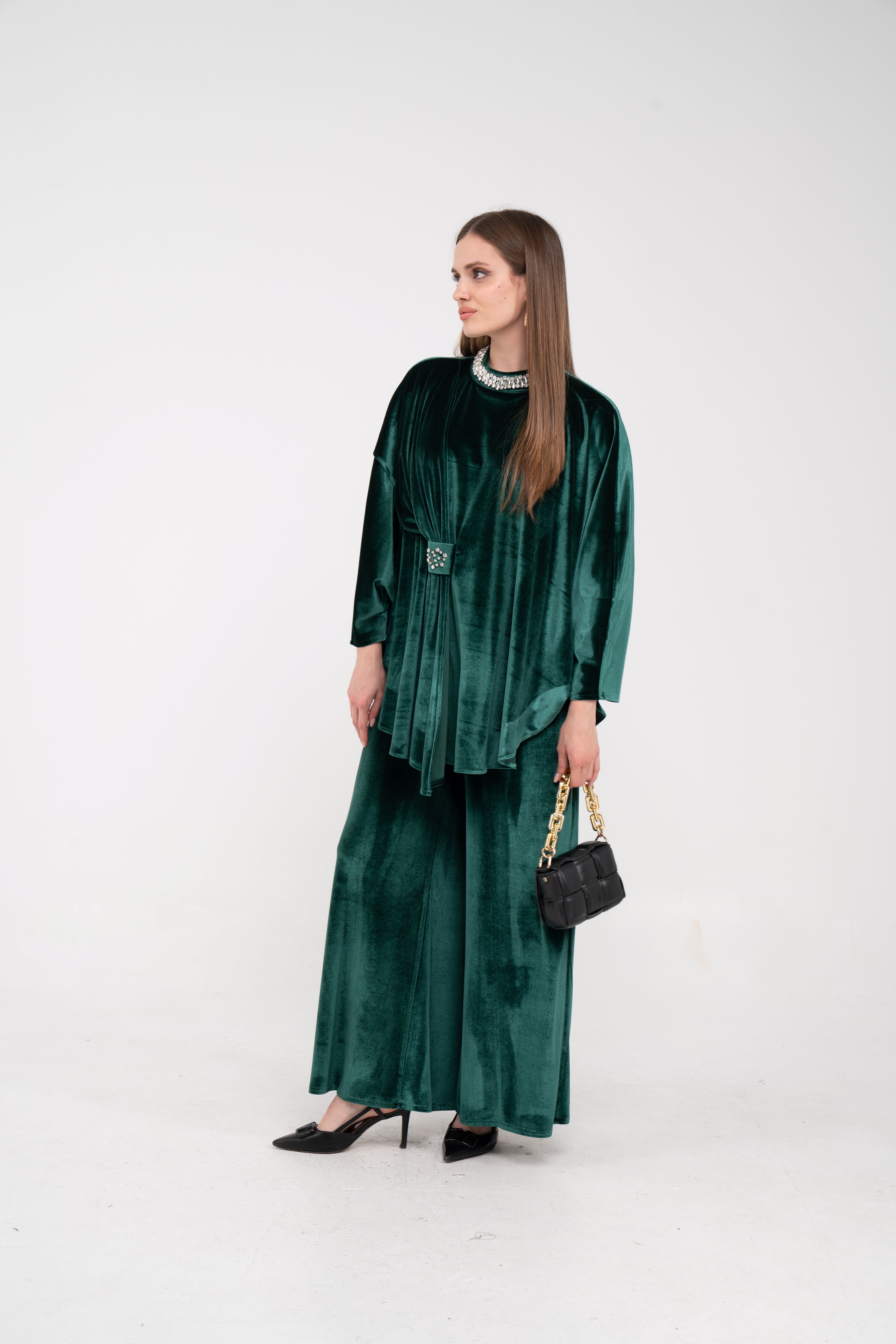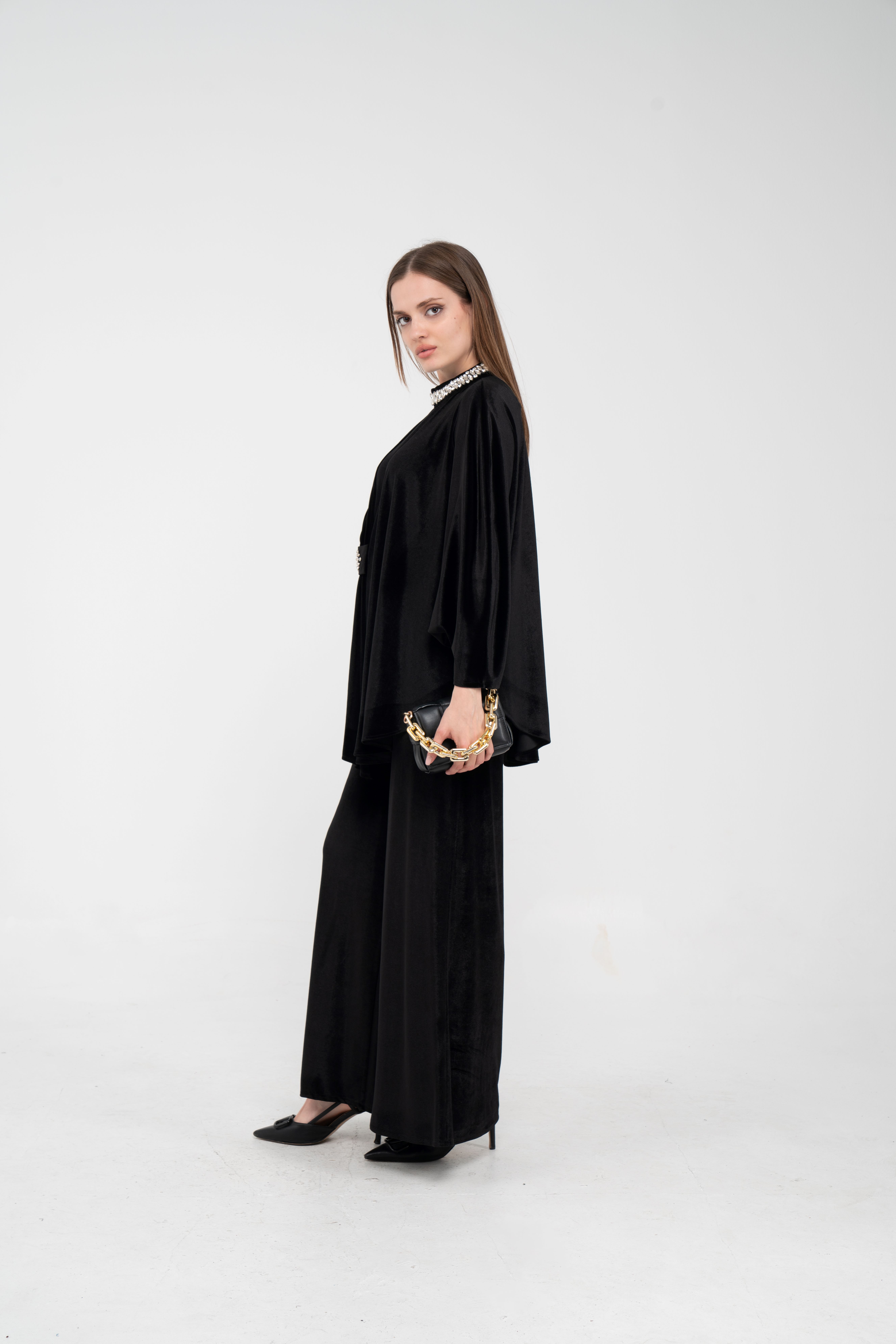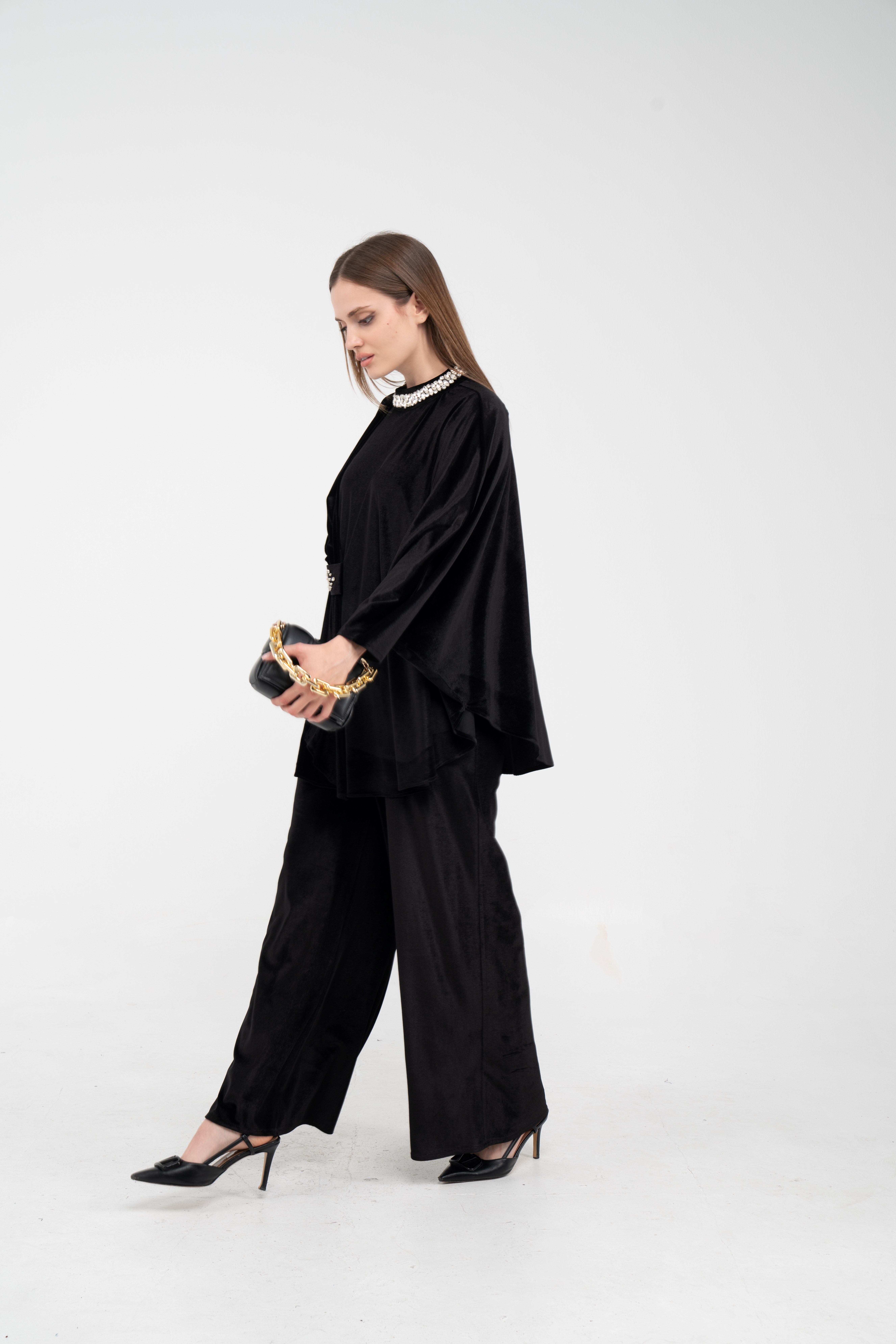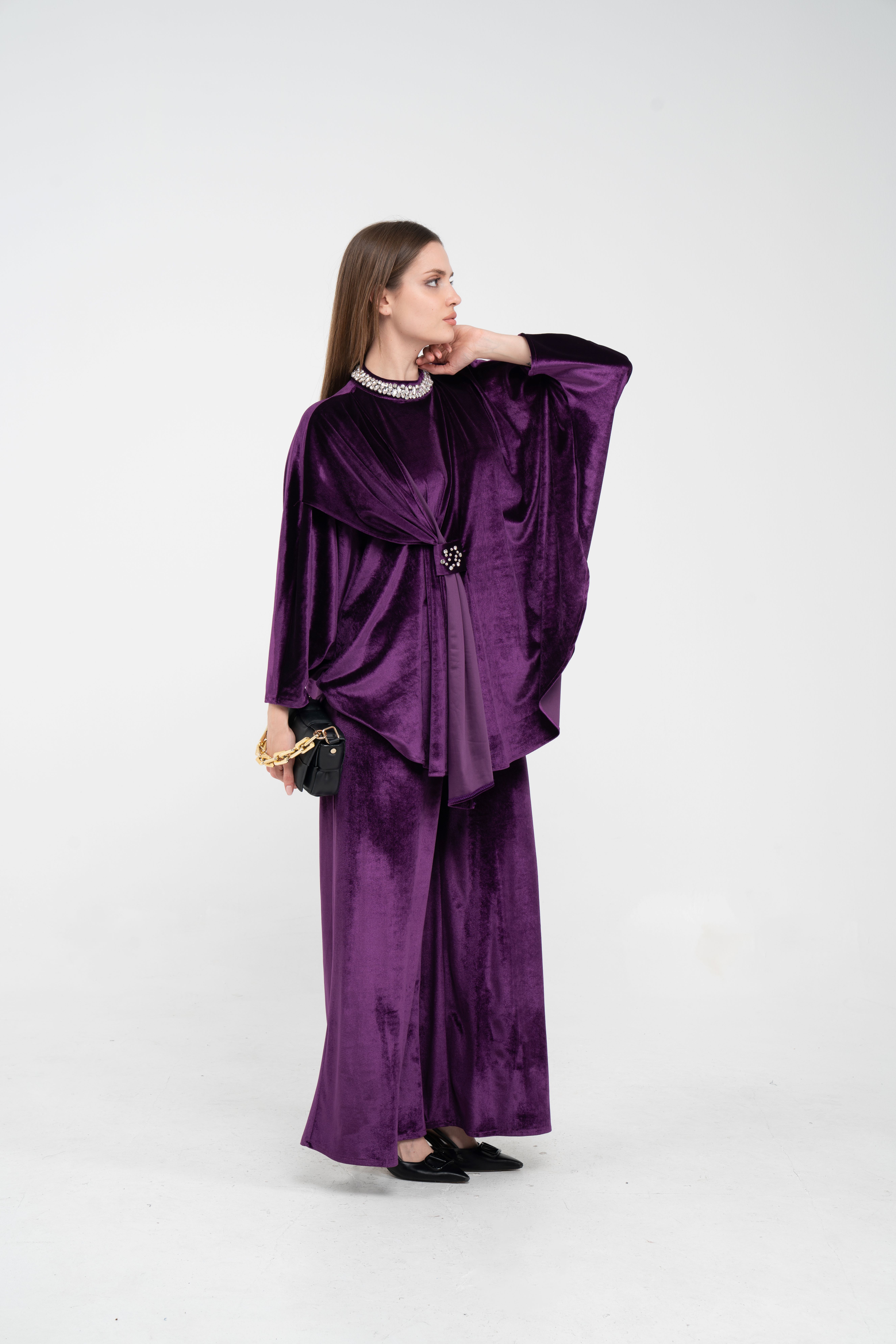Omuzdan dökümlü geniş formu, vücut hatlarını zarifçe örterken, ön kısmındaki taş tokalı detay tasarıma modern bir ışıltı katar. Yakadaki taş işlemeler ise bu takımı özel davetler, akşam yemekleri ve kutlamalar için mükemmel bir seçenek haline getirir.