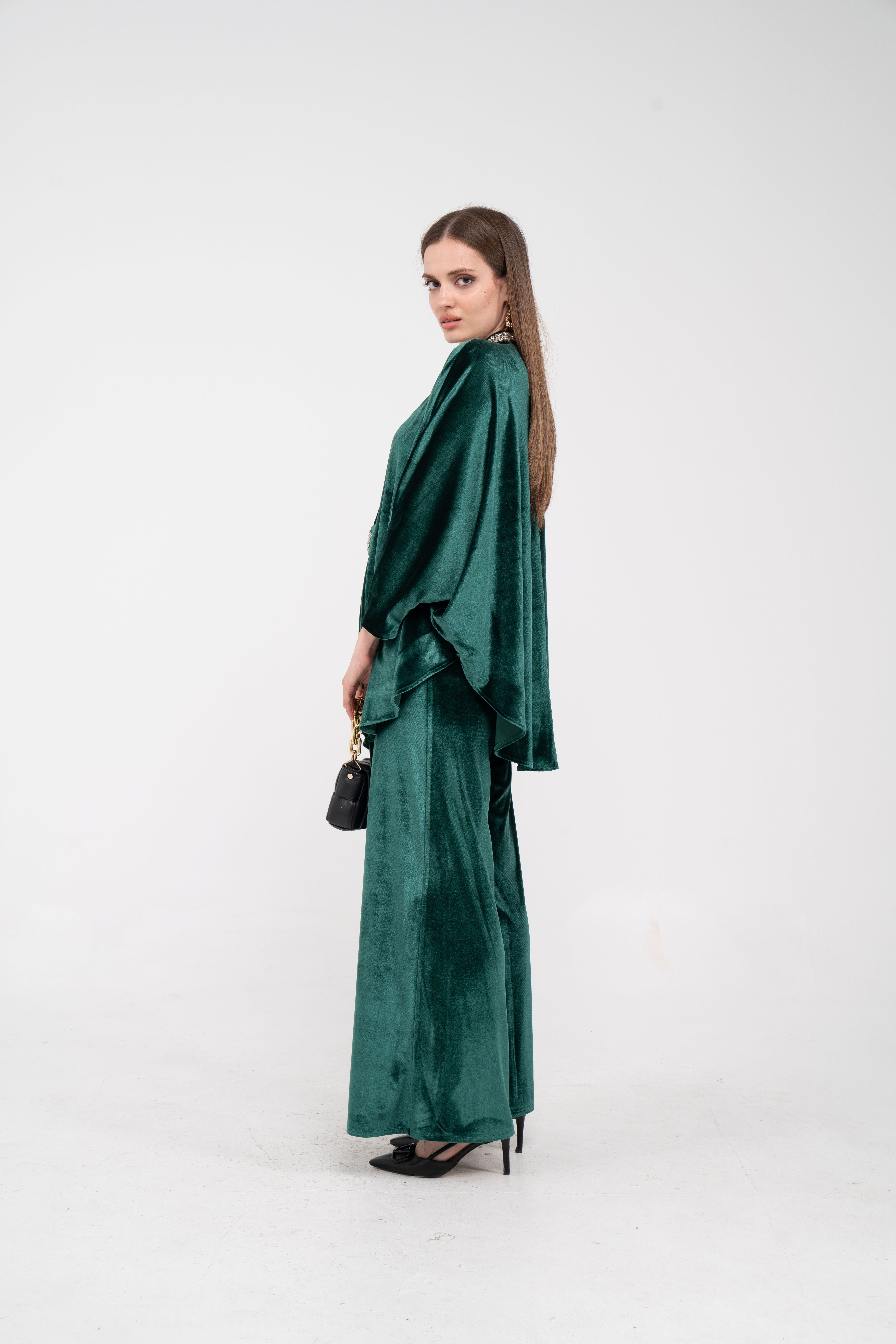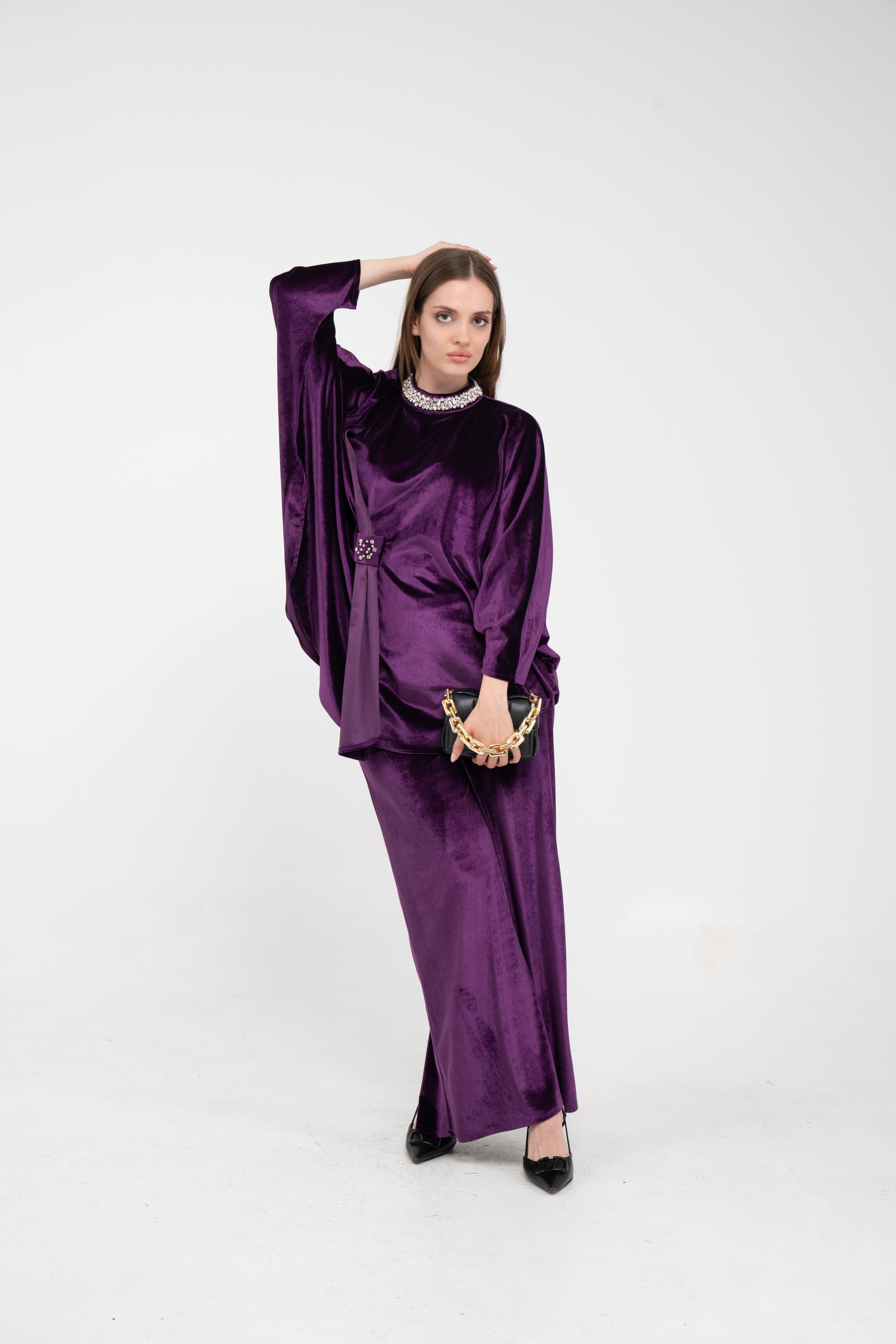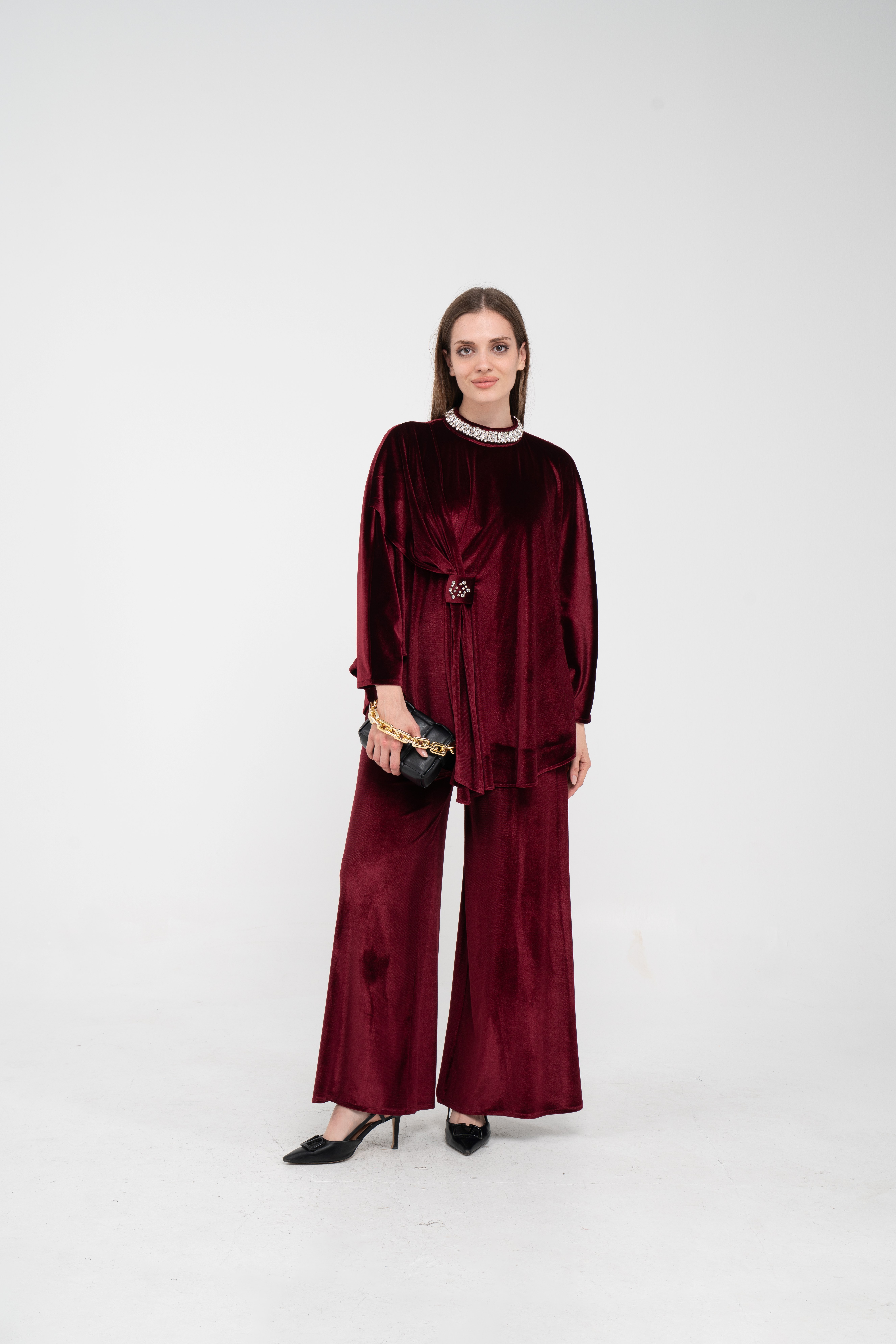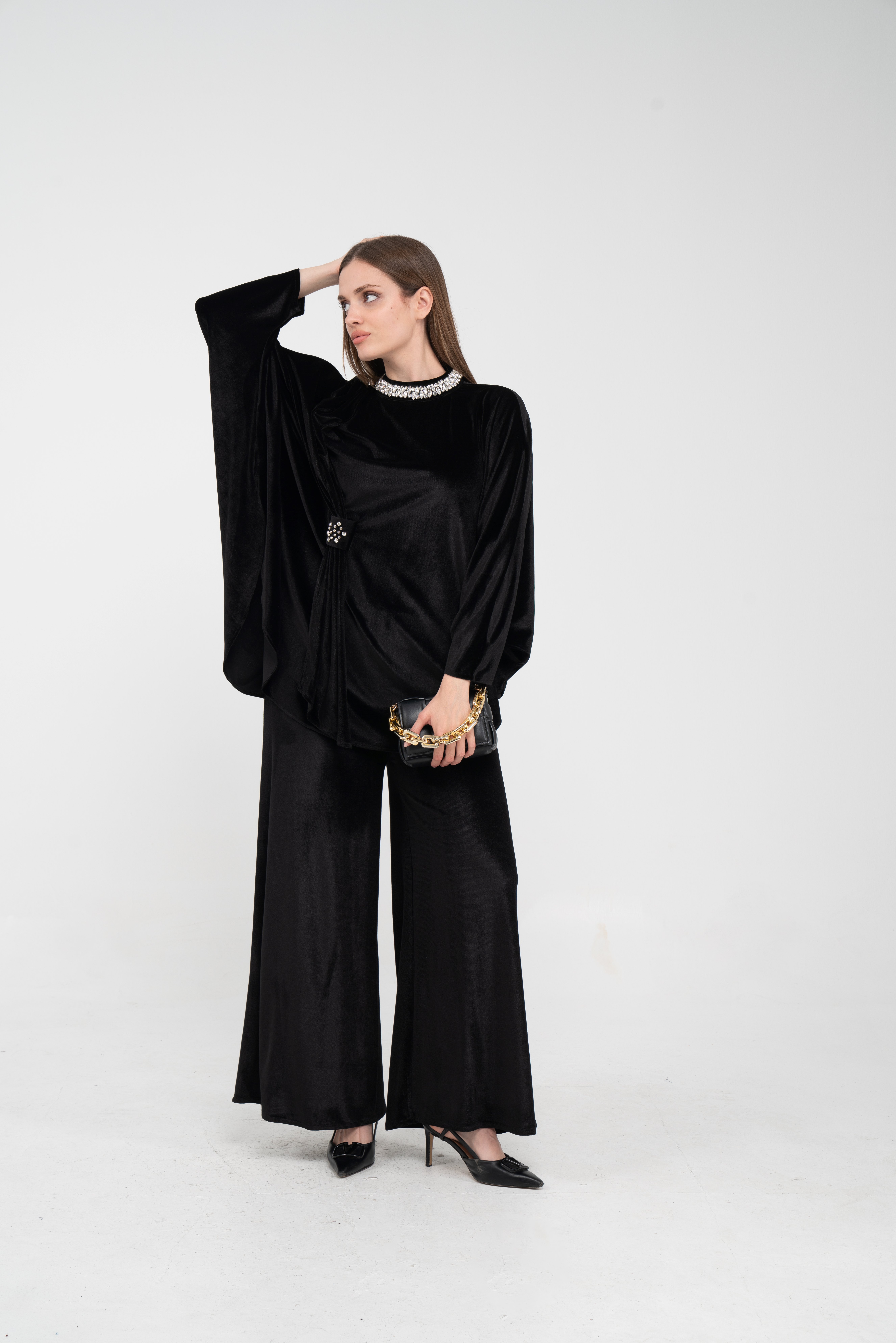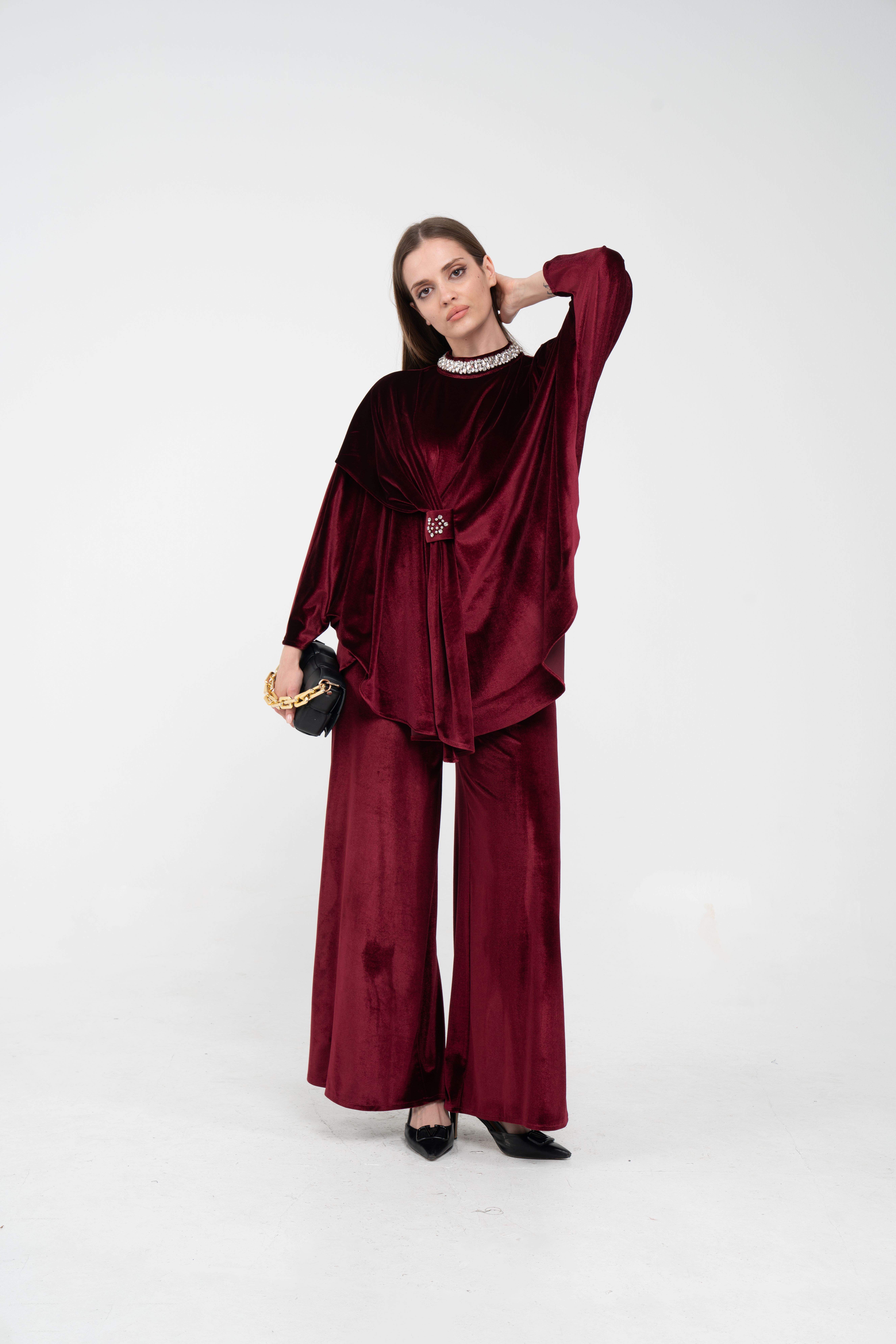 Omuzdan dökümlü geniş formu, vücut hatlarını zarifçe örterken, ön kısmındaki taş tokalı detay tasarıma modern bir ışıltı katar. Yakadaki taş işlemeler ise bu takımı özel davetler, akşam yemekleri ve kutlamalar için mükemmel bir seçenek haline getirir.