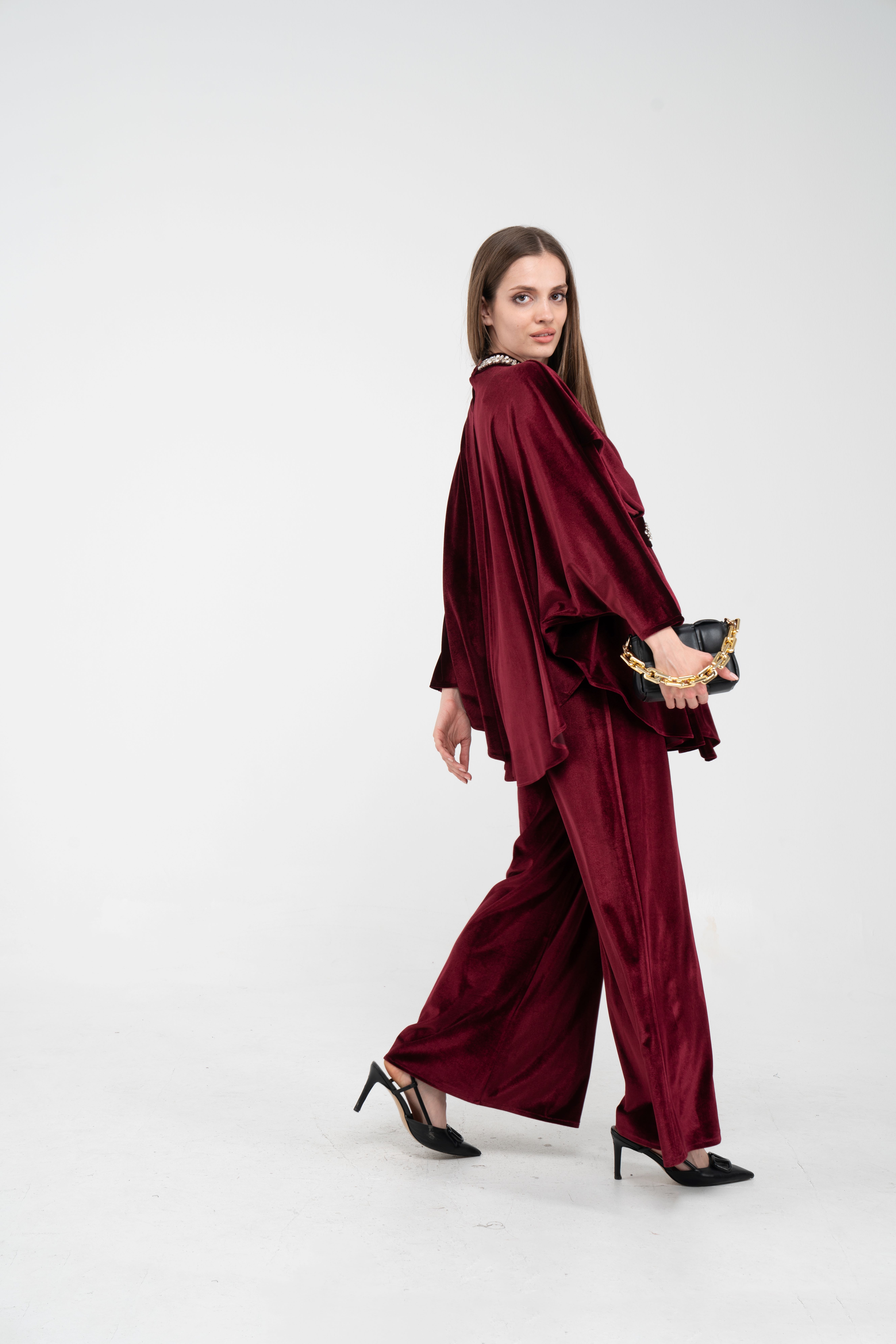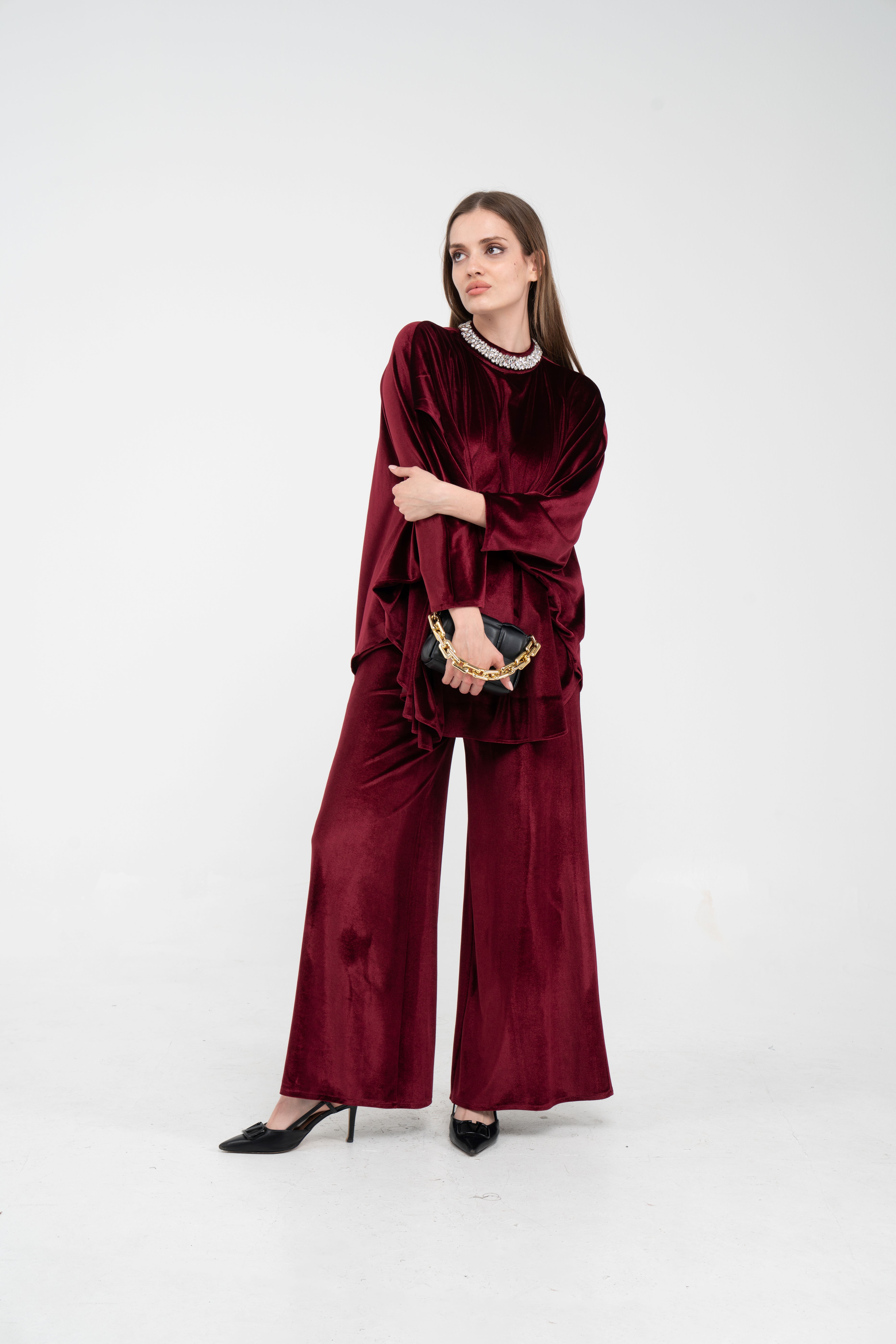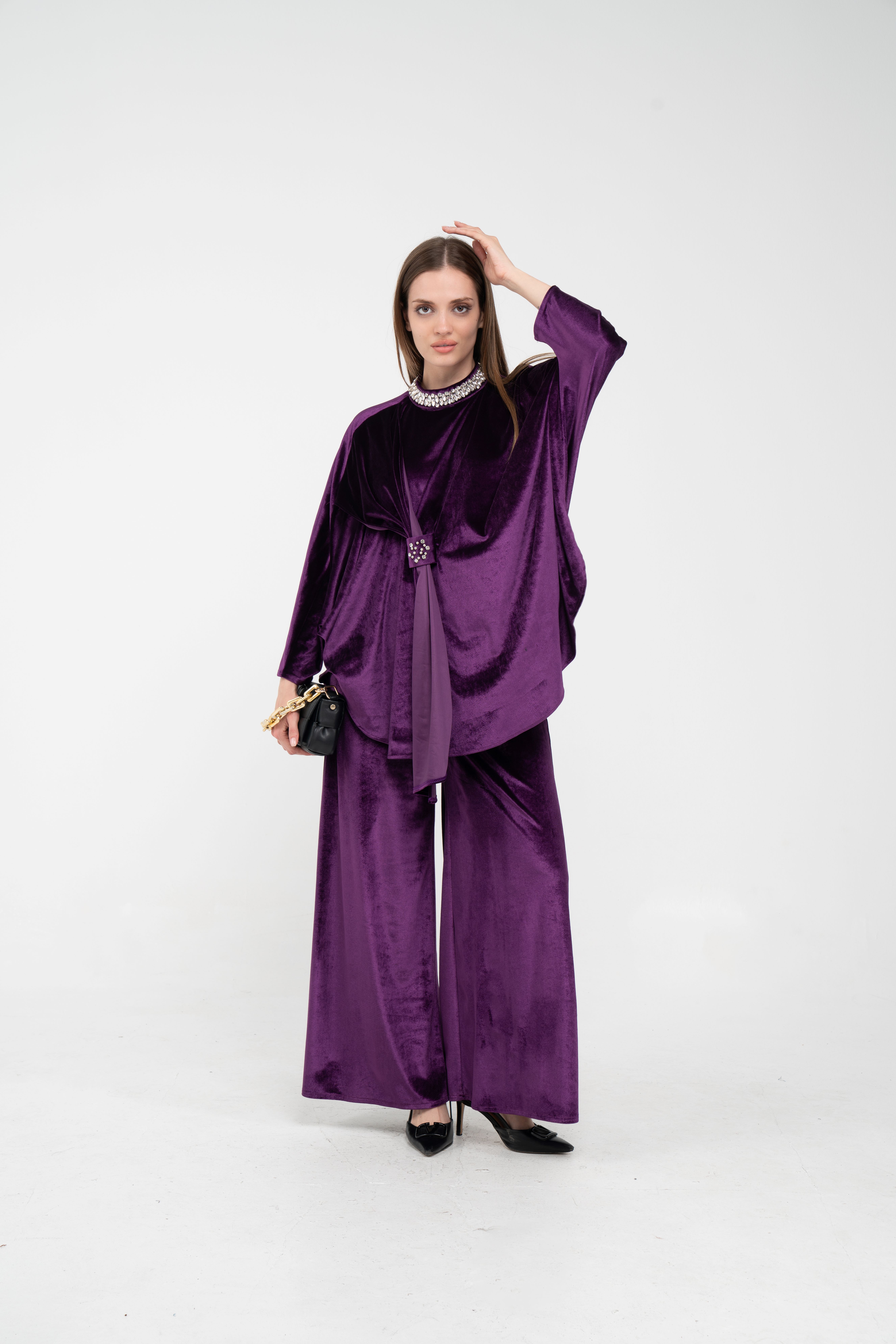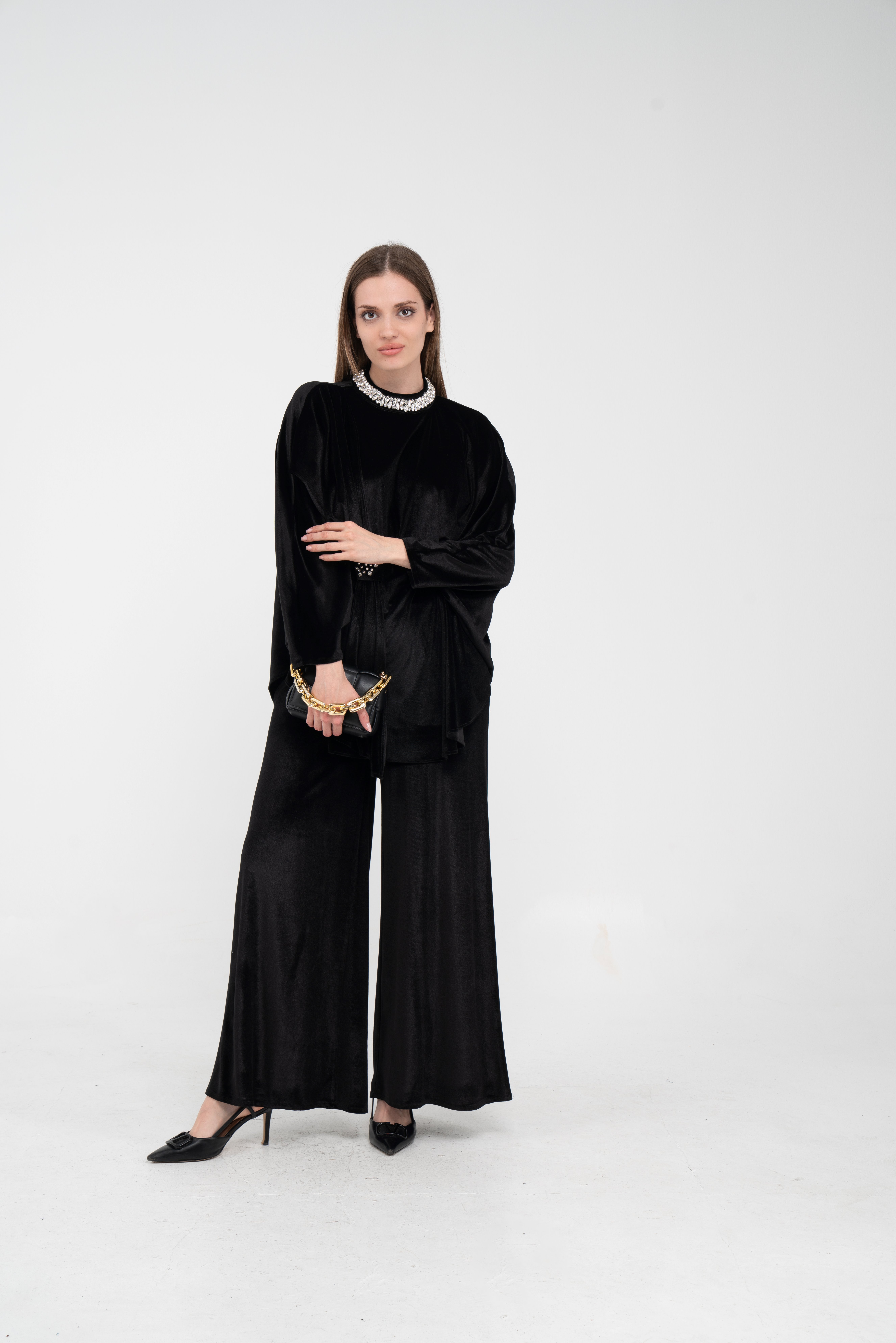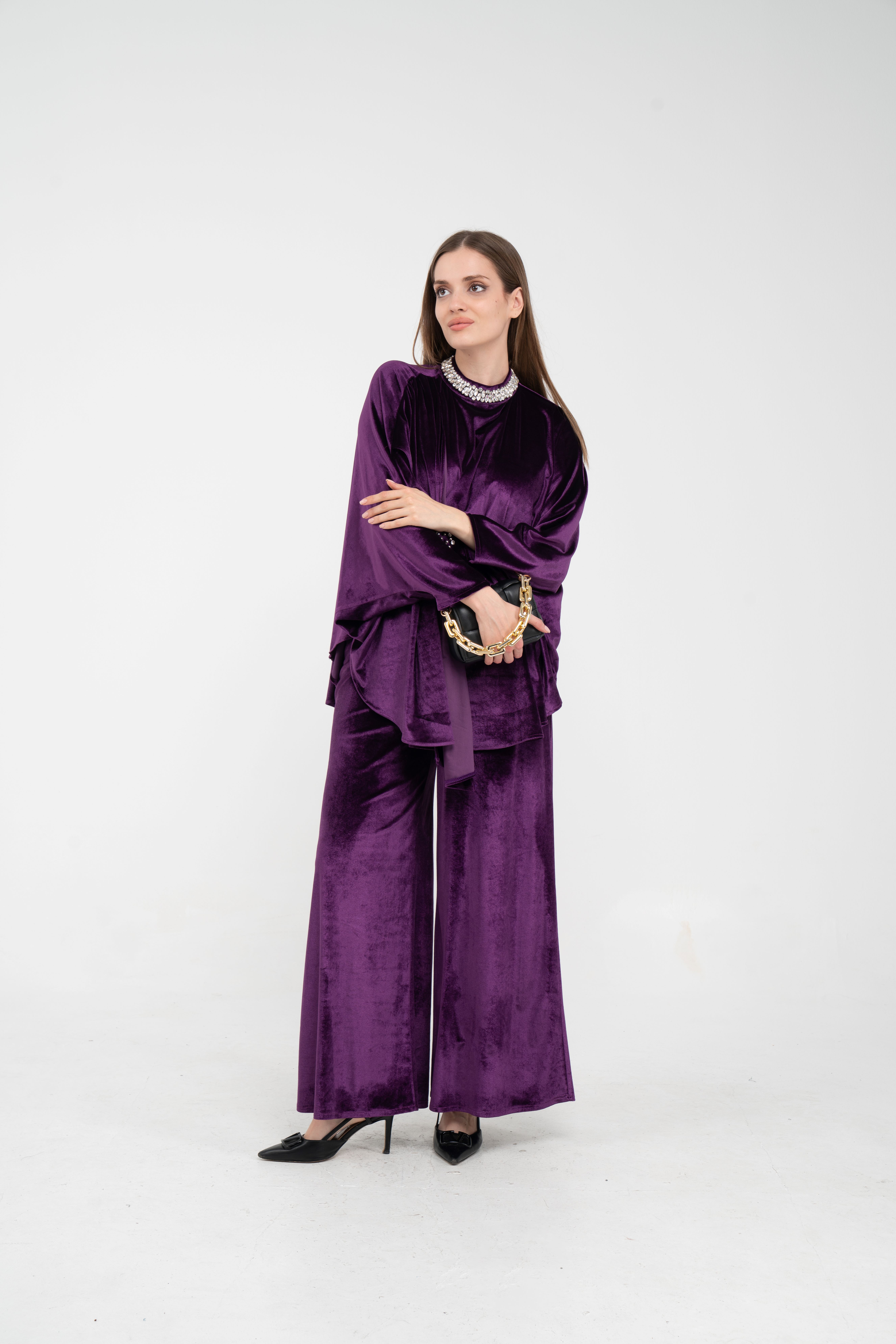 Geniş paçalı pantolonu ve rahat kesimi sayesinde gün boyu konfor sağlar. Kadife kumaşın dokusu ise soğuk havalarda sıcak tutarken lüks bir görünüm kazandırır.