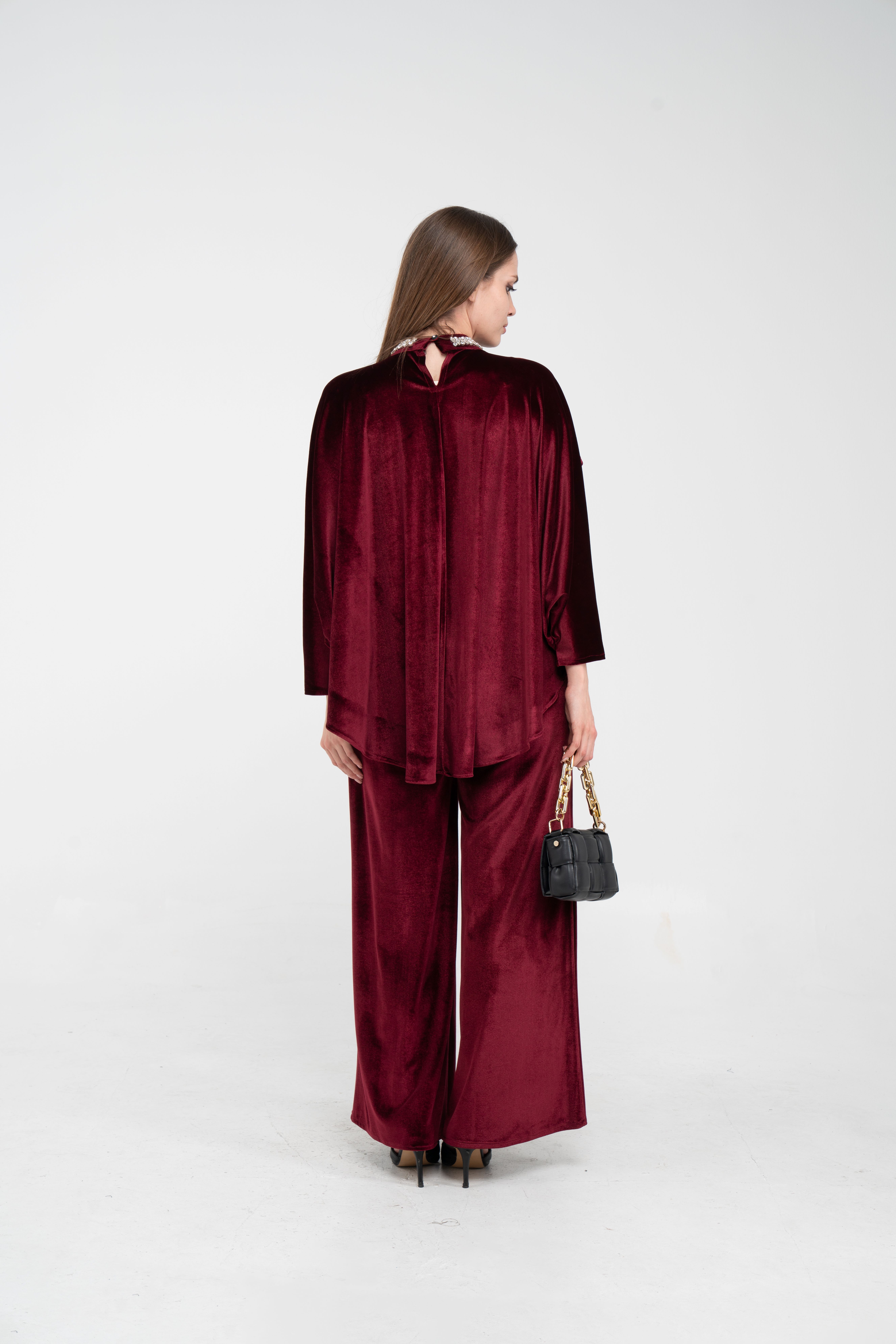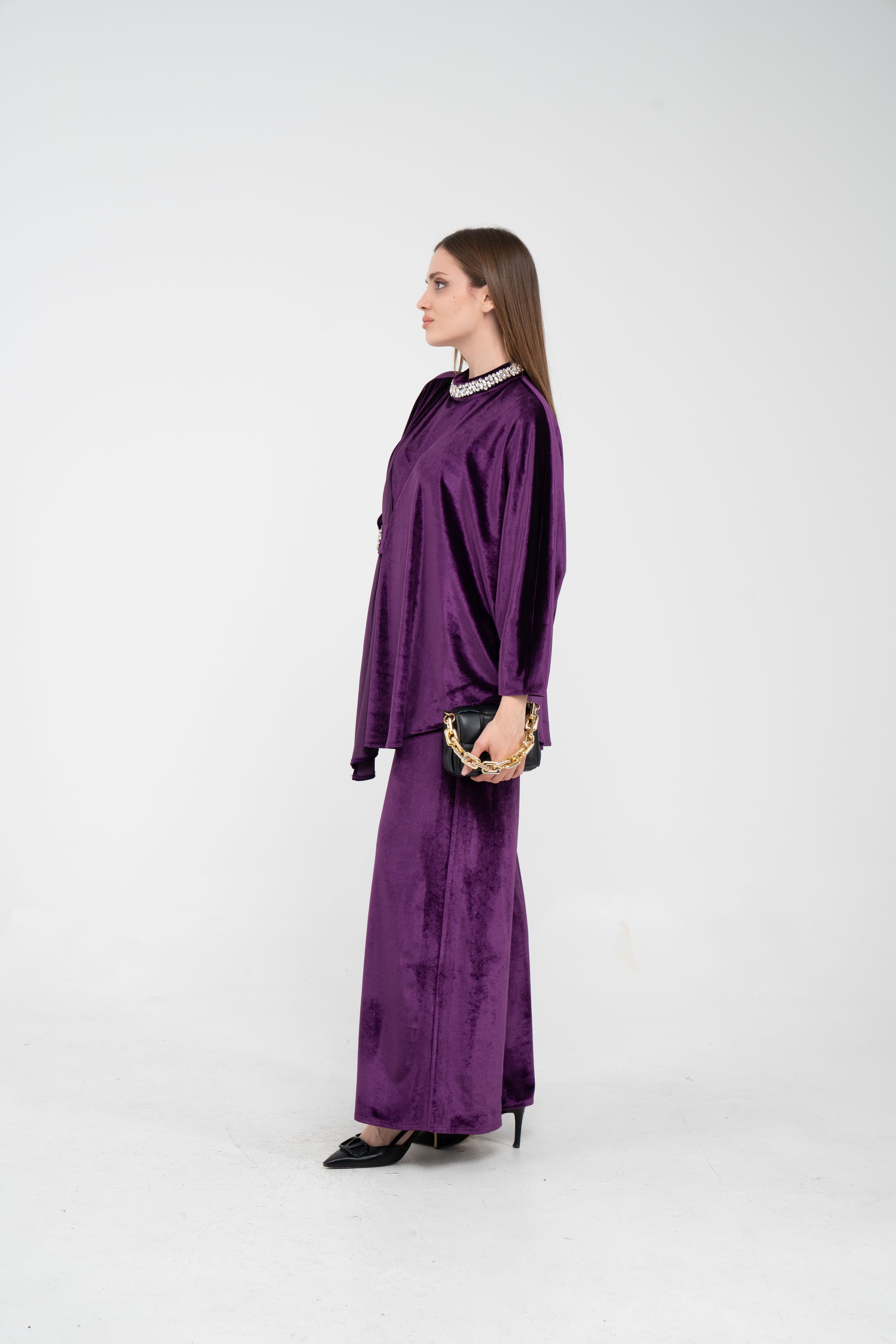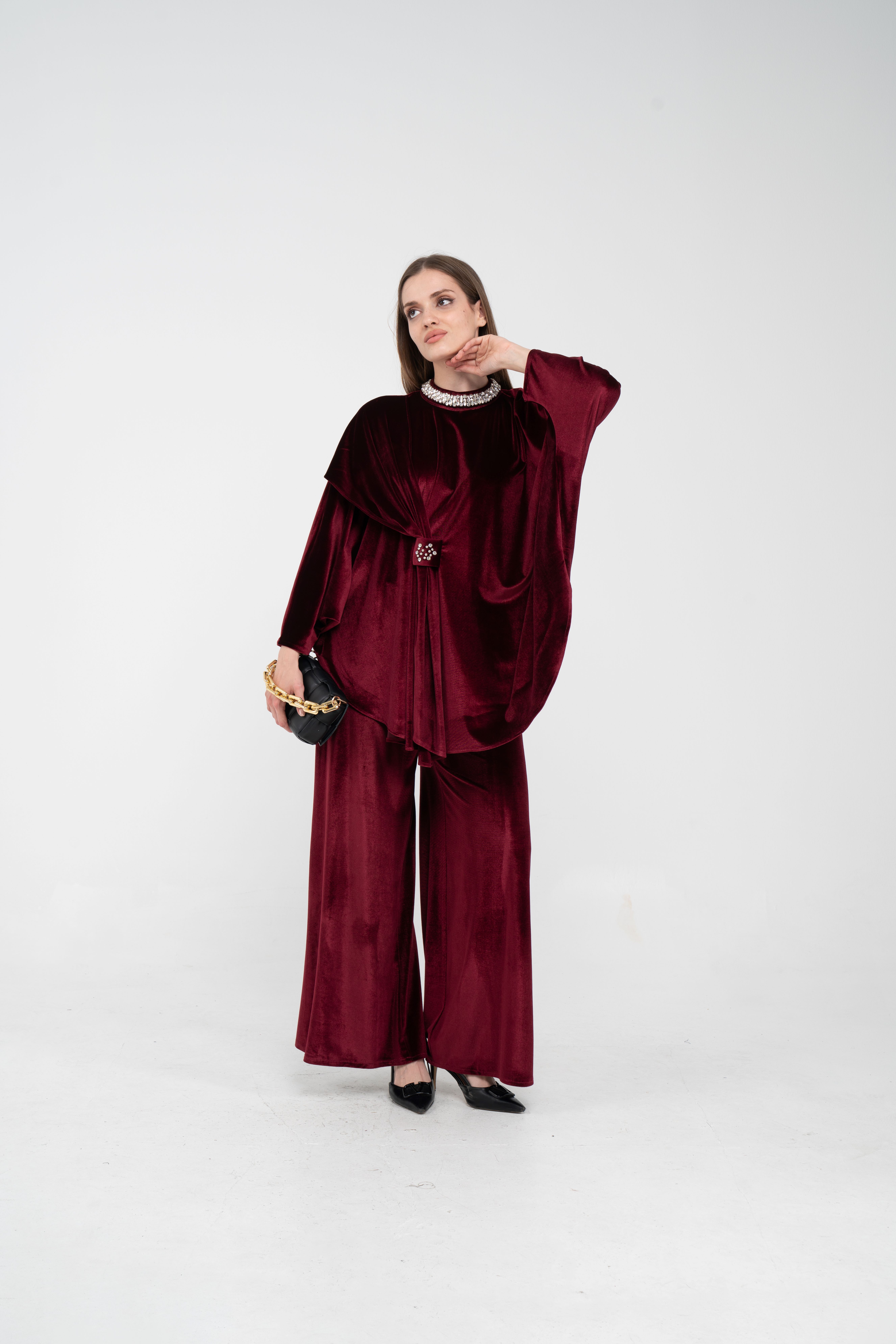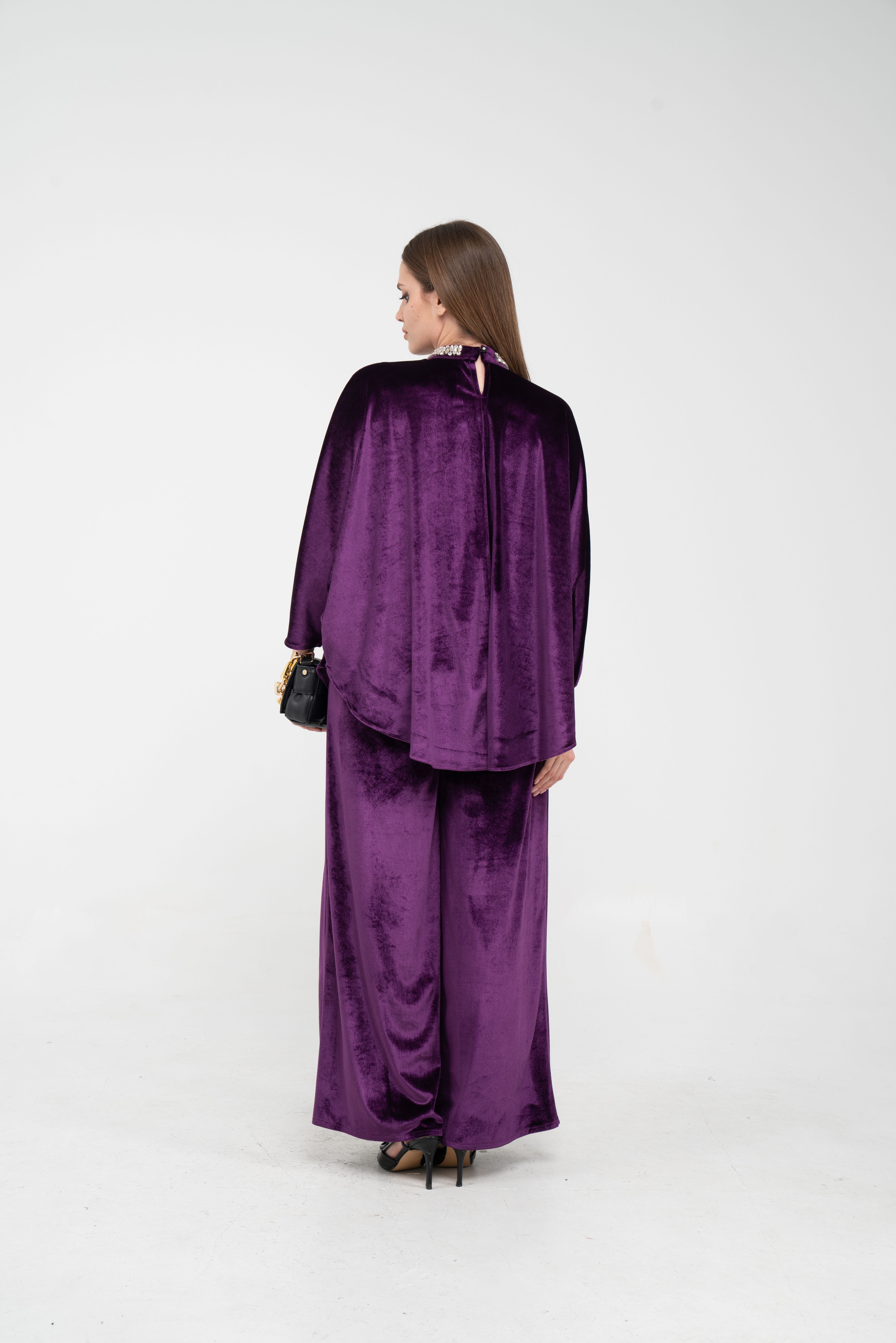 Geniş paçalı pantolonu ve rahat kesimi sayesinde gün boyu konfor sağlar. Kadife kumaşın dokusu ise soğuk havalarda sıcak tutarken lüks bir görünüm kazandırır.