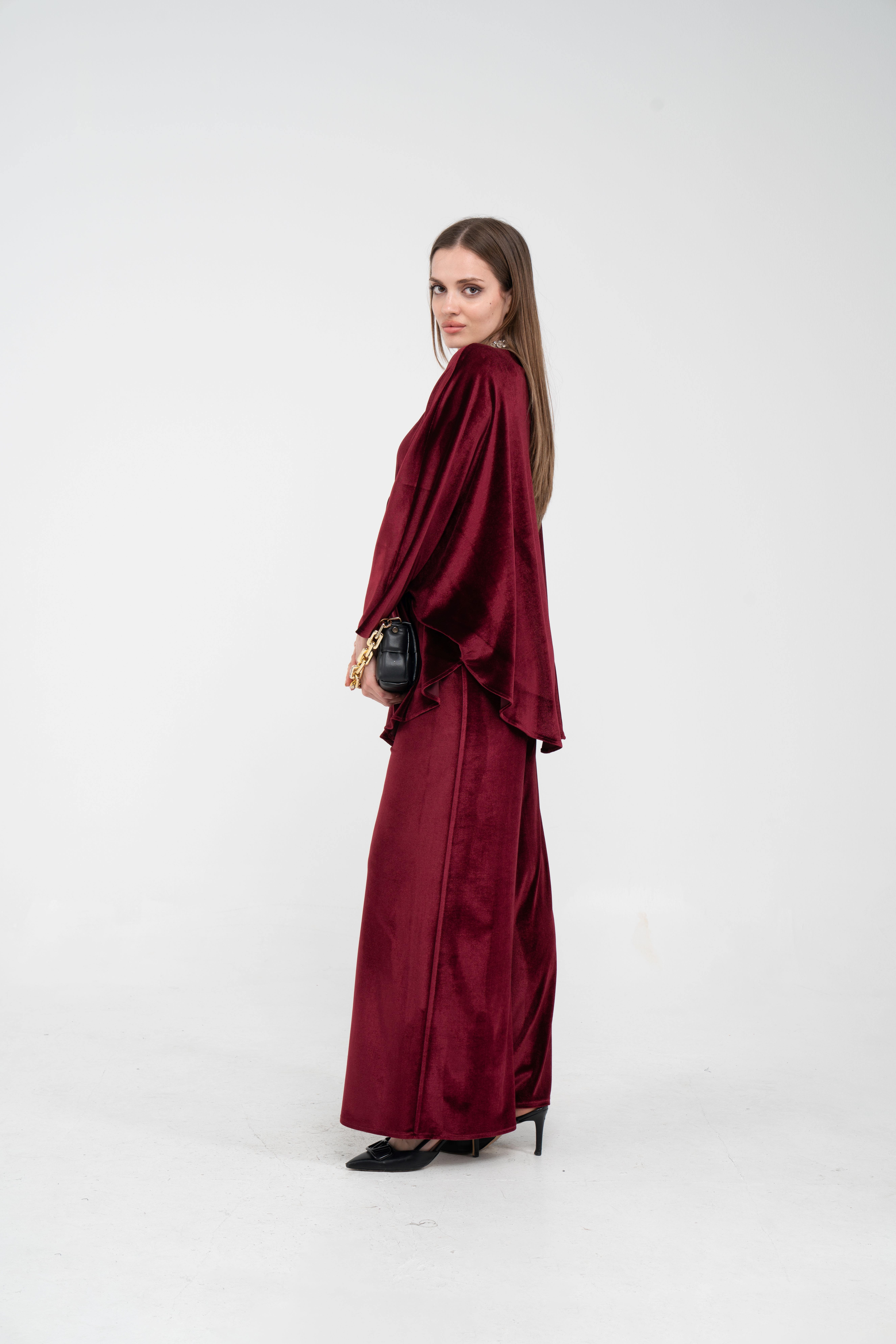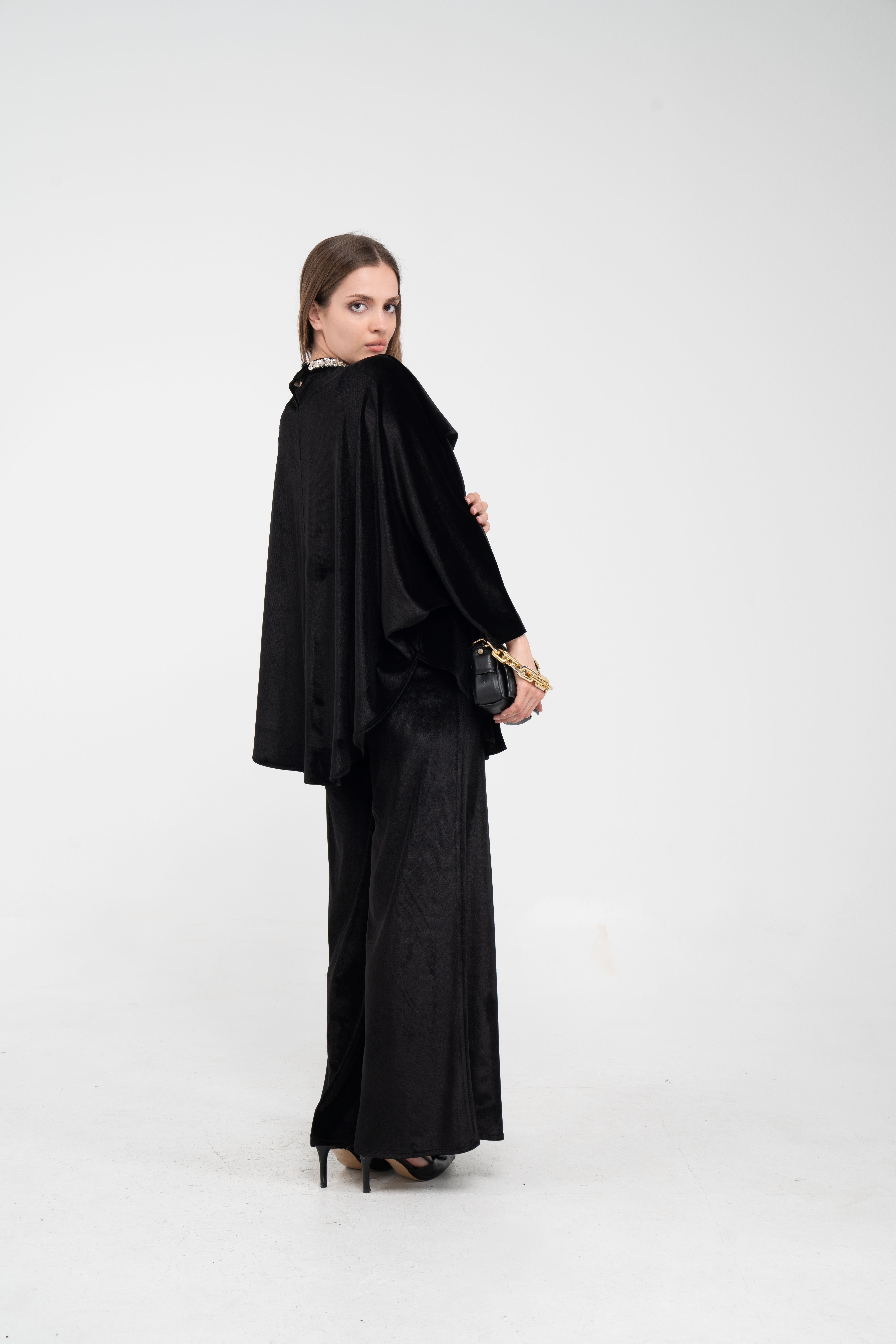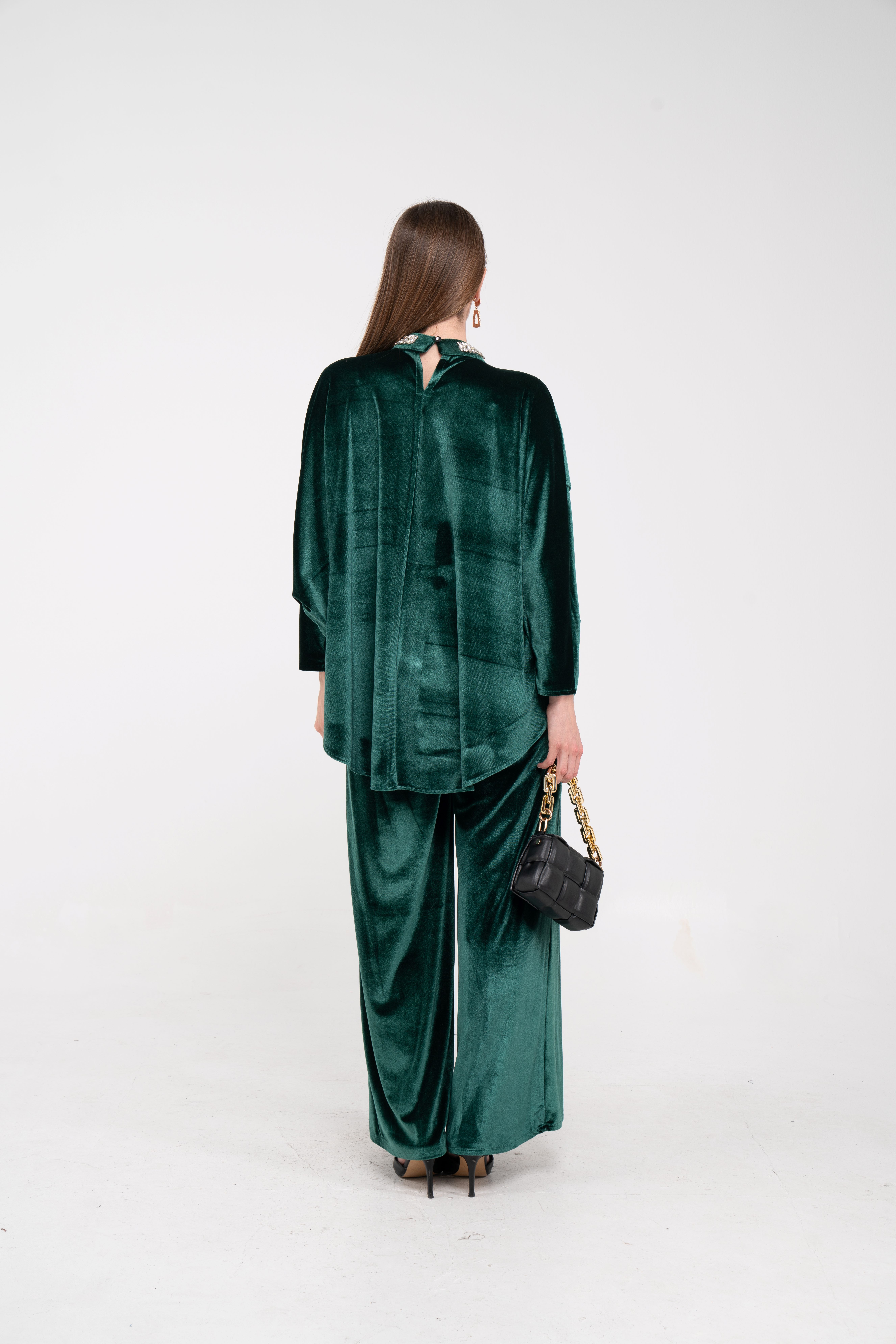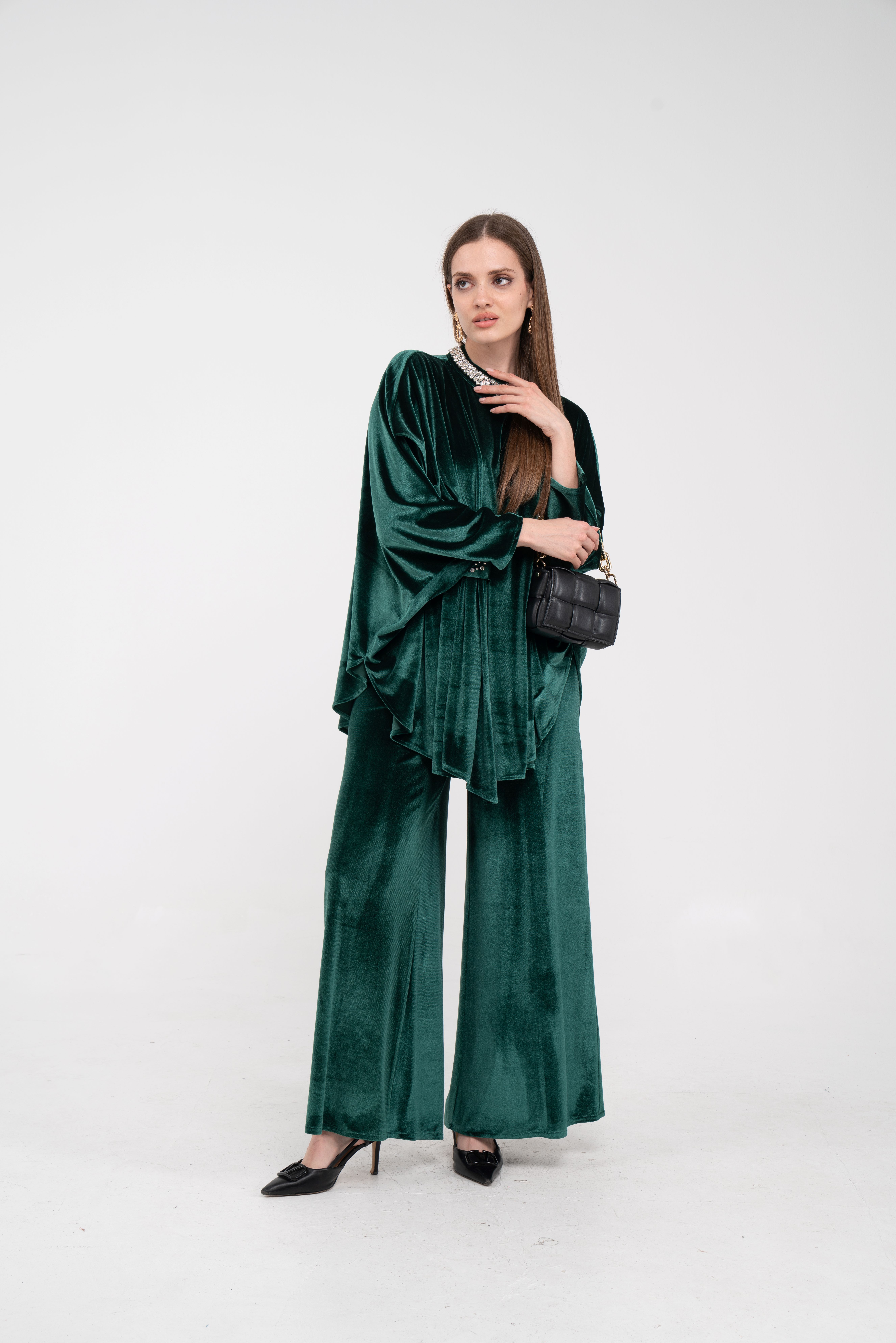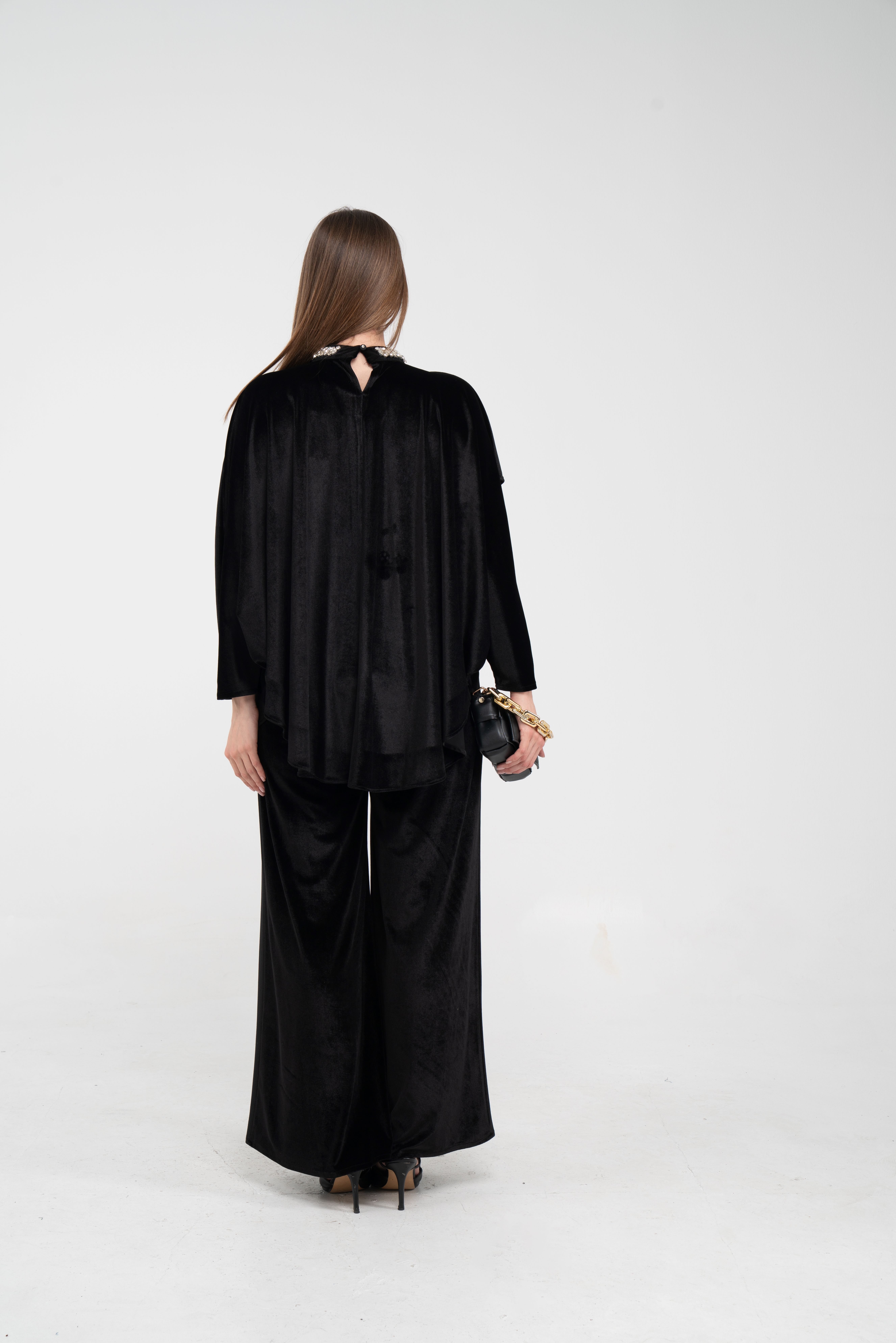Geniş paçalı pantolonu ve rahat kesimi sayesinde gün boyu konfor sağlar. Kadife kumaşın dokusu ise soğuk havalarda sıcak tutarken lüks bir görünüm kazandırır.