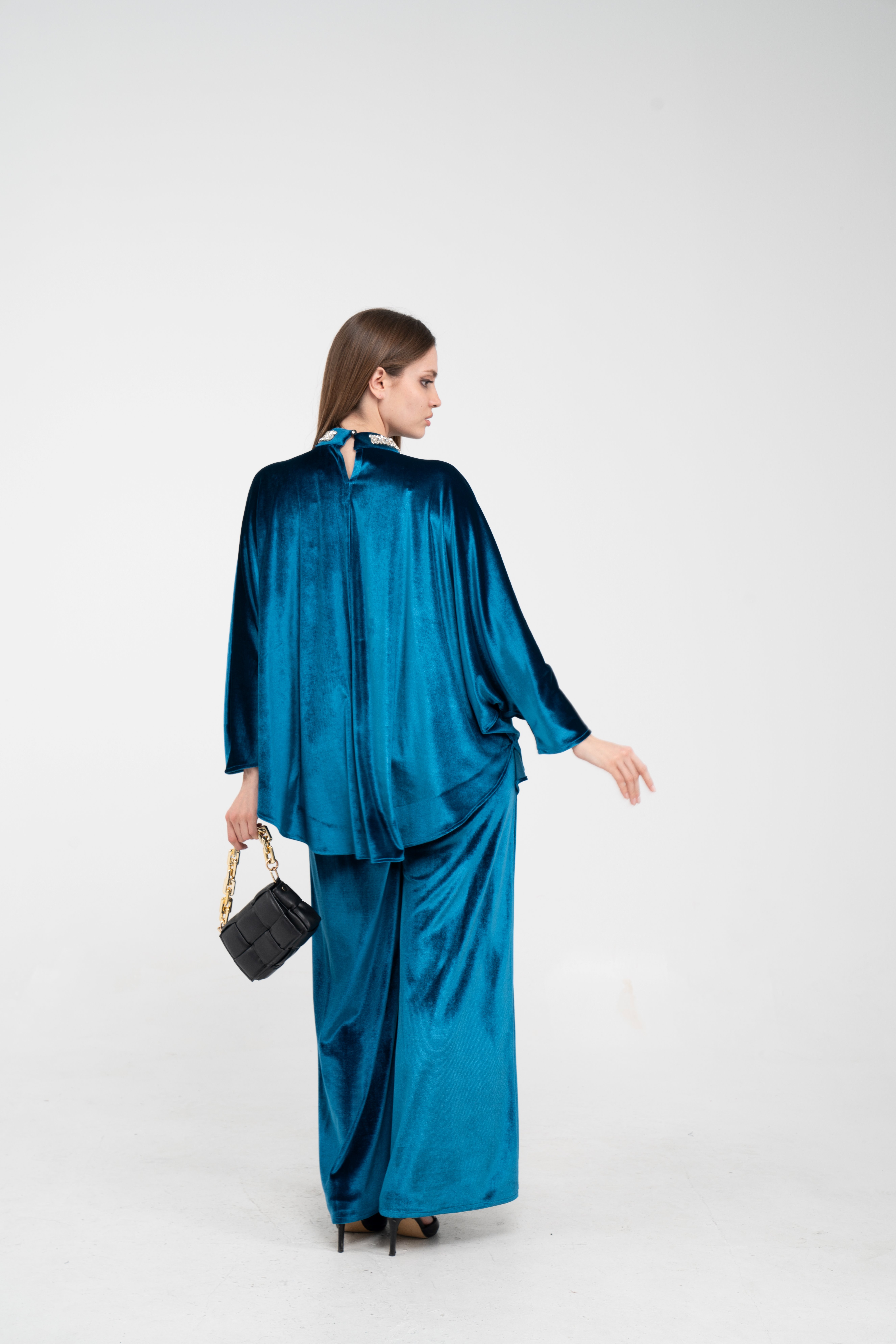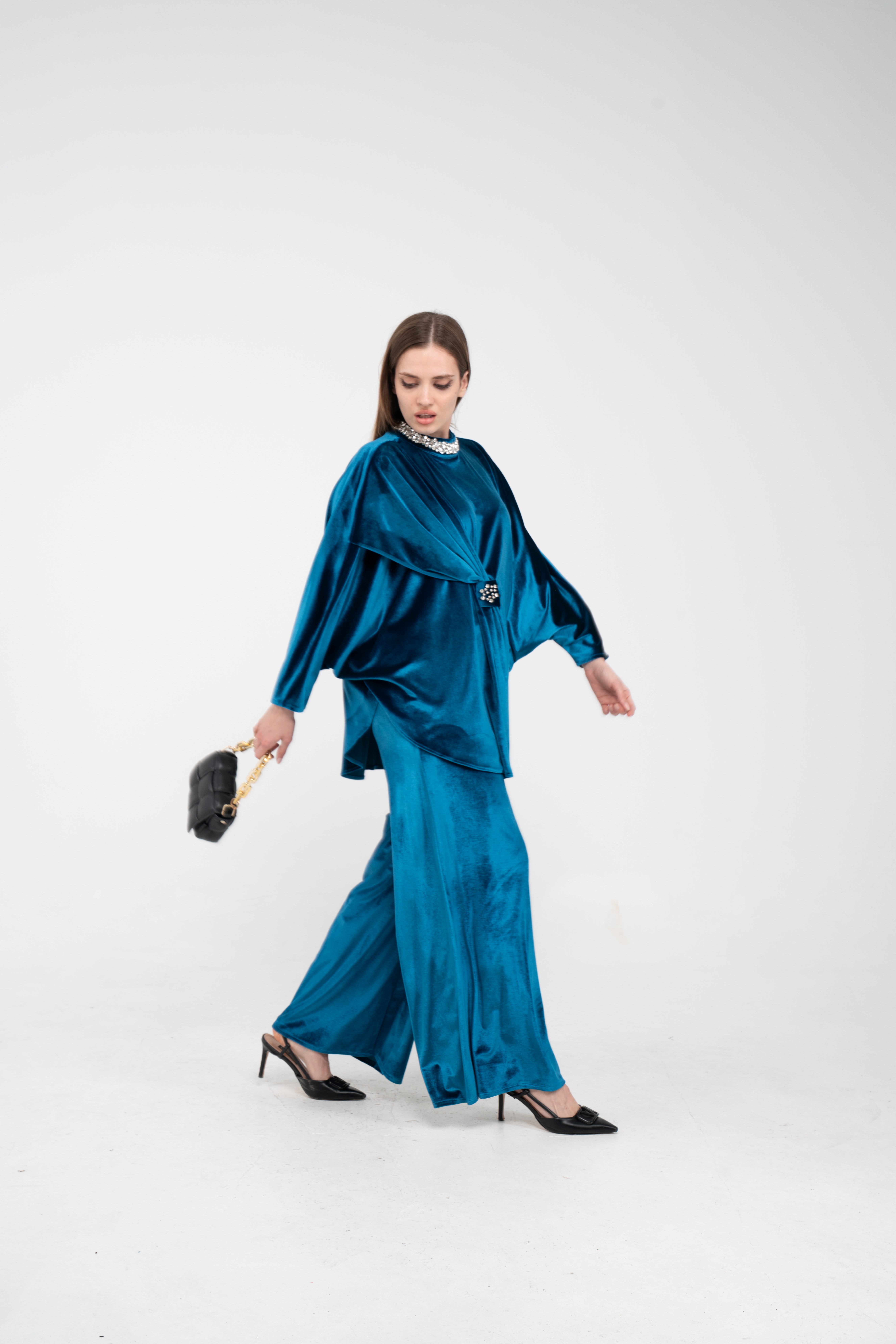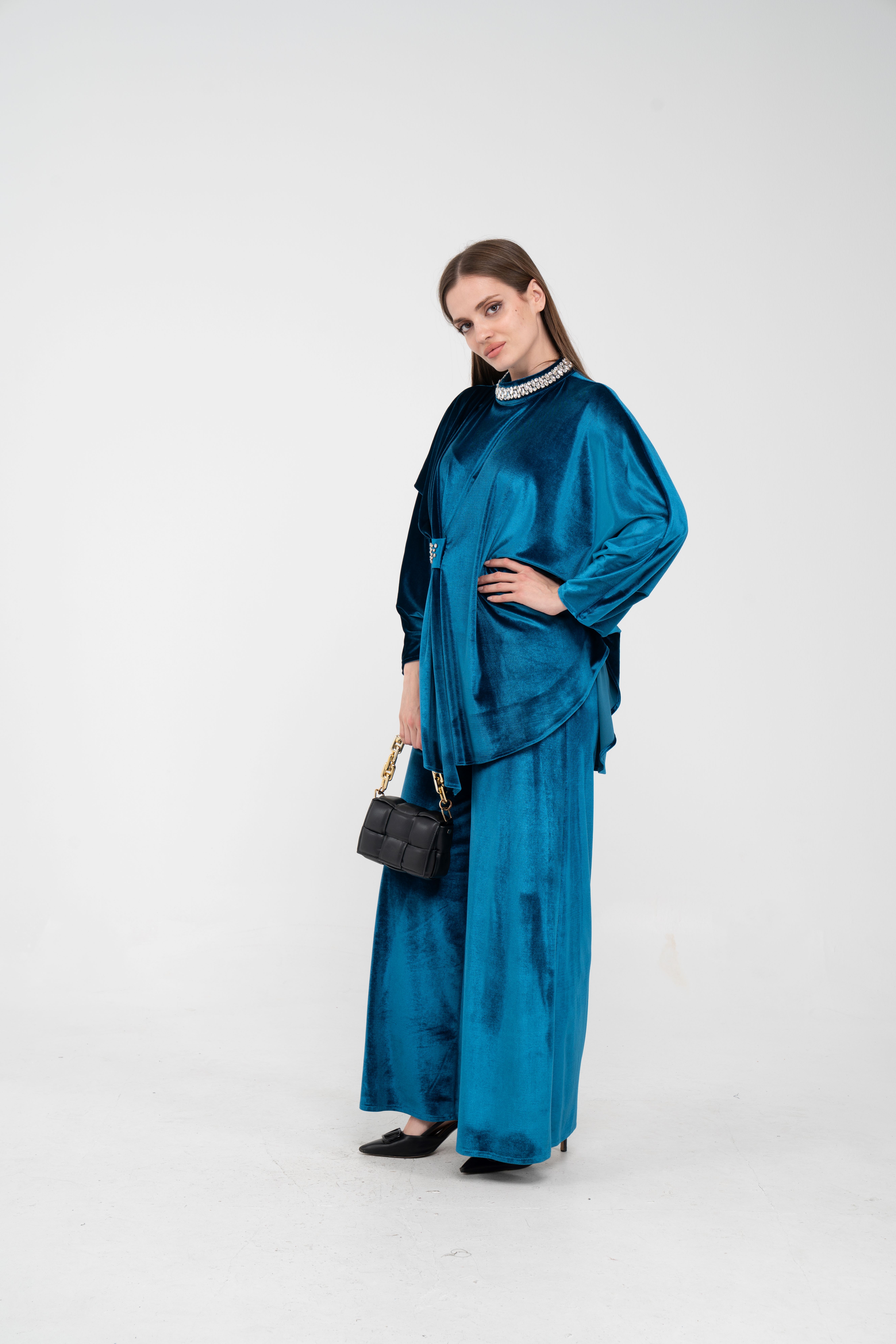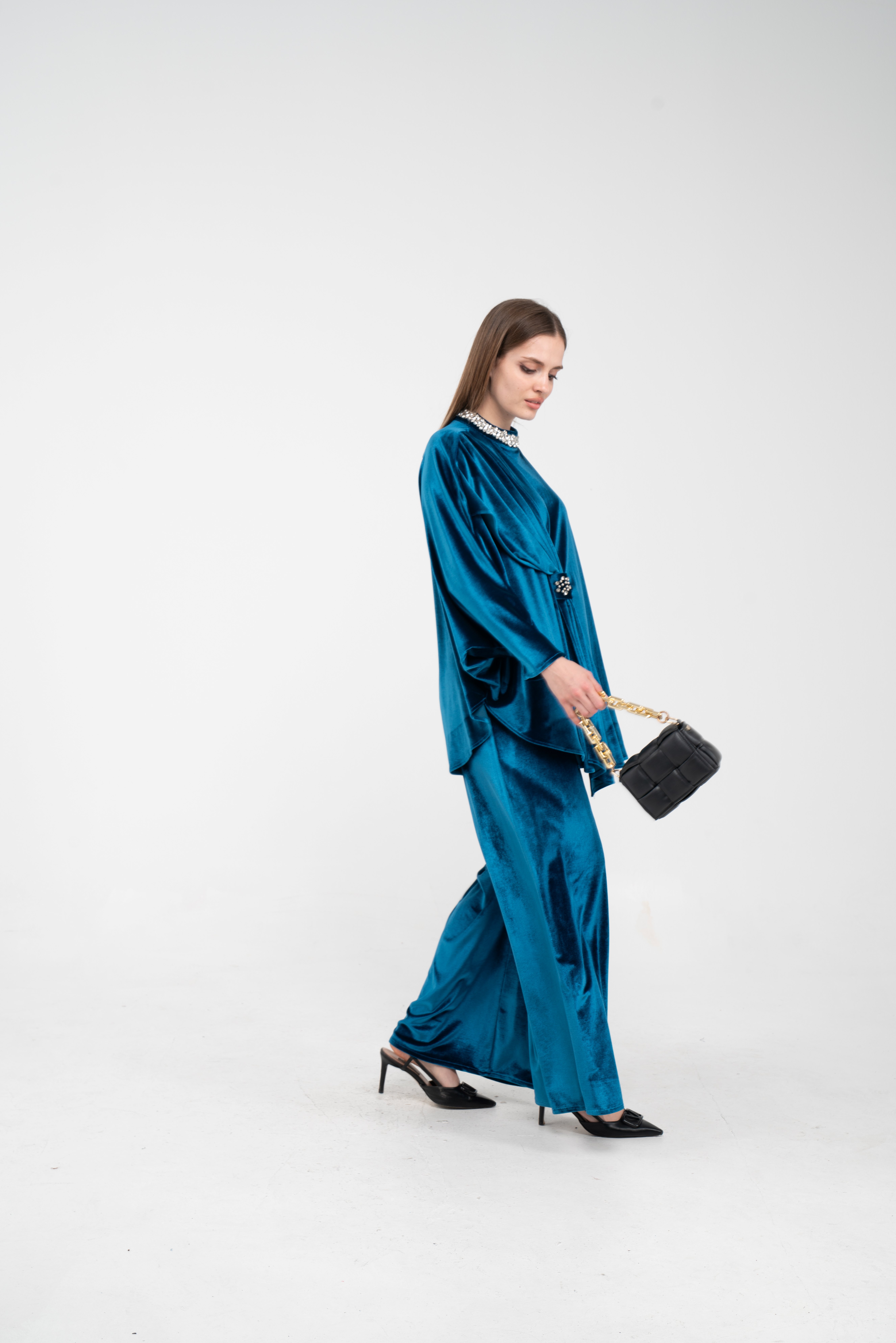Gelince Haber VerSezonun en şık tasarımlarından biri olan Taş Detaylı Kadife Takım, hem konforu hem de gösterişli duruşuyla öne çıkıyor. Parlak mavi kadife kumaşı, ışığa göre farklı tonlarda yansıma yaparak asil bir görünüm sunar.