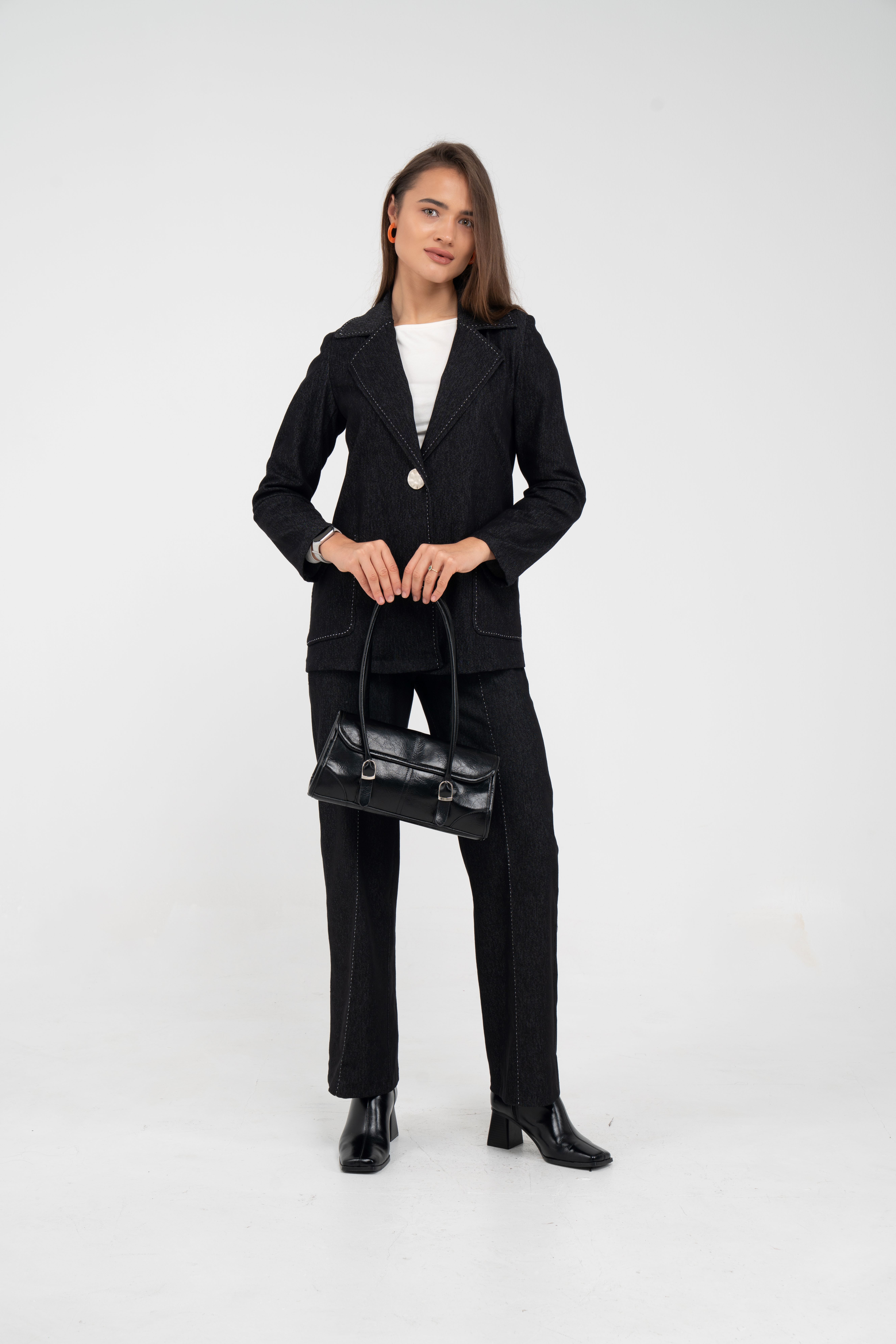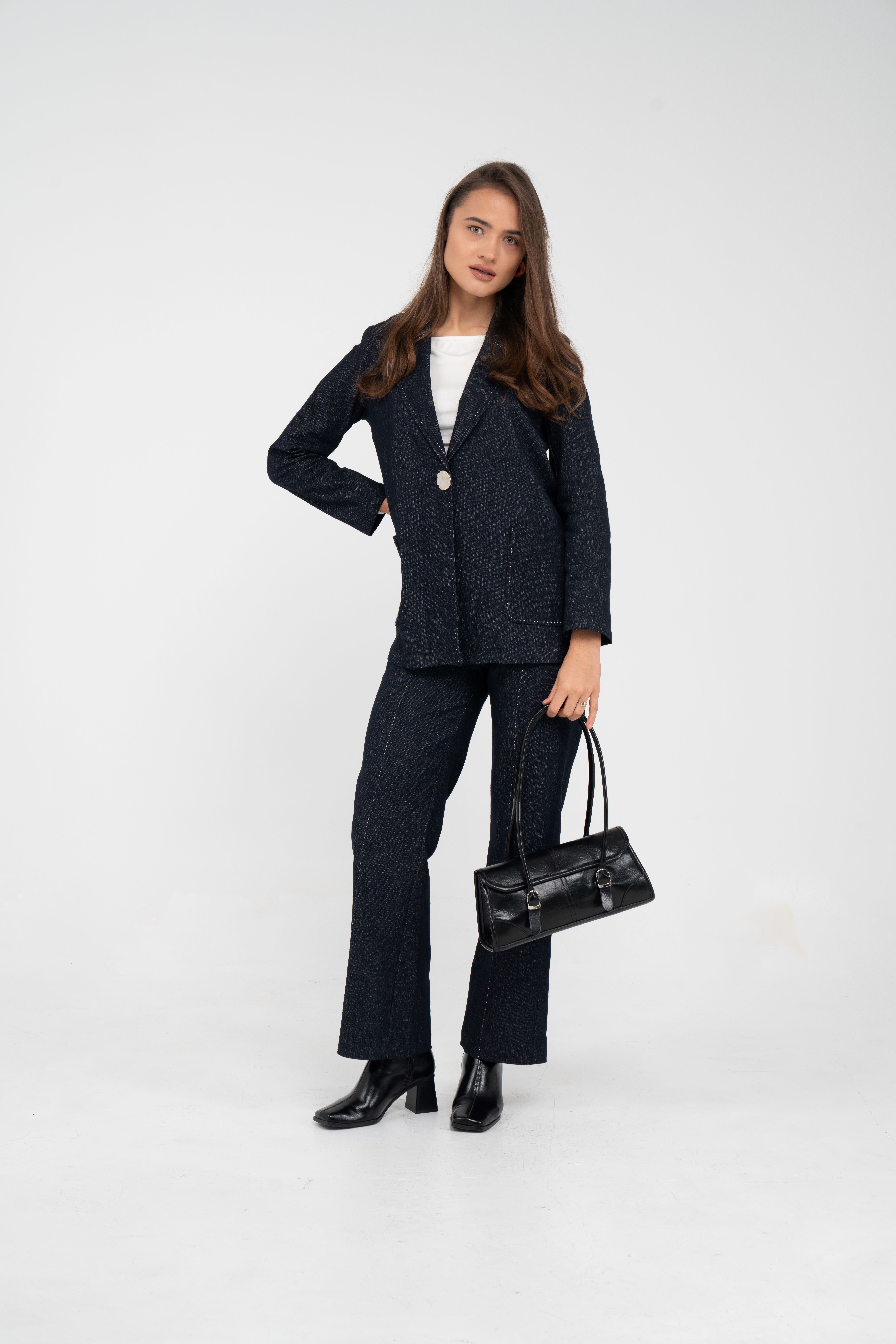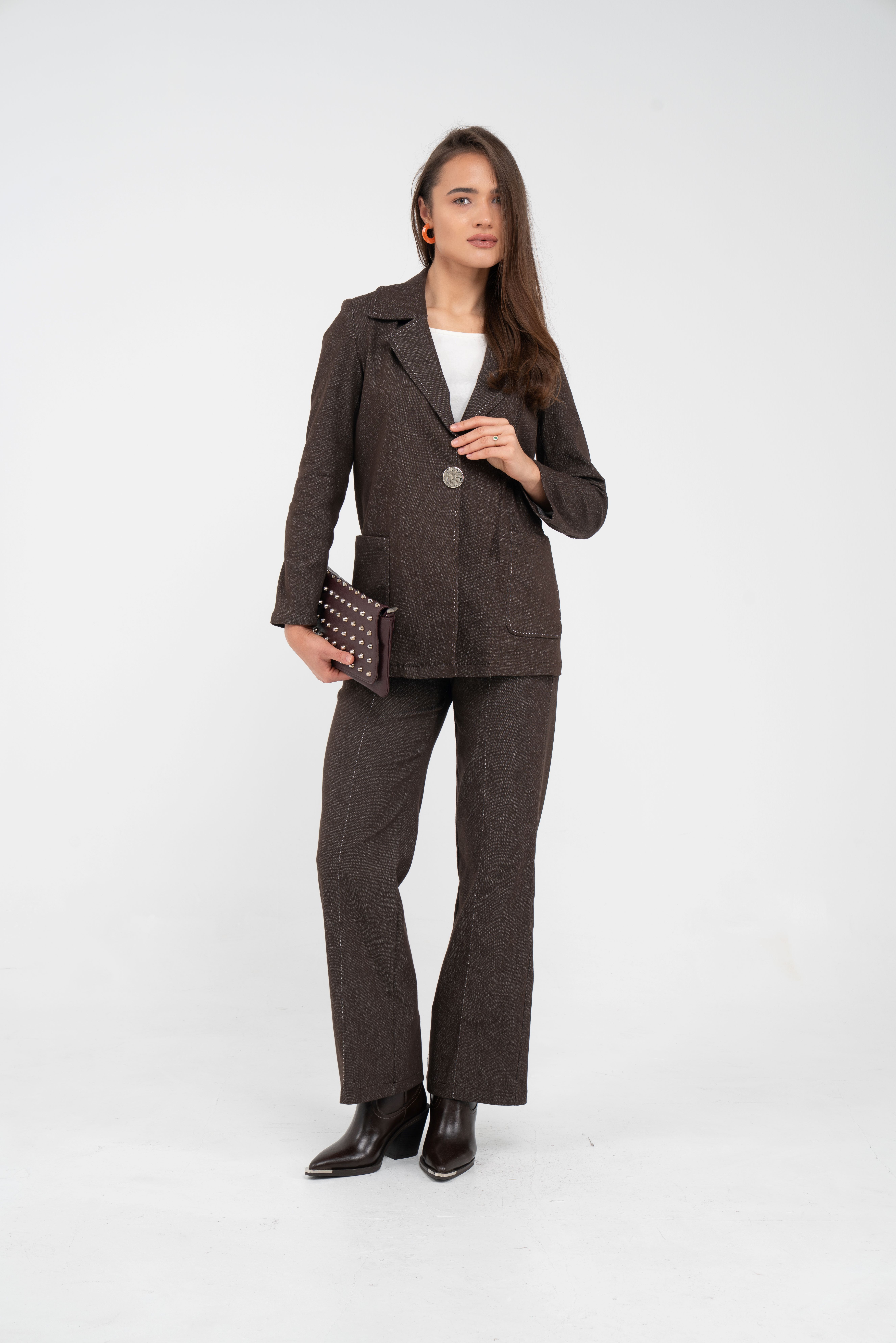 Ceket üzerindeki tek büyük düğme detayı, minimal tasarıma zarif bir dokunuş katar. Konforlu düz paça pantolon ile tamamlanan takım, tarzına sofistike bir dokunuş katmak isteyen kadınların tercihi olacak.