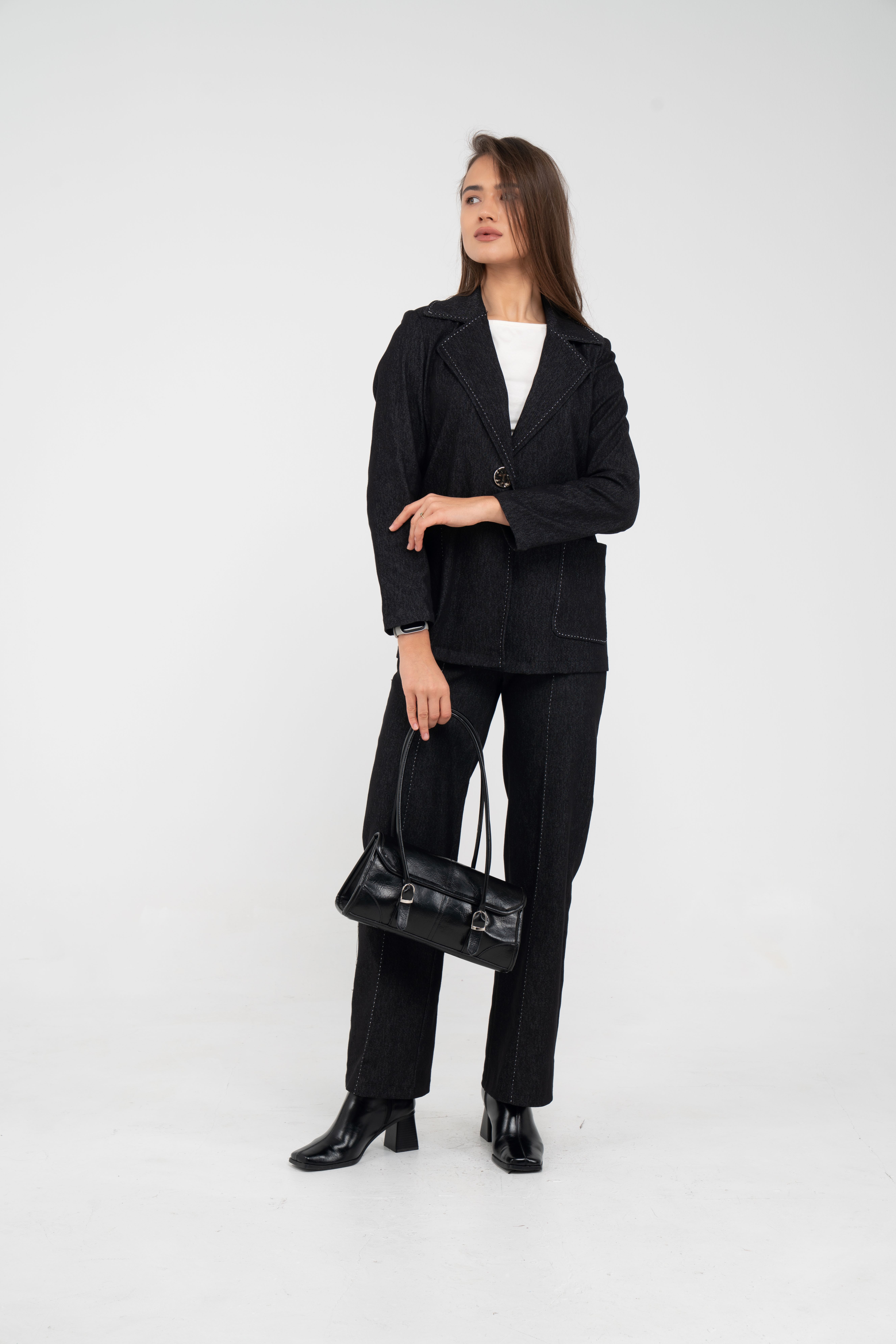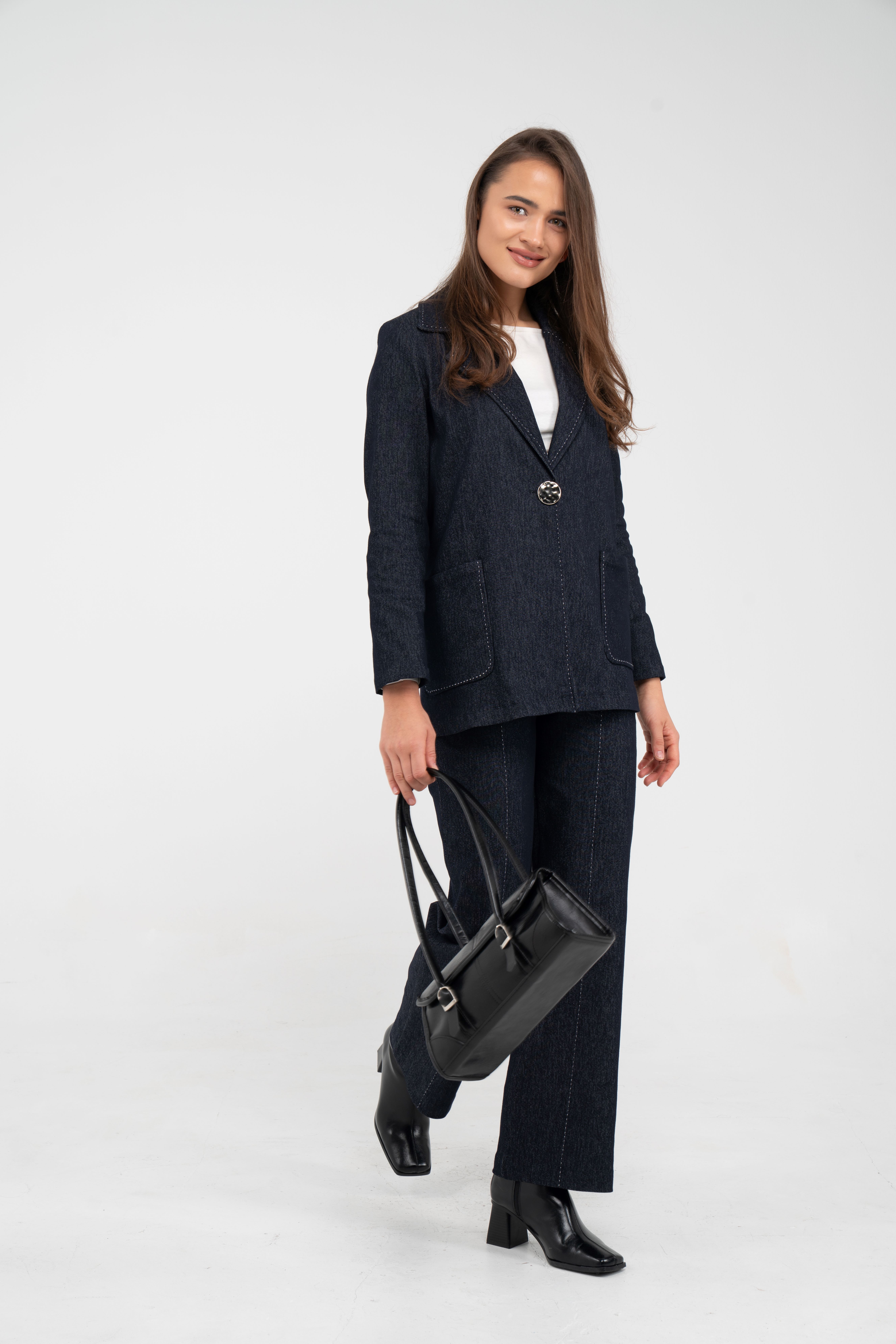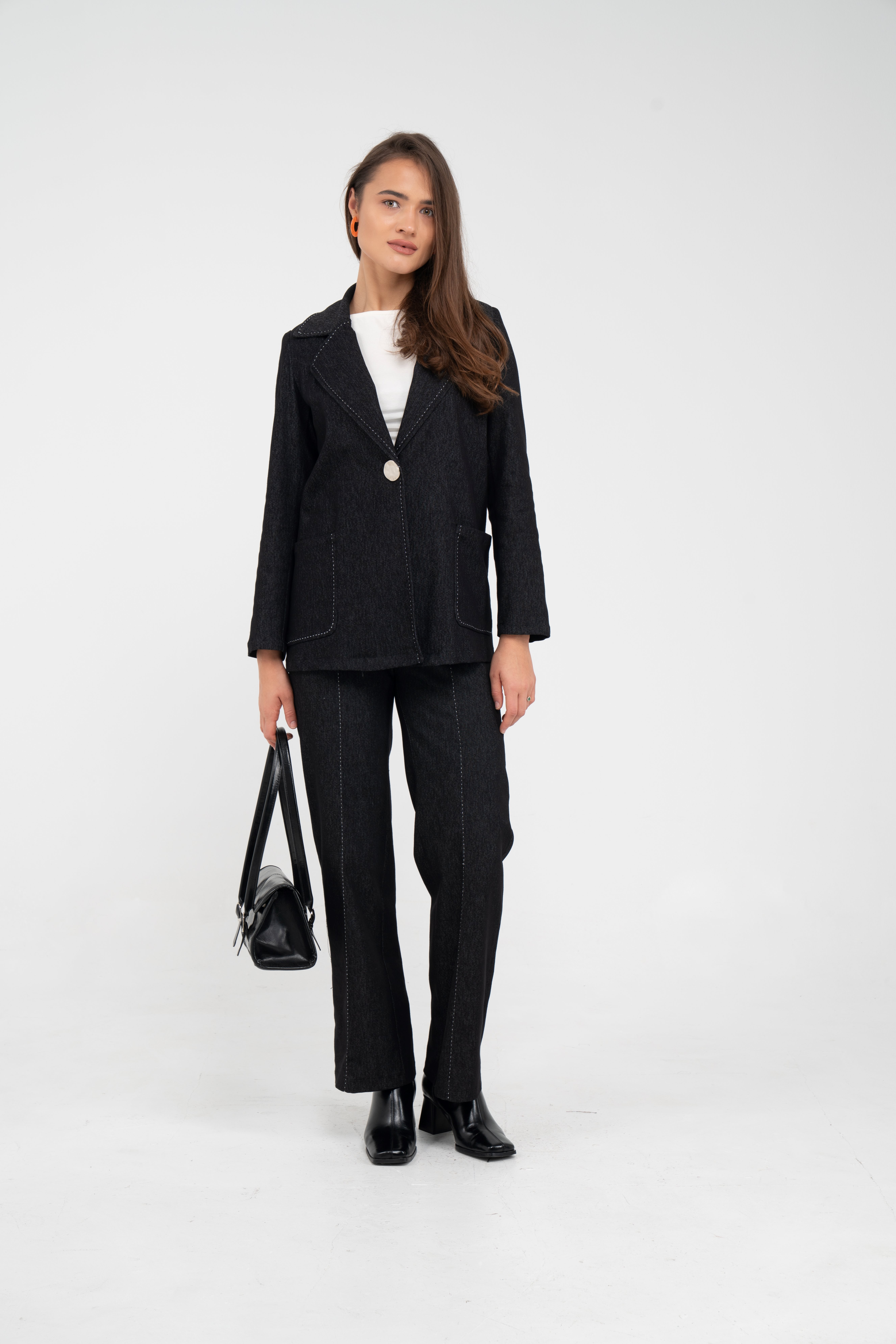 Ceket üzerindeki tek büyük düğme detayı, minimal tasarıma zarif bir dokunuş katar. Konforlu düz paça pantolon ile tamamlanan takım, tarzına sofistike bir dokunuş katmak isteyen kadınların tercihi olacak.