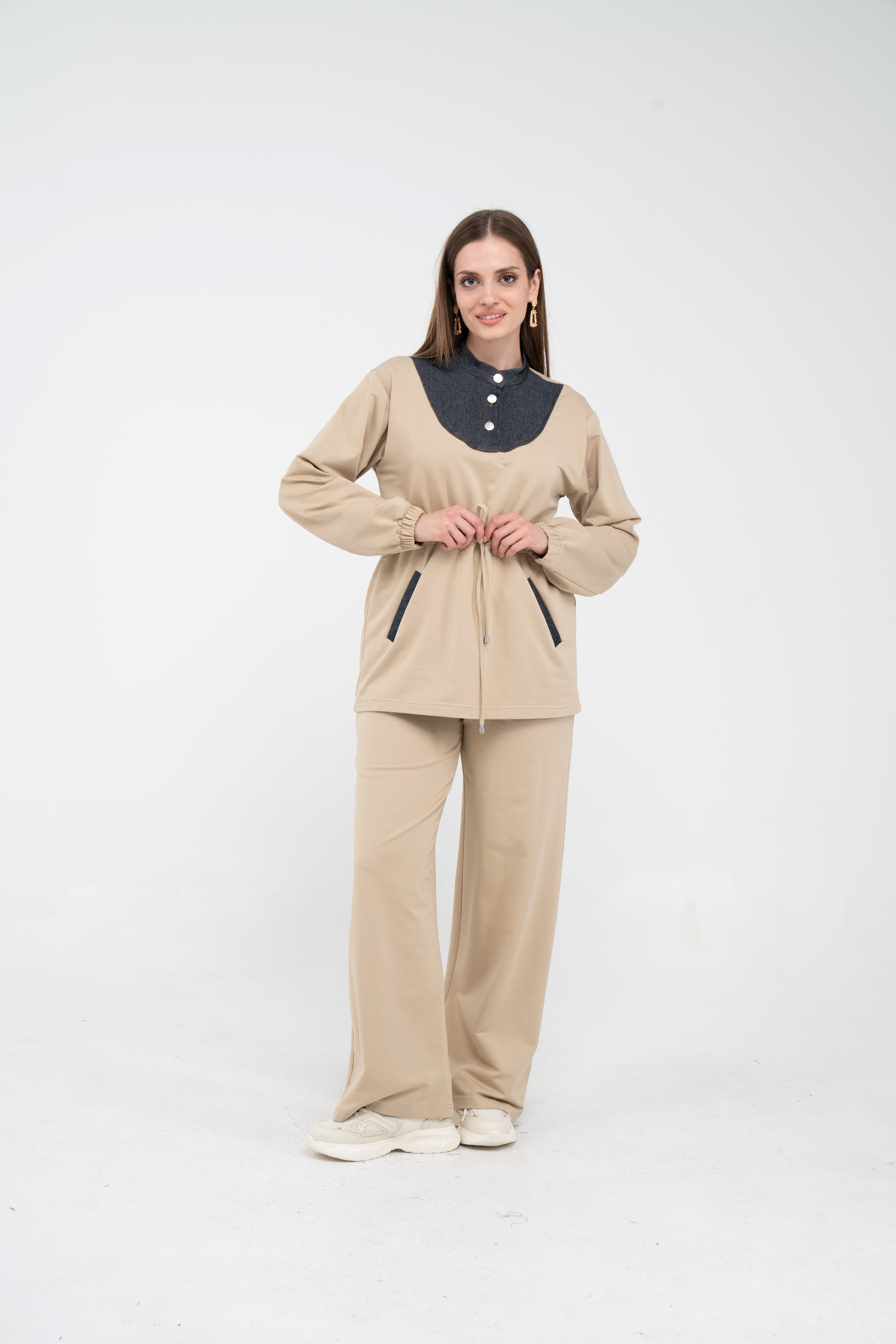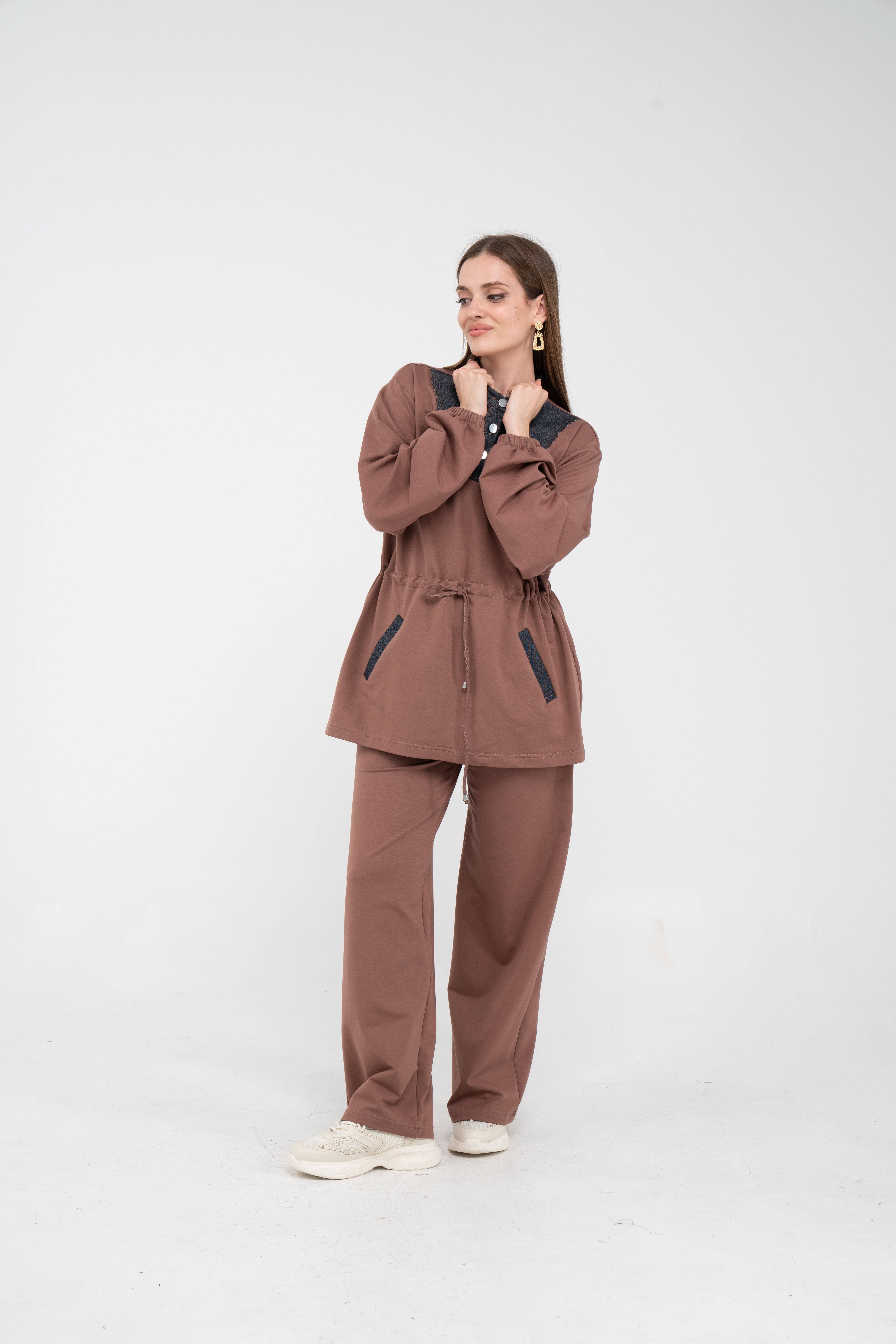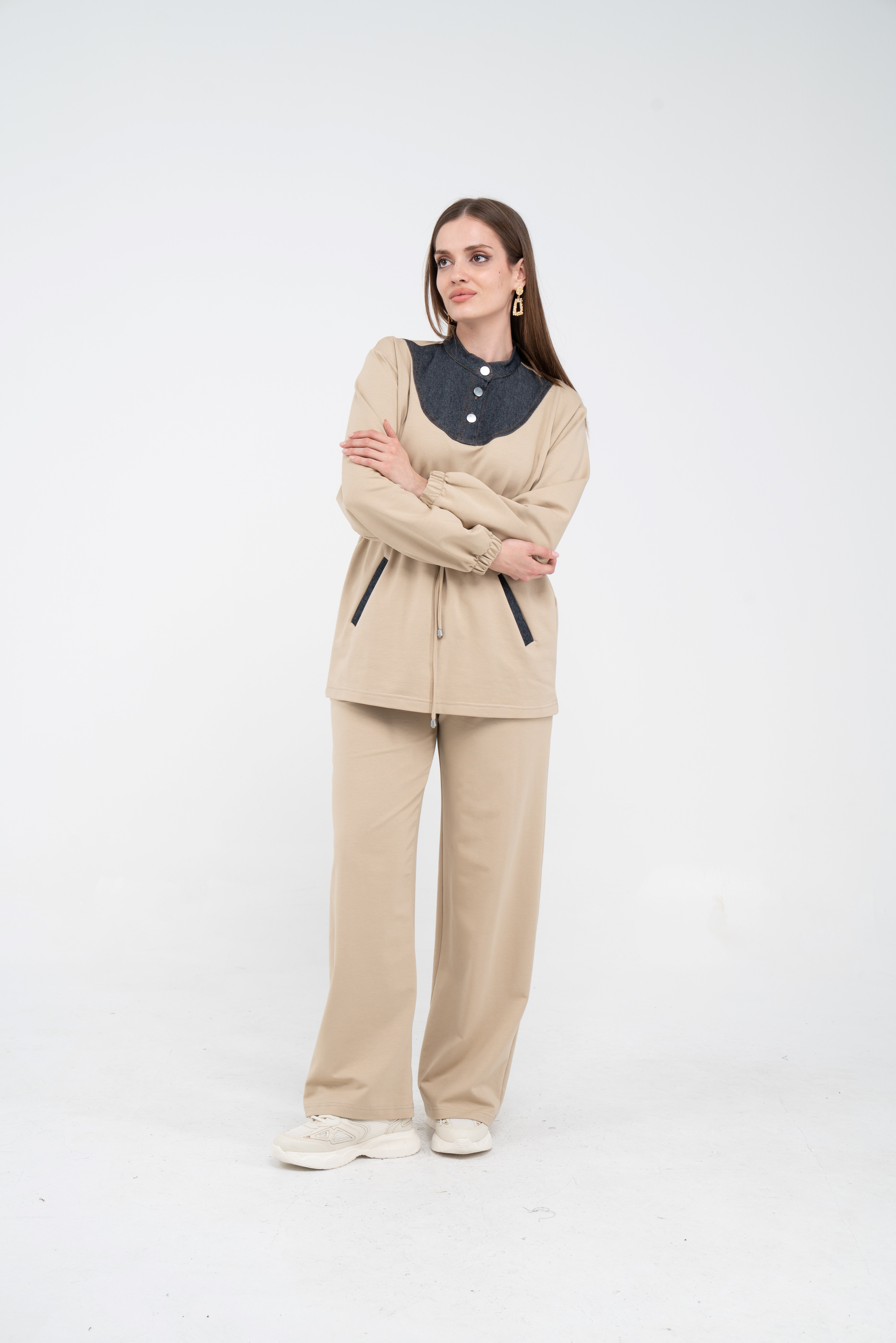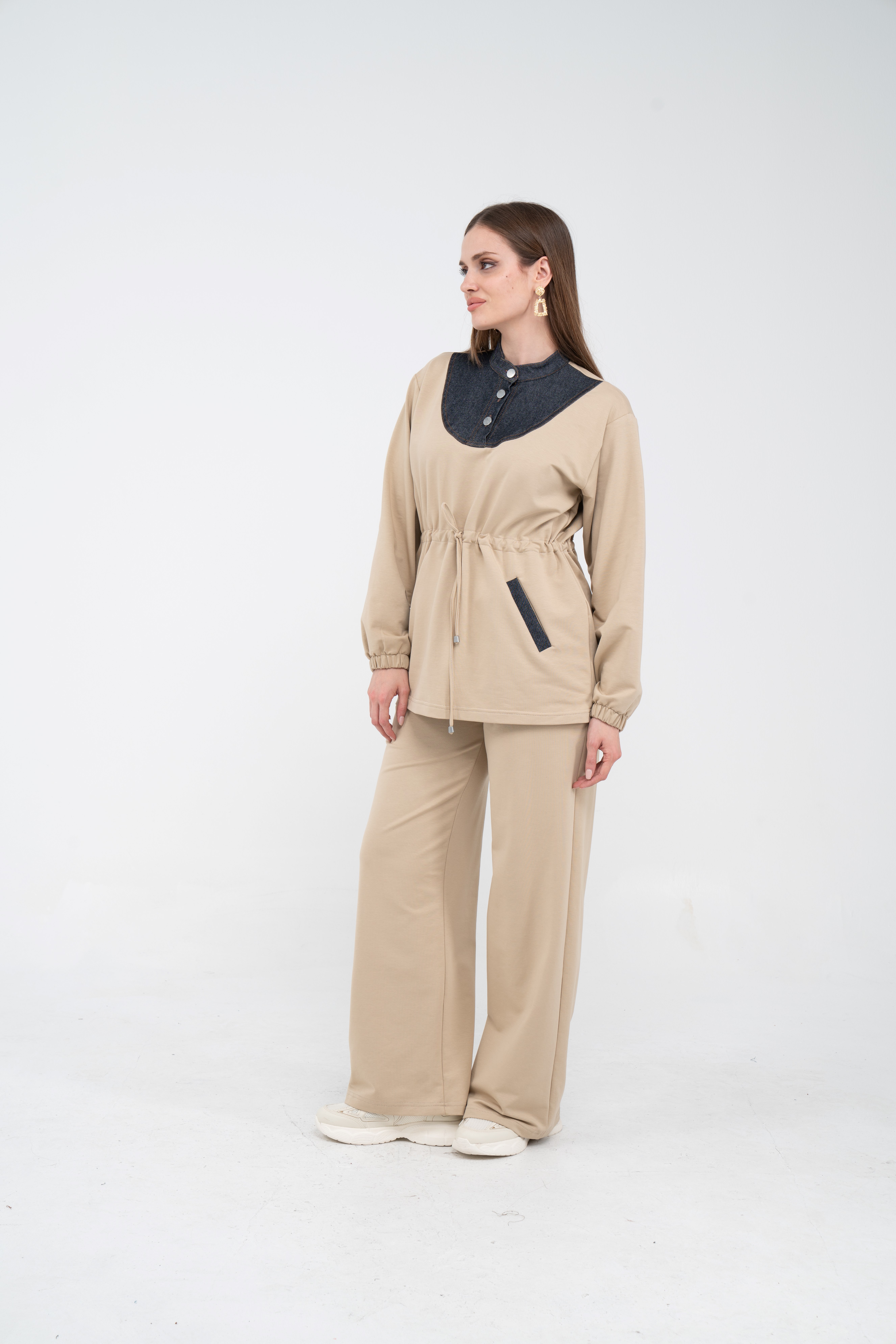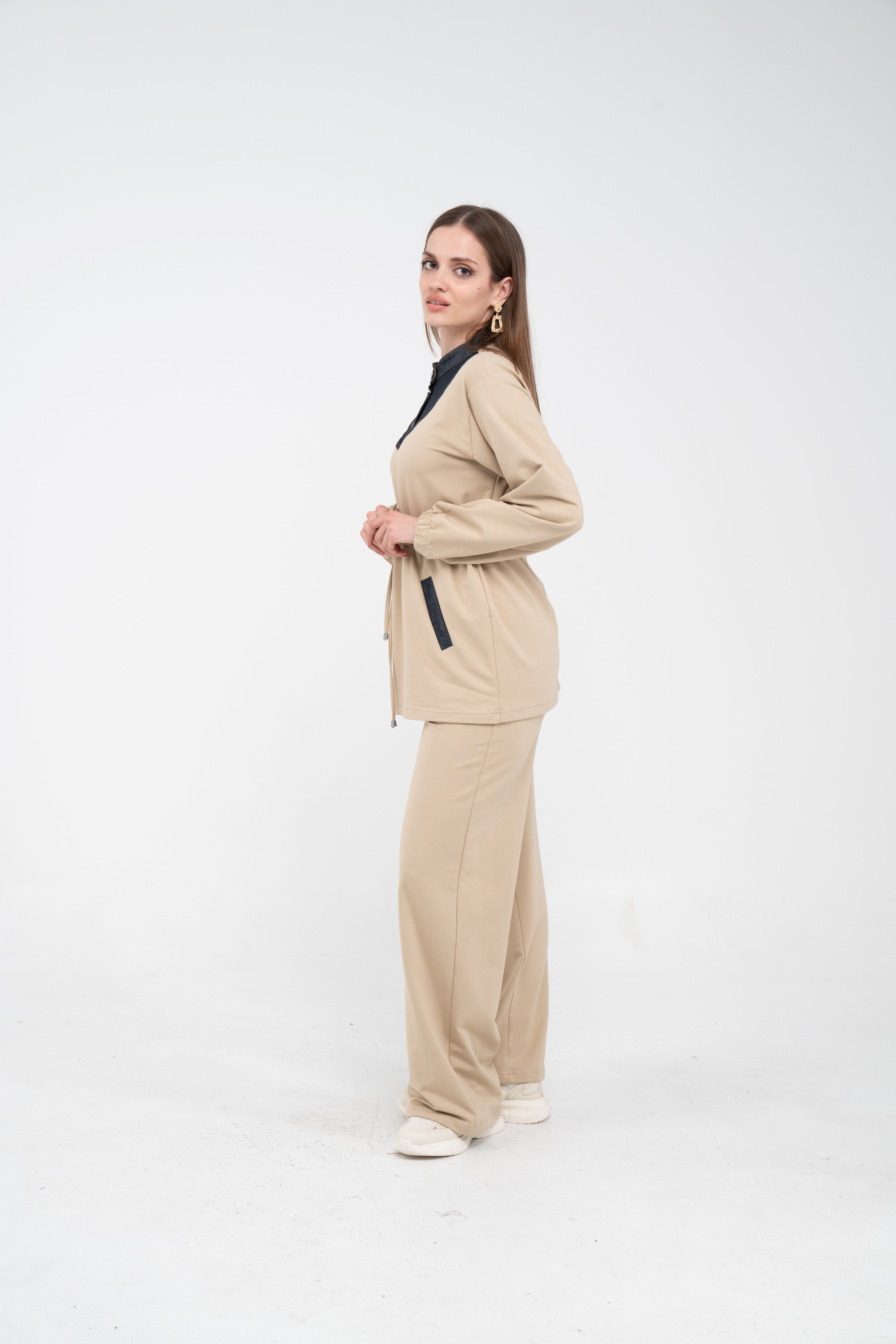 Esnek ve yumuşak dokulu kumaşı ile gün boyu konfor sunan takım, spor ayakkabılarla günlük kombinlere; çanta ve aksesuarlarla şehir stiline kolayca uyarlanabilir. Sezonun doğal tonlarını yansıtan bu takım, sade ama etkili bir tarz isteyenler için ideal bir seçenektir.