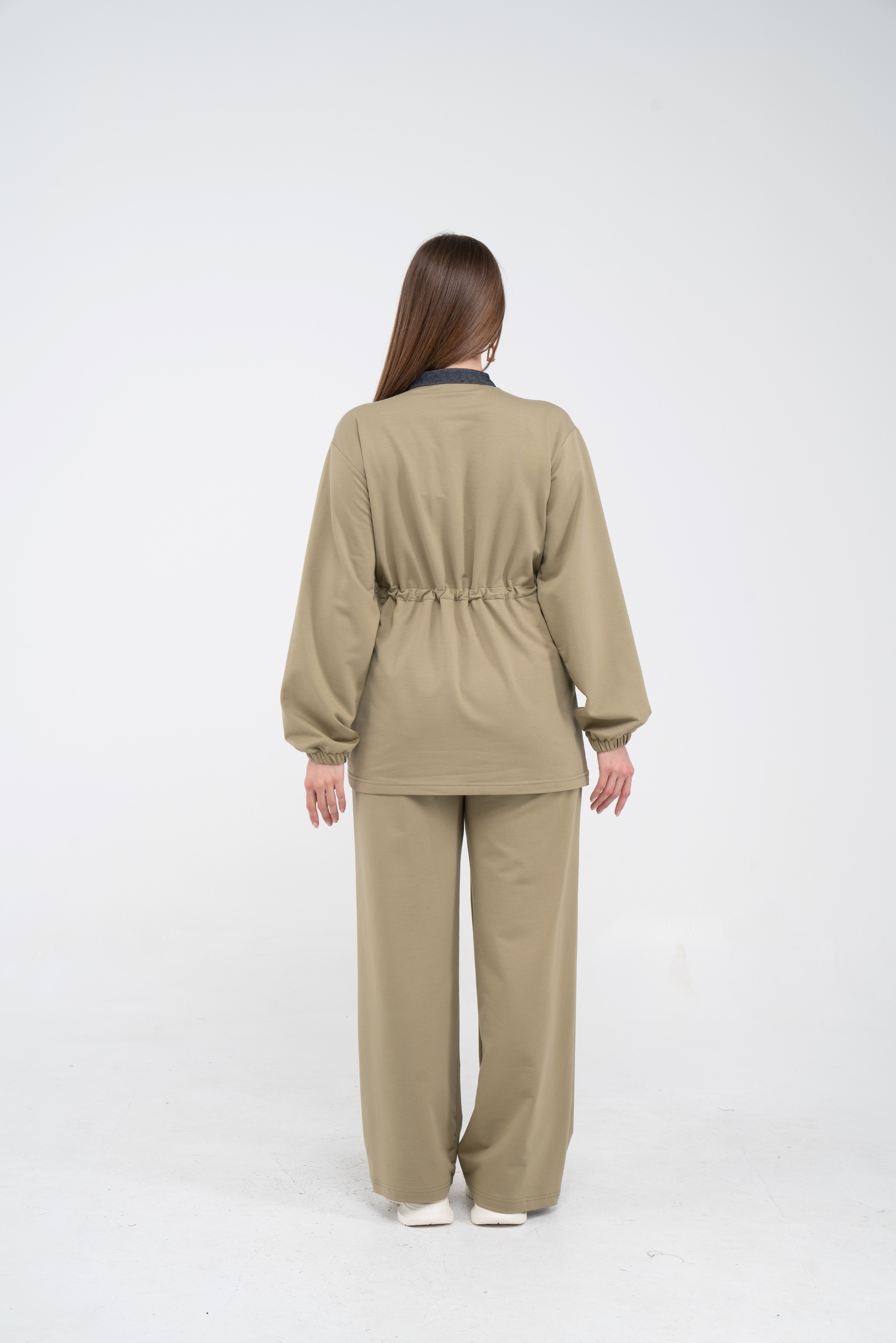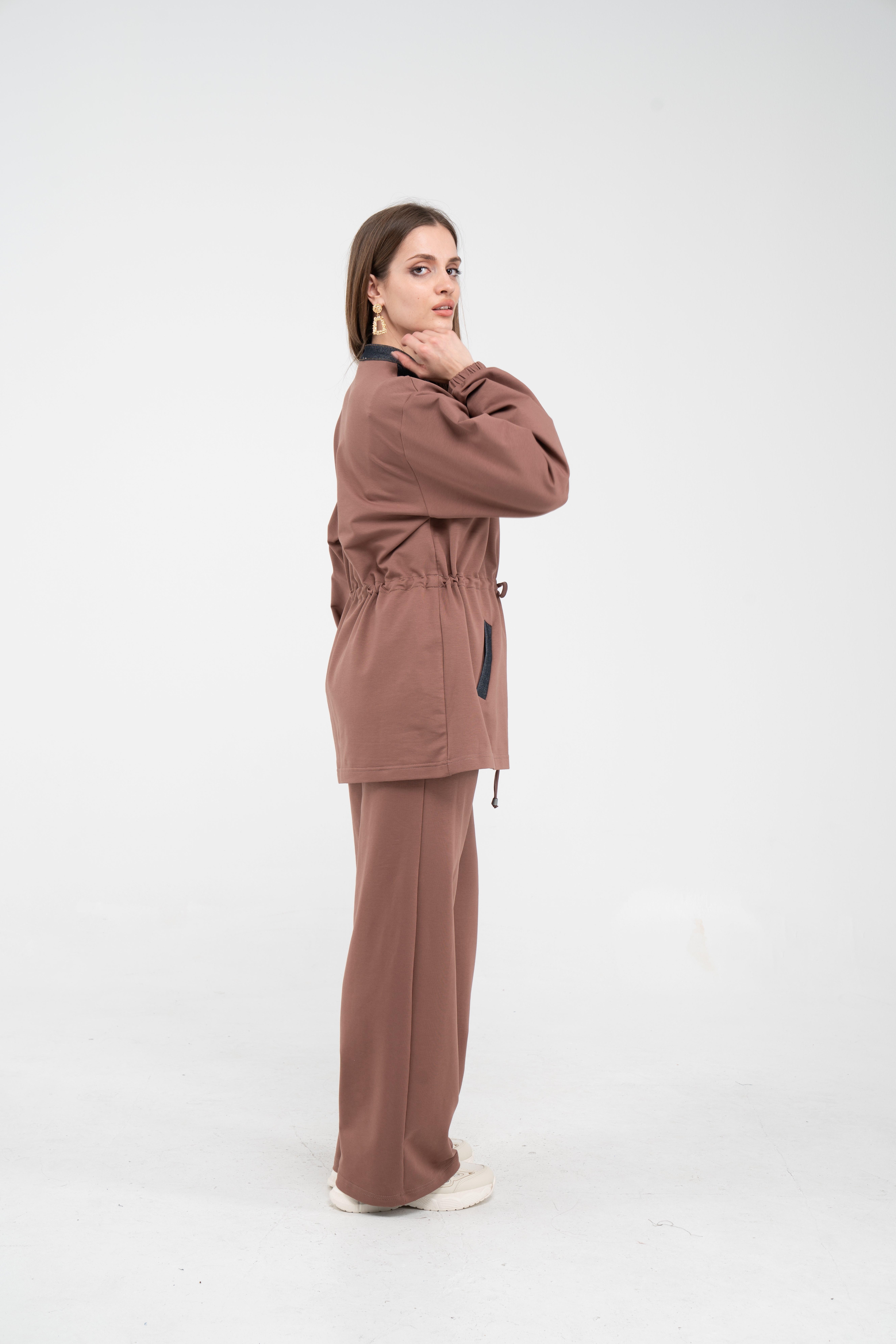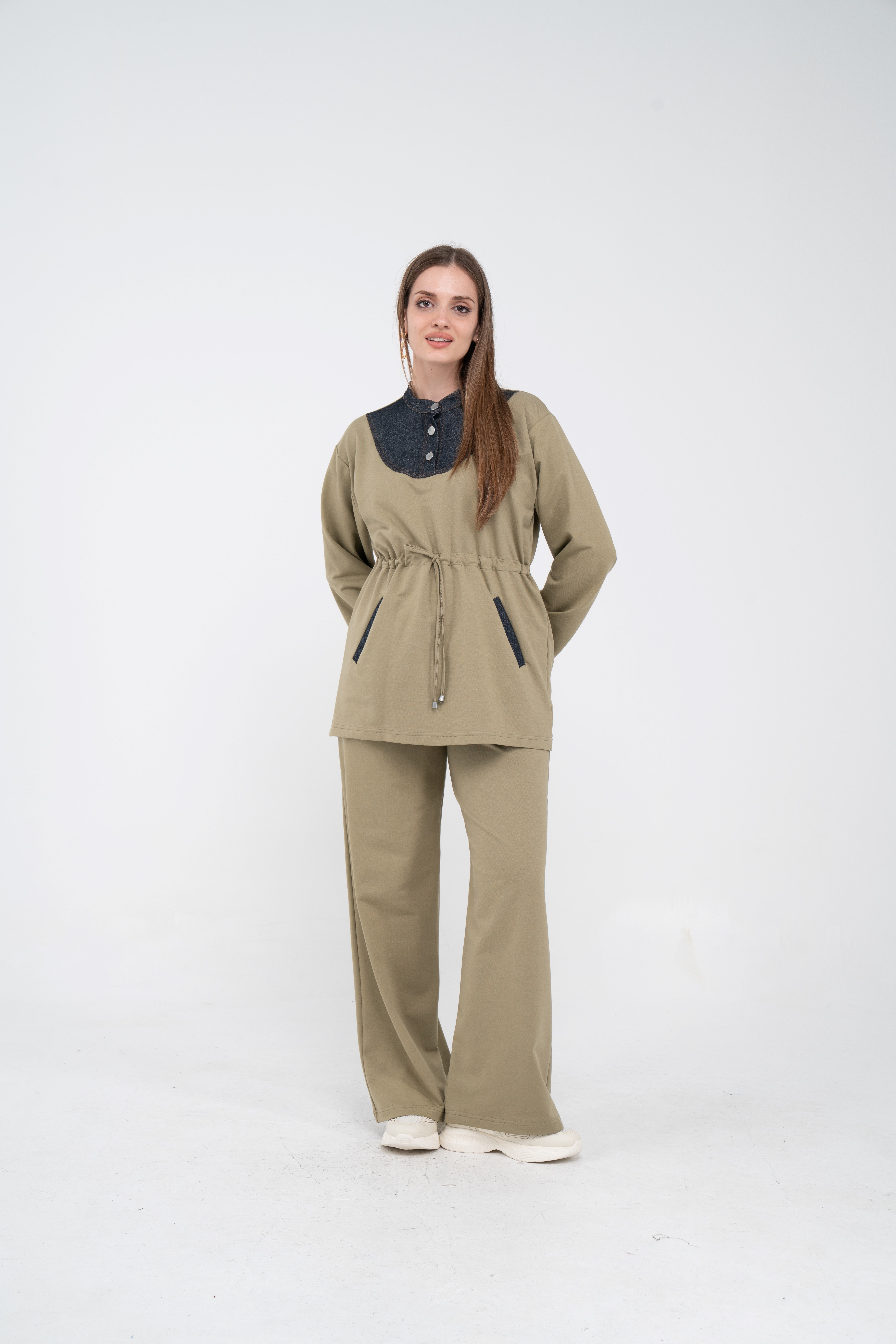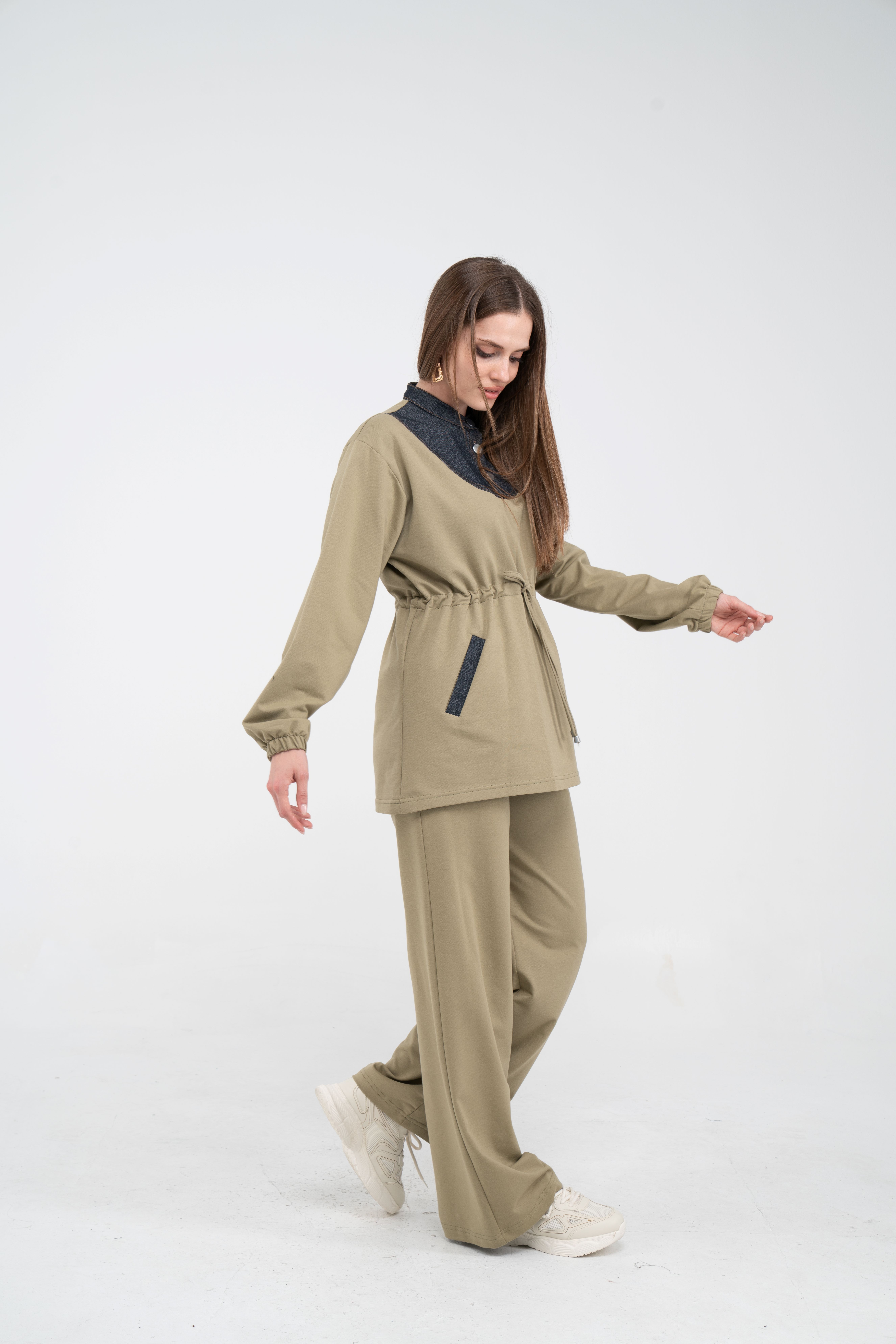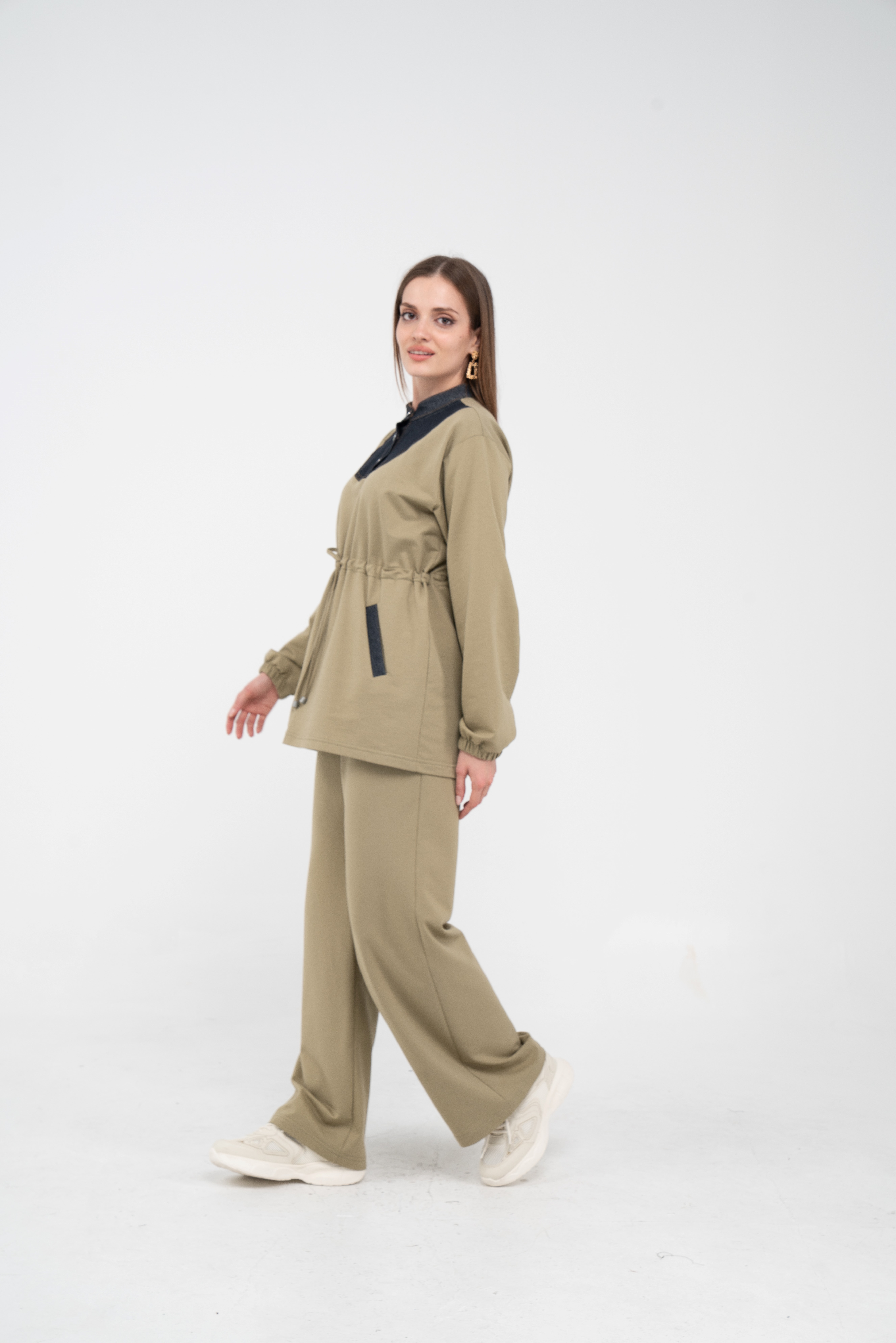 Esnek ve yumuşak dokulu kumaşı ile gün boyu konfor sunan takım, spor ayakkabılarla günlük kombinlere; çanta ve aksesuarlarla şehir stiline kolayca uyarlanabilir. Sezonun doğal tonlarını yansıtan bu takım, sade ama etkili bir tarz isteyenler için ideal bir seçenektir.