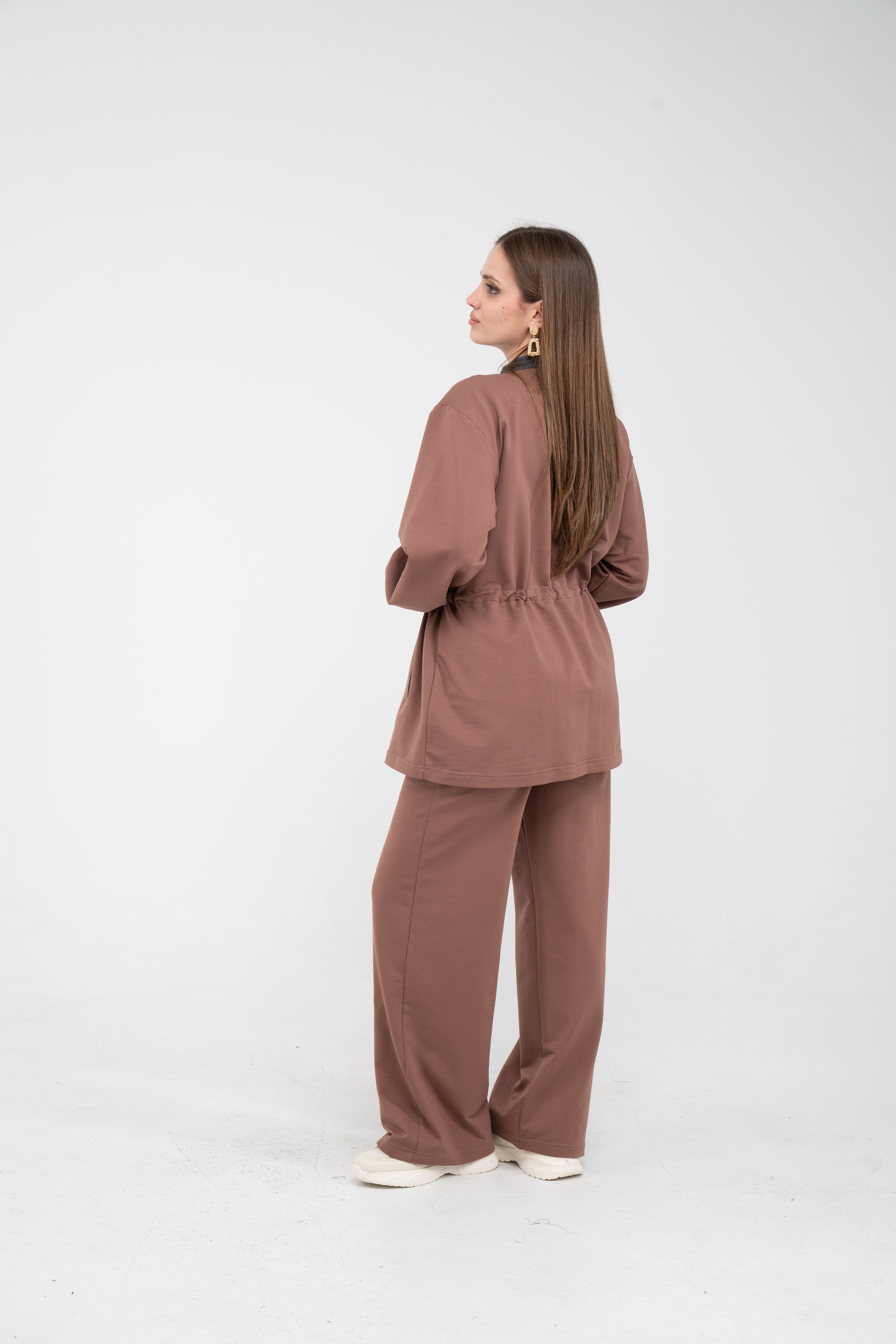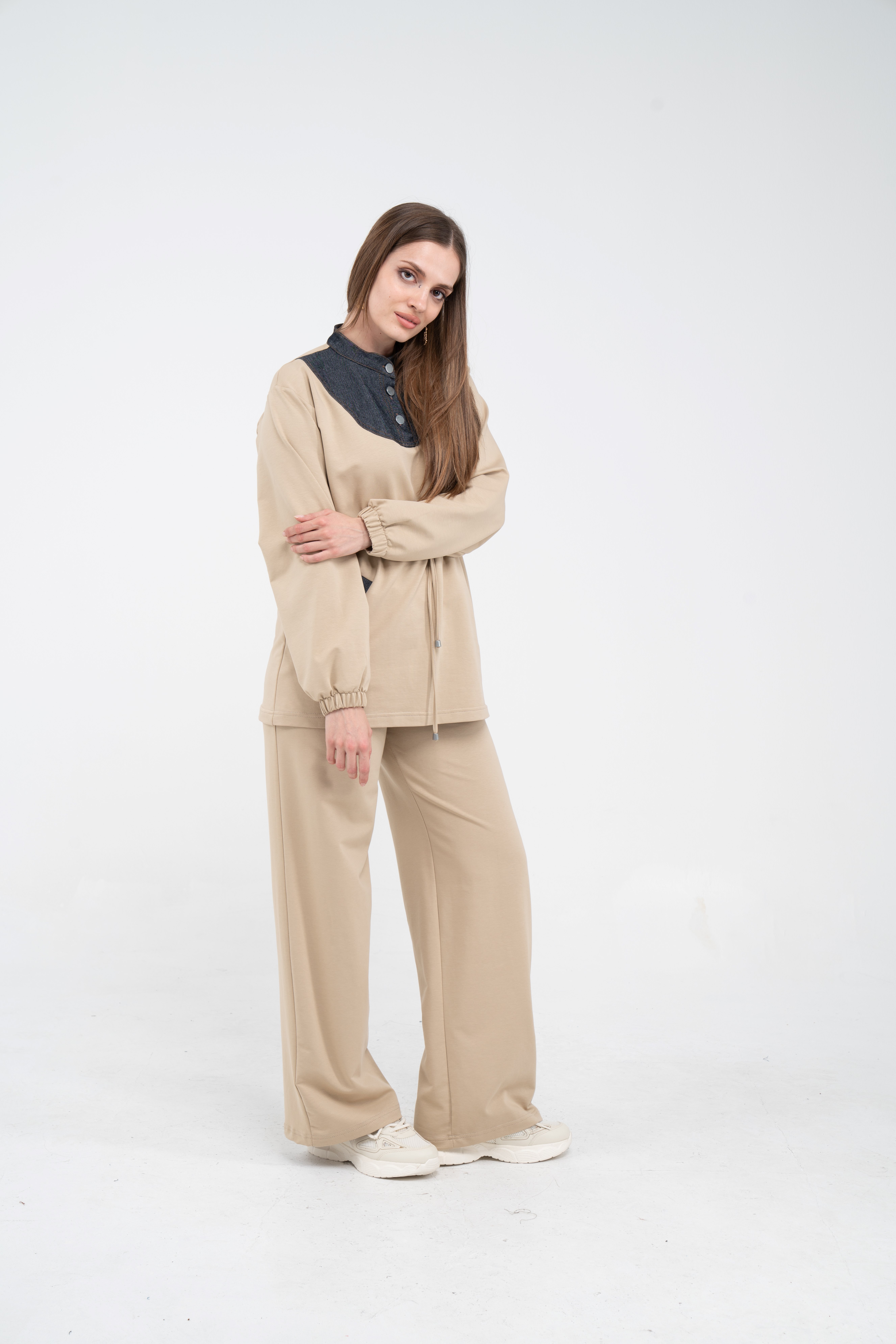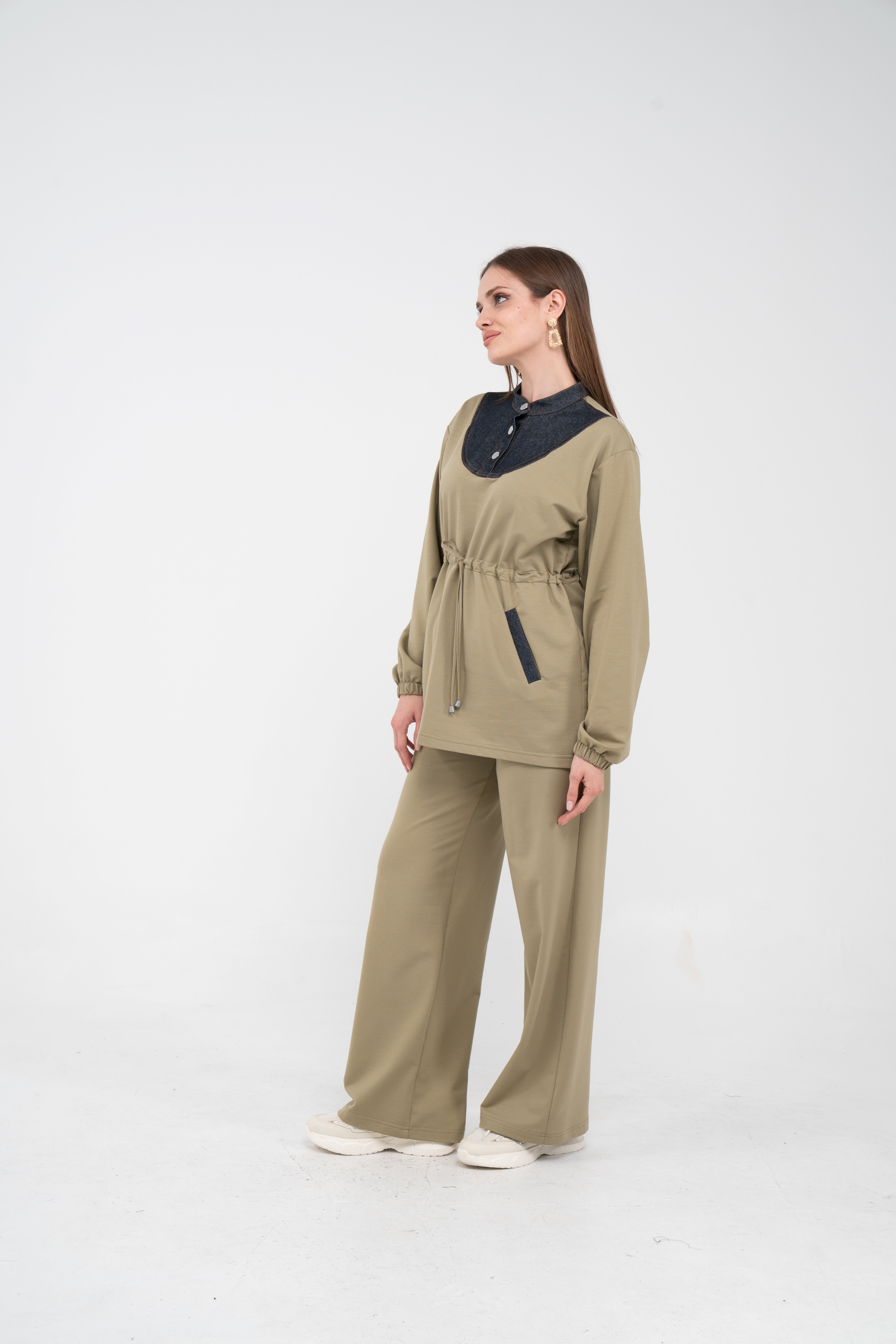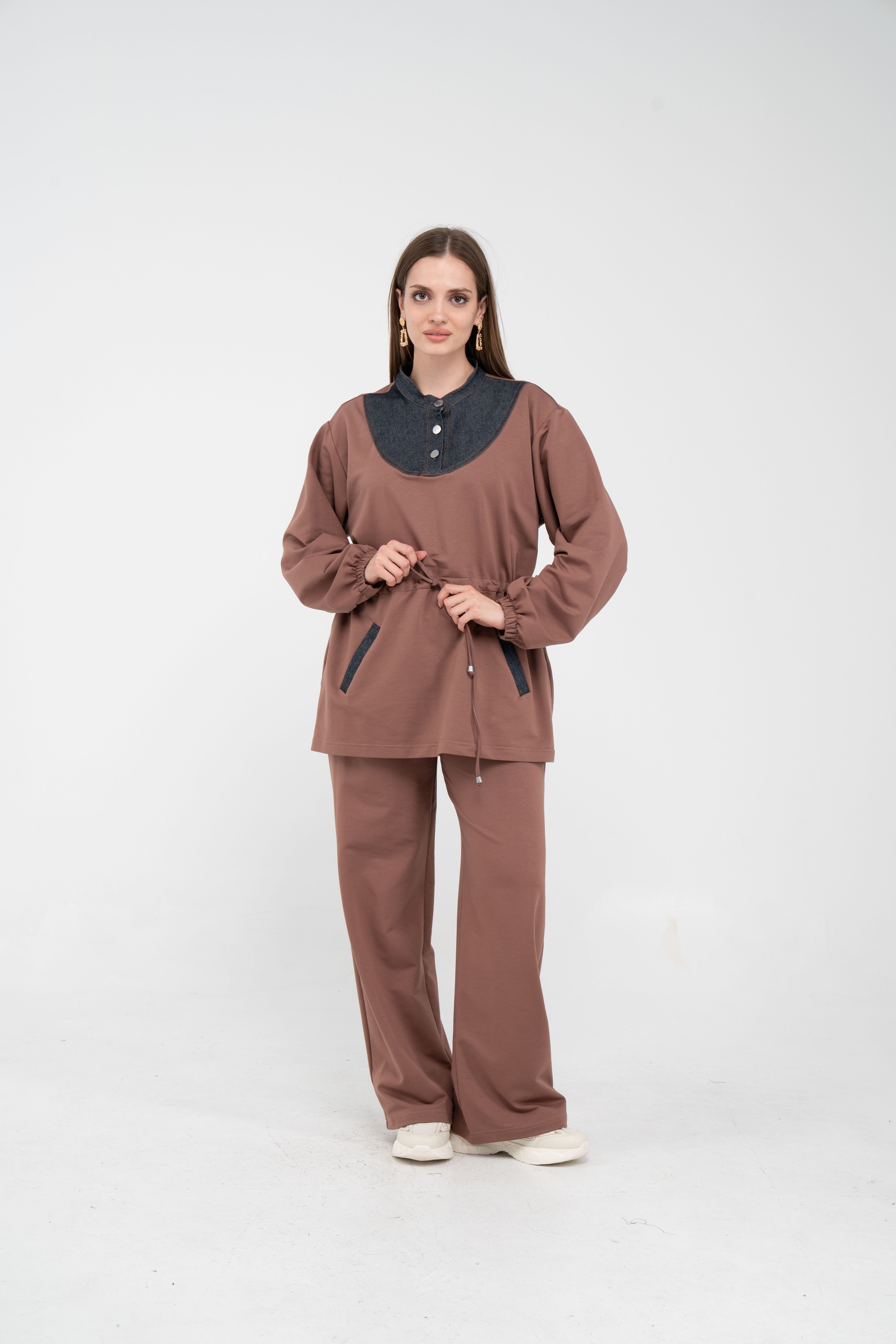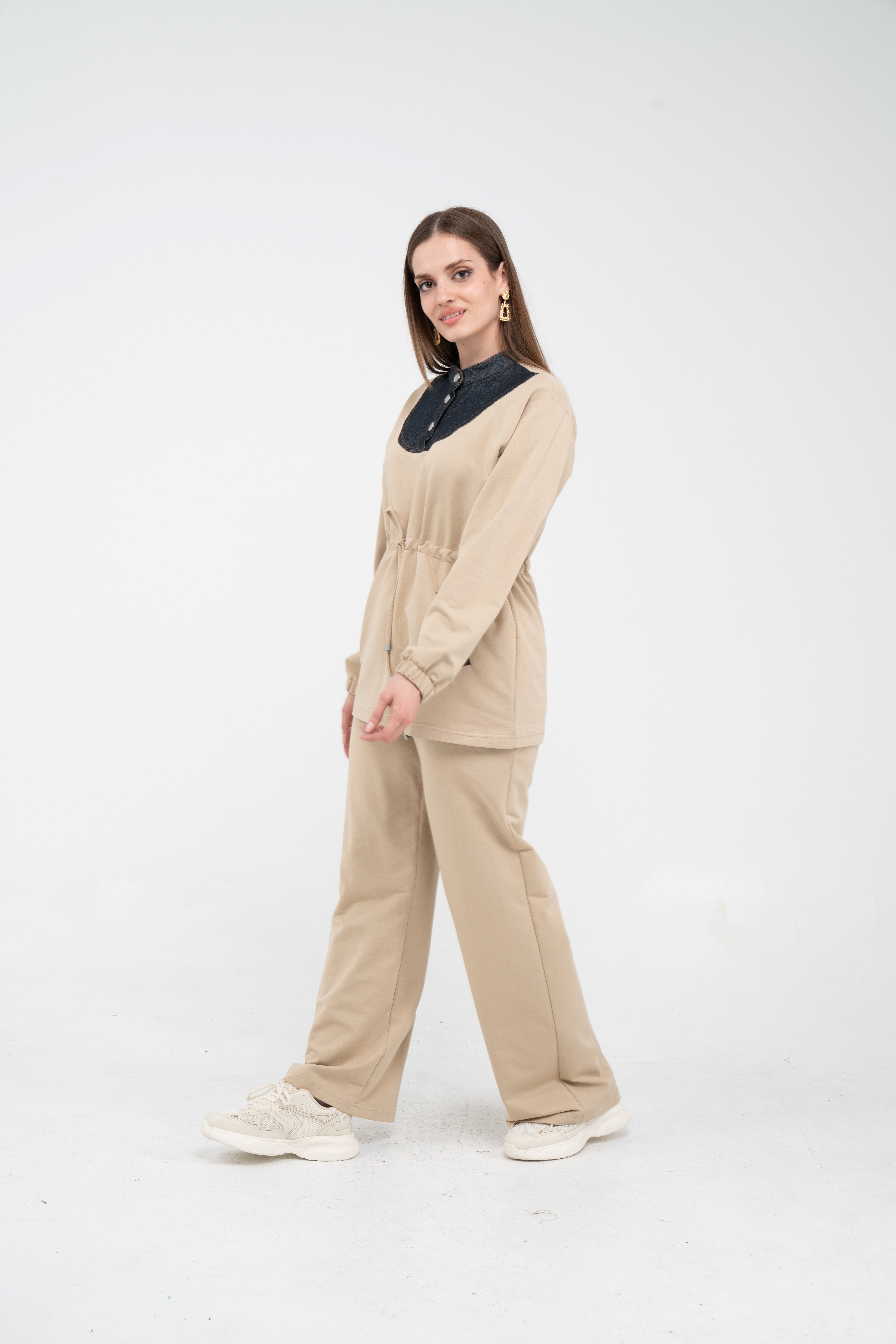 Esnek ve yumuşak dokulu kumaşı ile gün boyu konfor sunan takım, spor ayakkabılarla günlük kombinlere; çanta ve aksesuarlarla şehir stiline kolayca uyarlanabilir. Sezonun doğal tonlarını yansıtan bu takım, sade ama etkili bir tarz isteyenler için ideal bir seçenektir.