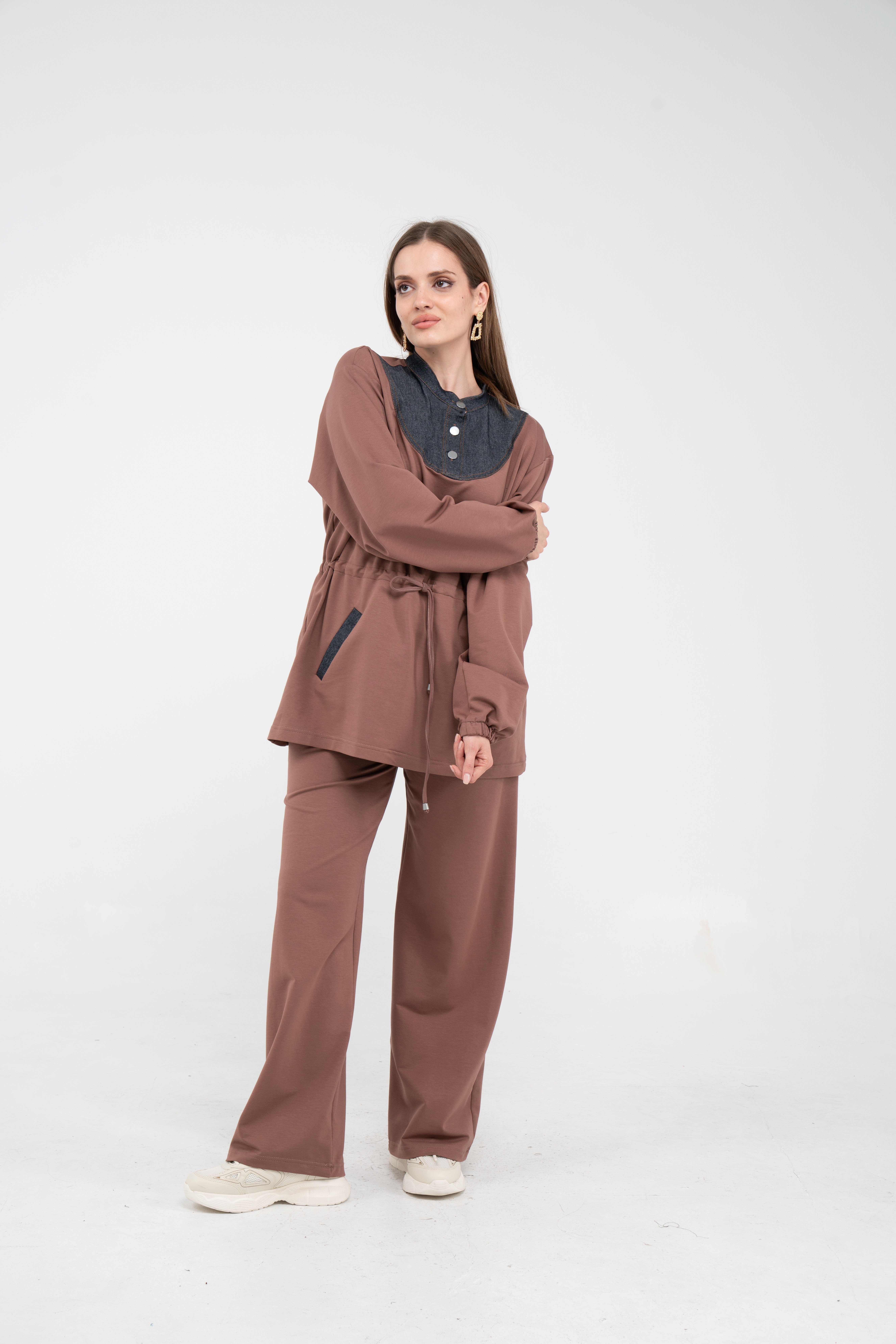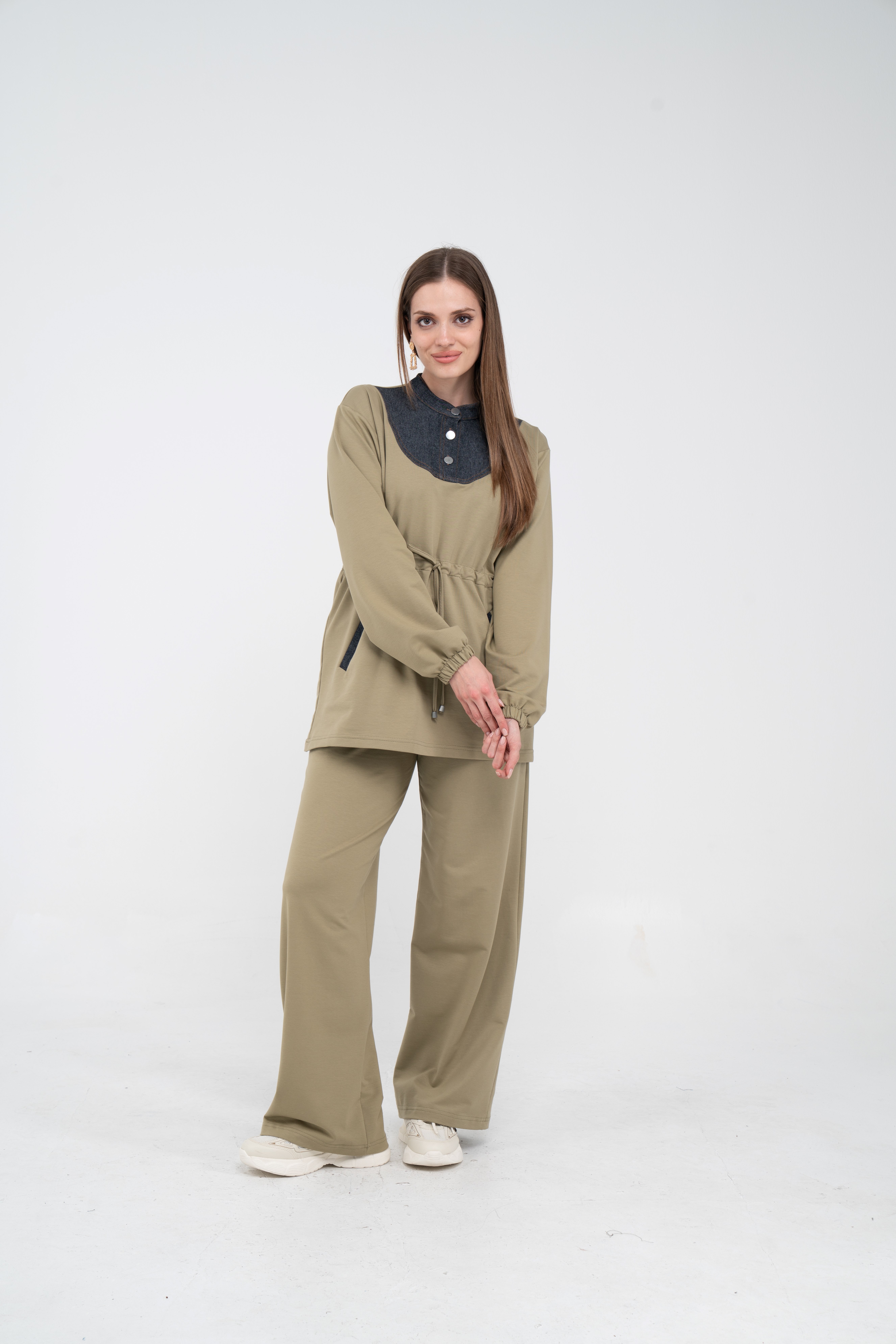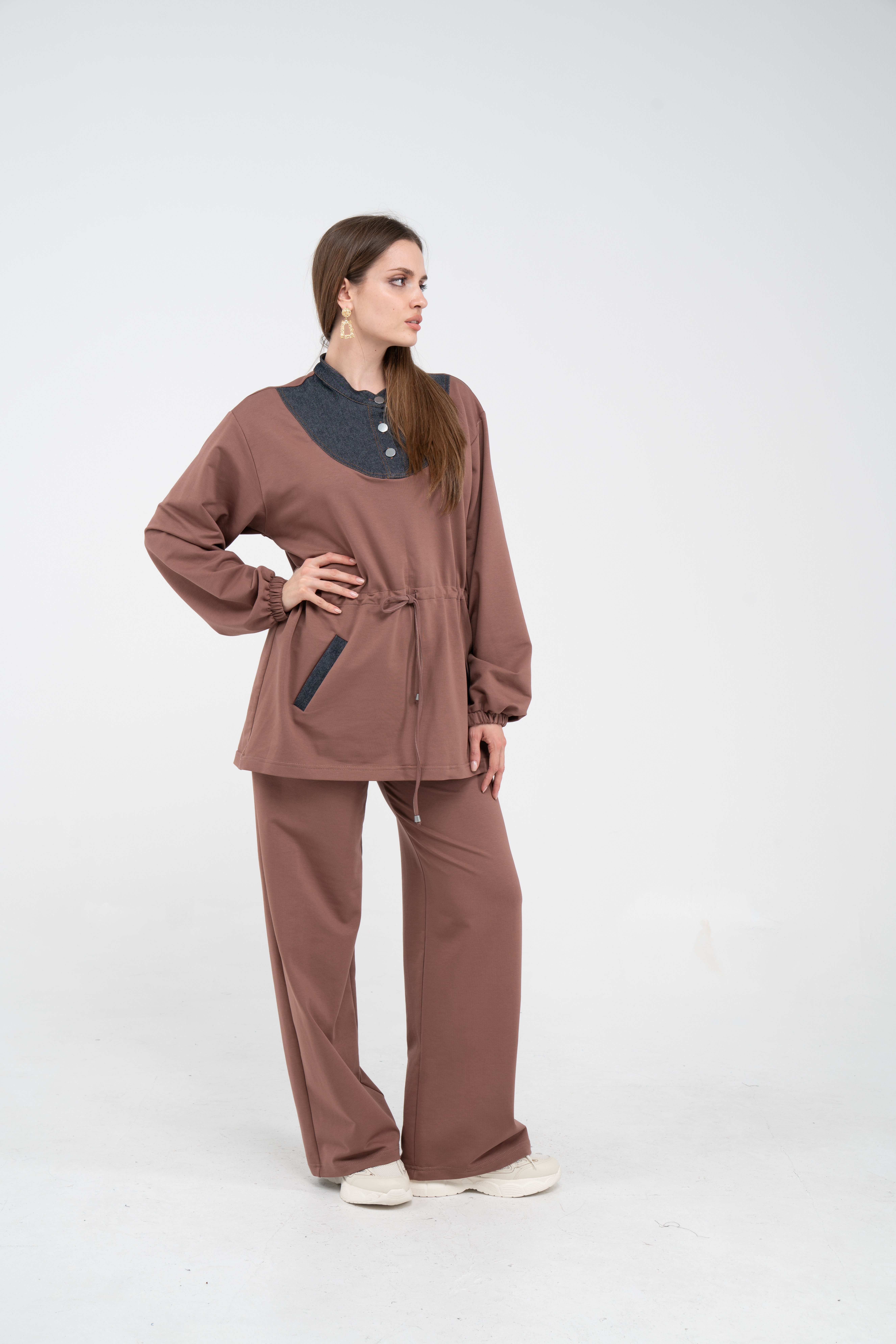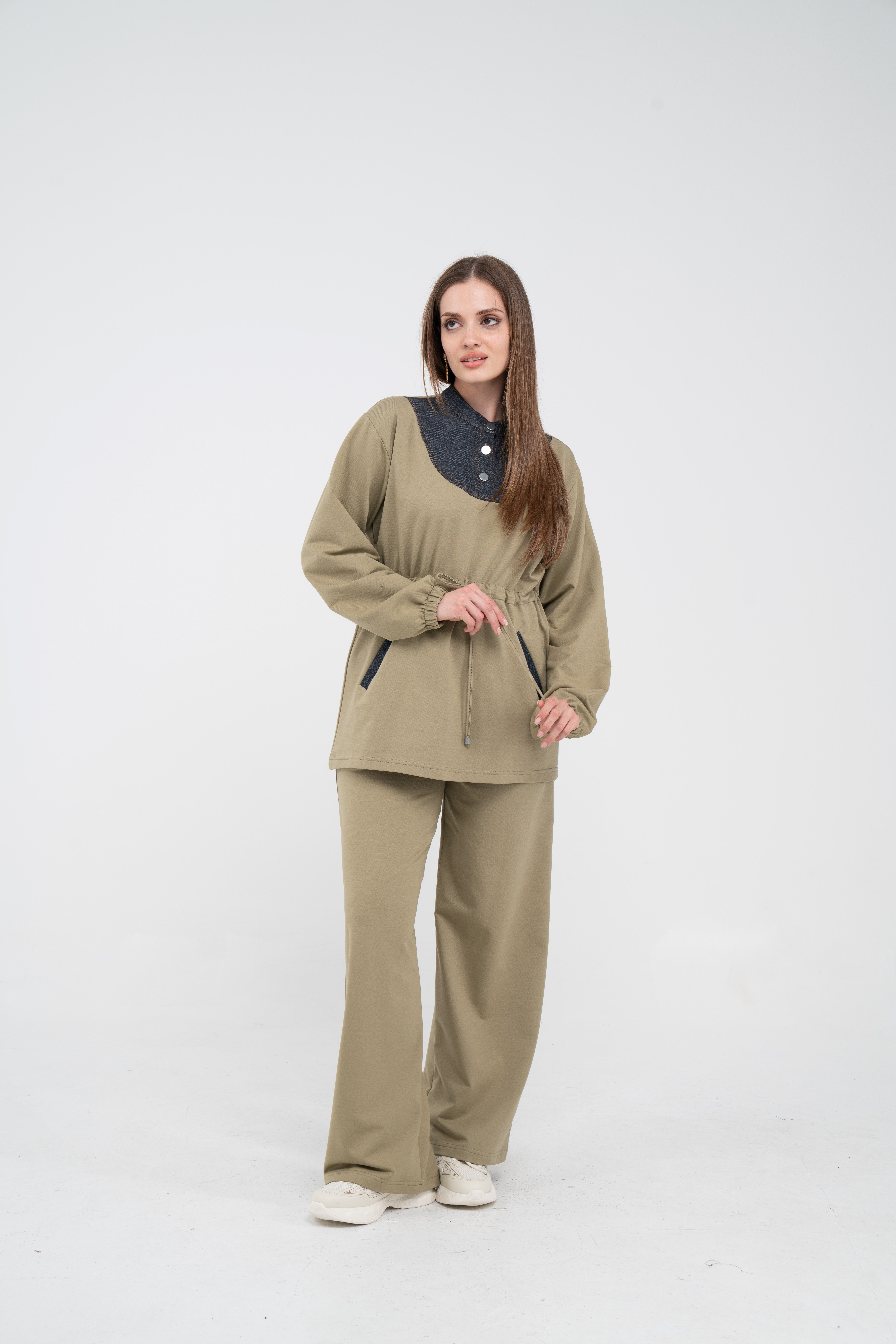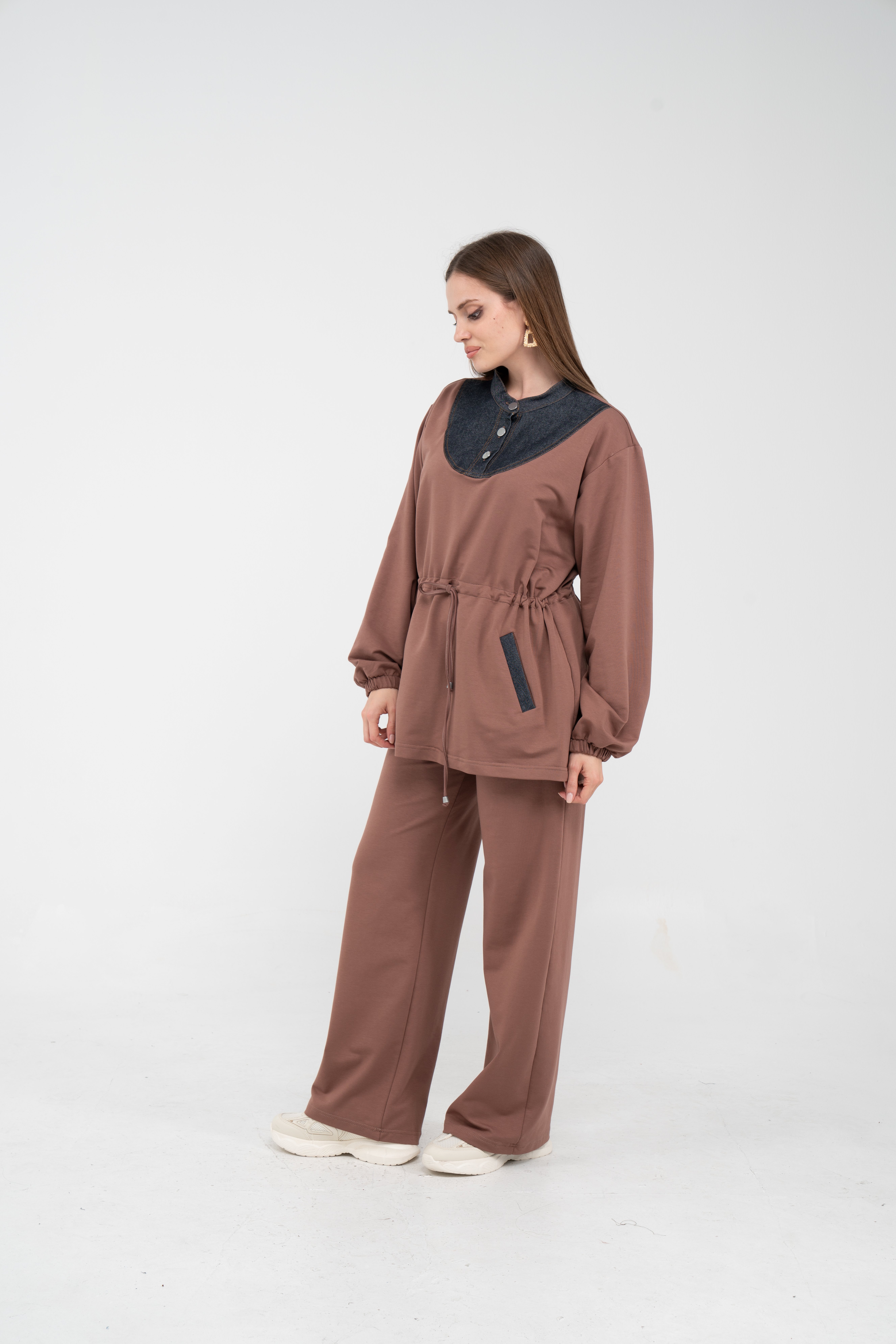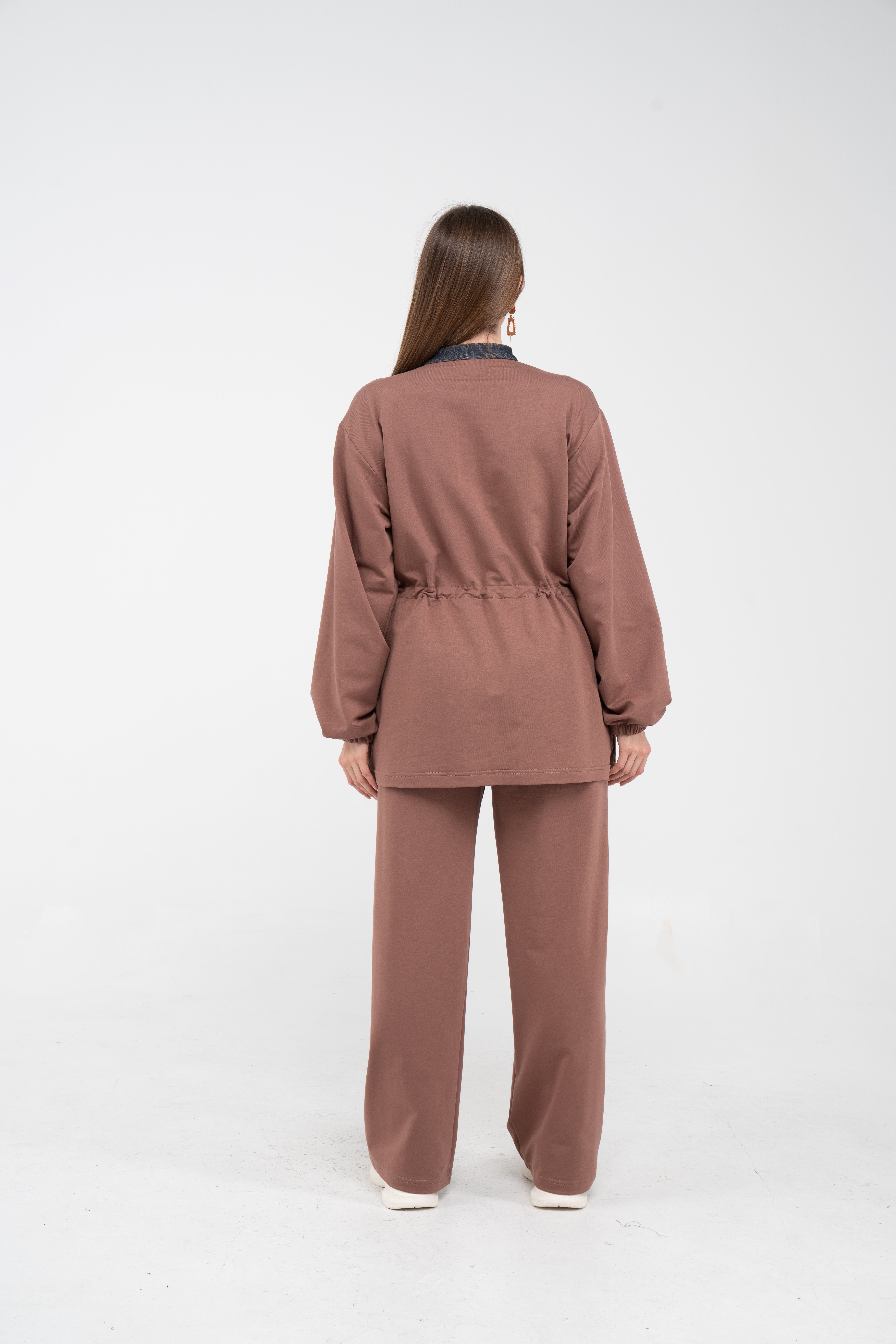 Esnek ve yumuşak dokulu kumaşı ile gün boyu konfor sunan takım, spor ayakkabılarla günlük kombinlere; çanta ve aksesuarlarla şehir stiline kolayca uyarlanabilir. Sezonun doğal tonlarını yansıtan bu takım, sade ama etkili bir tarz isteyenler için ideal bir seçenektir.